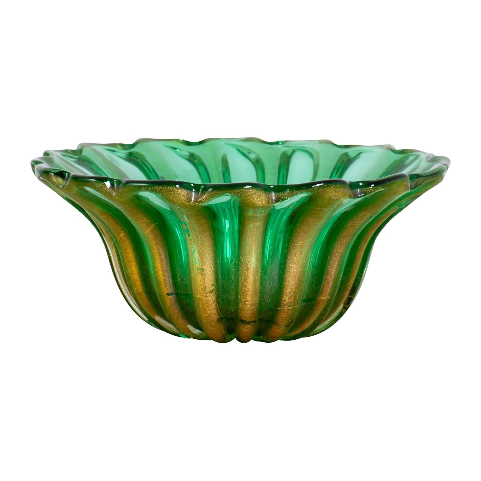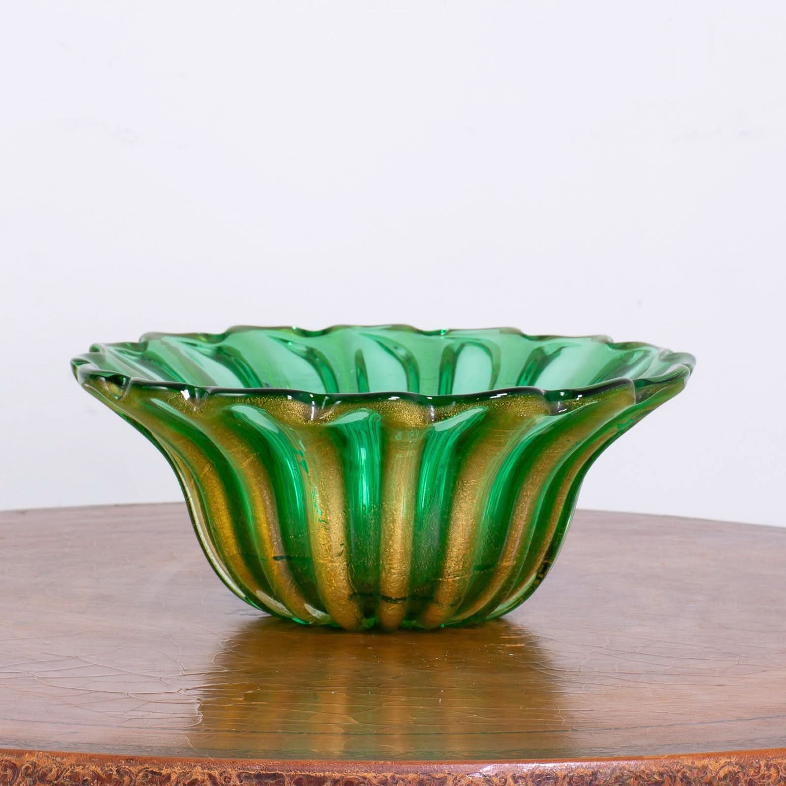 A large Green Murano Ribbed Bowl with aventurine inclusion