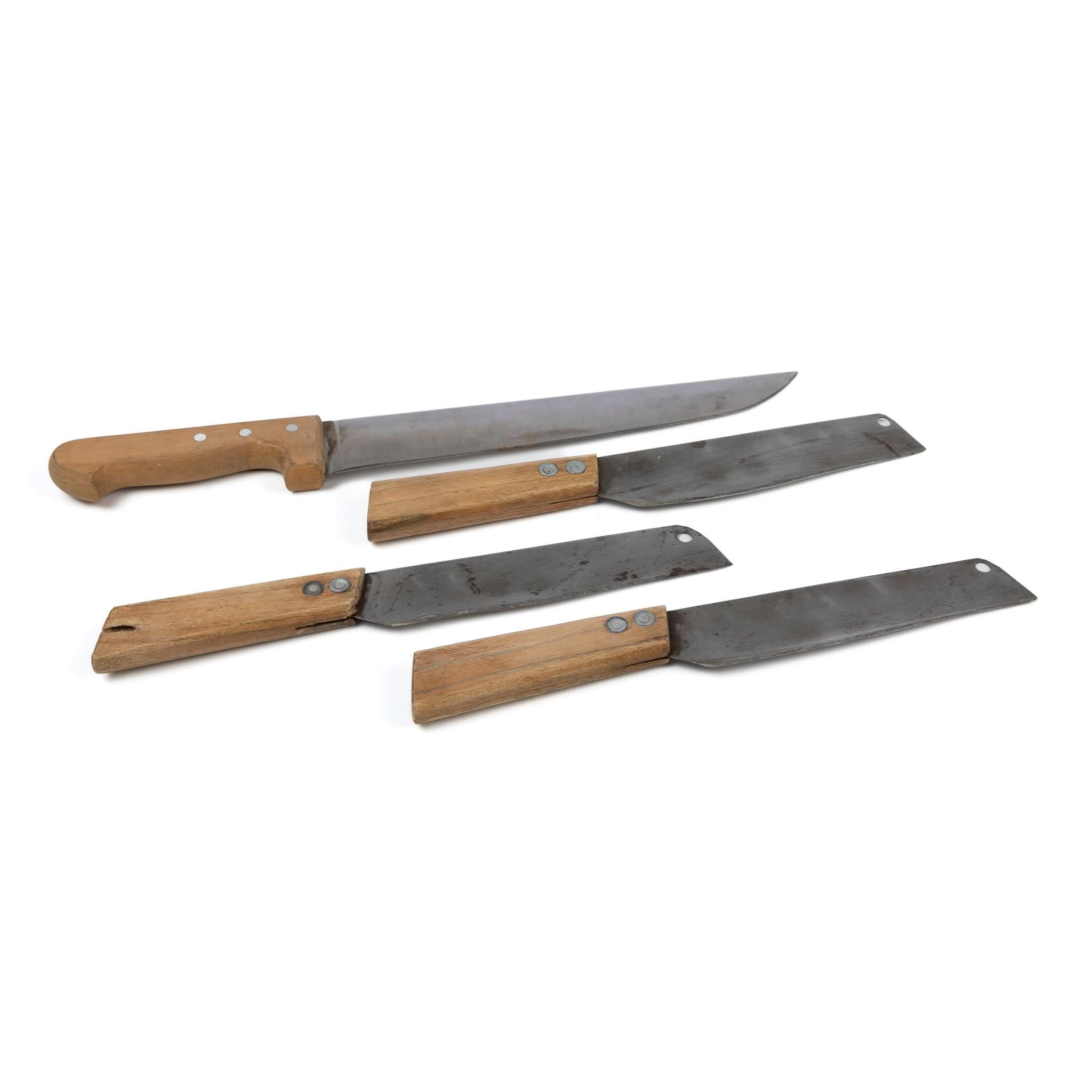 An beautiful set of 4 vintage French butchery knives with timber handles from the French Alps