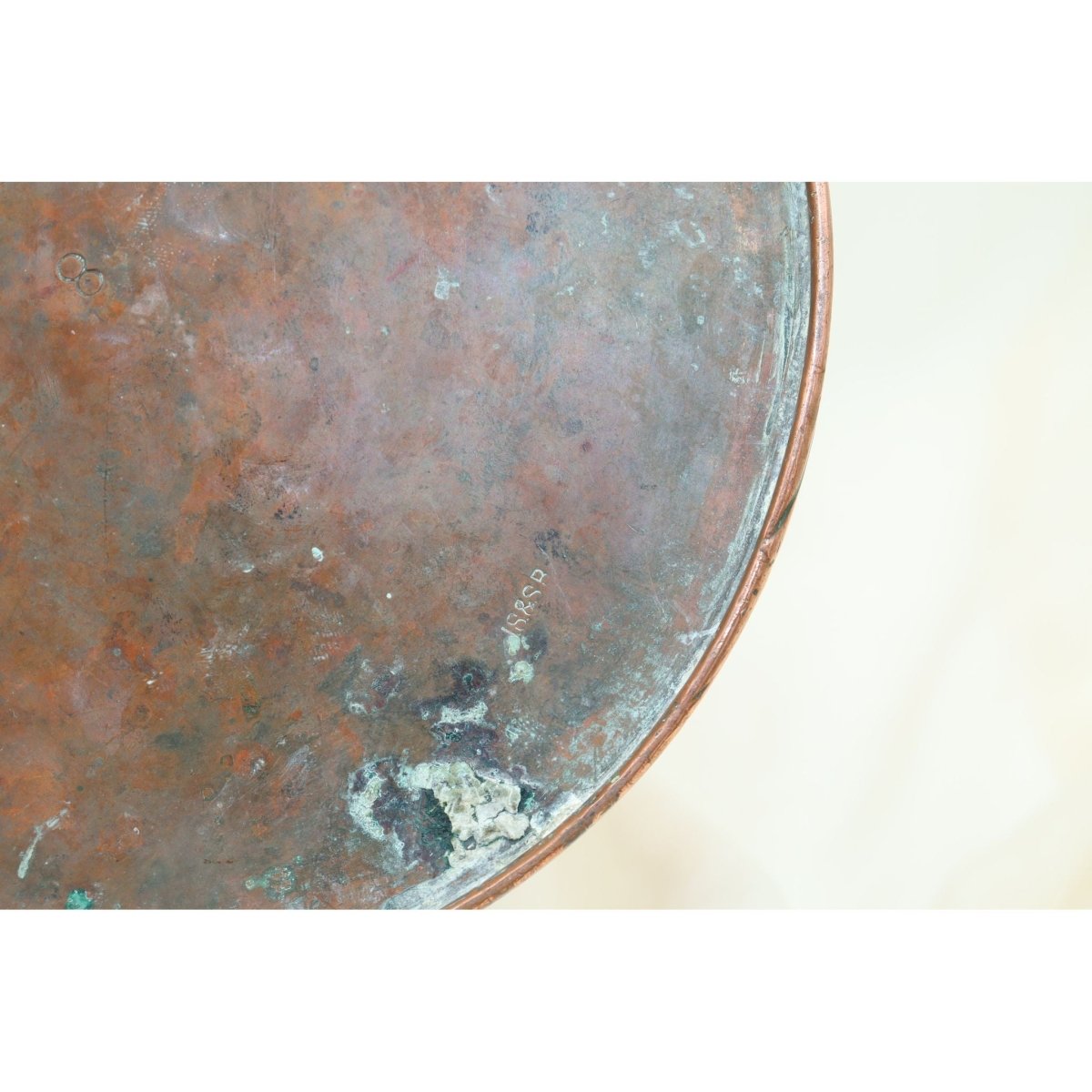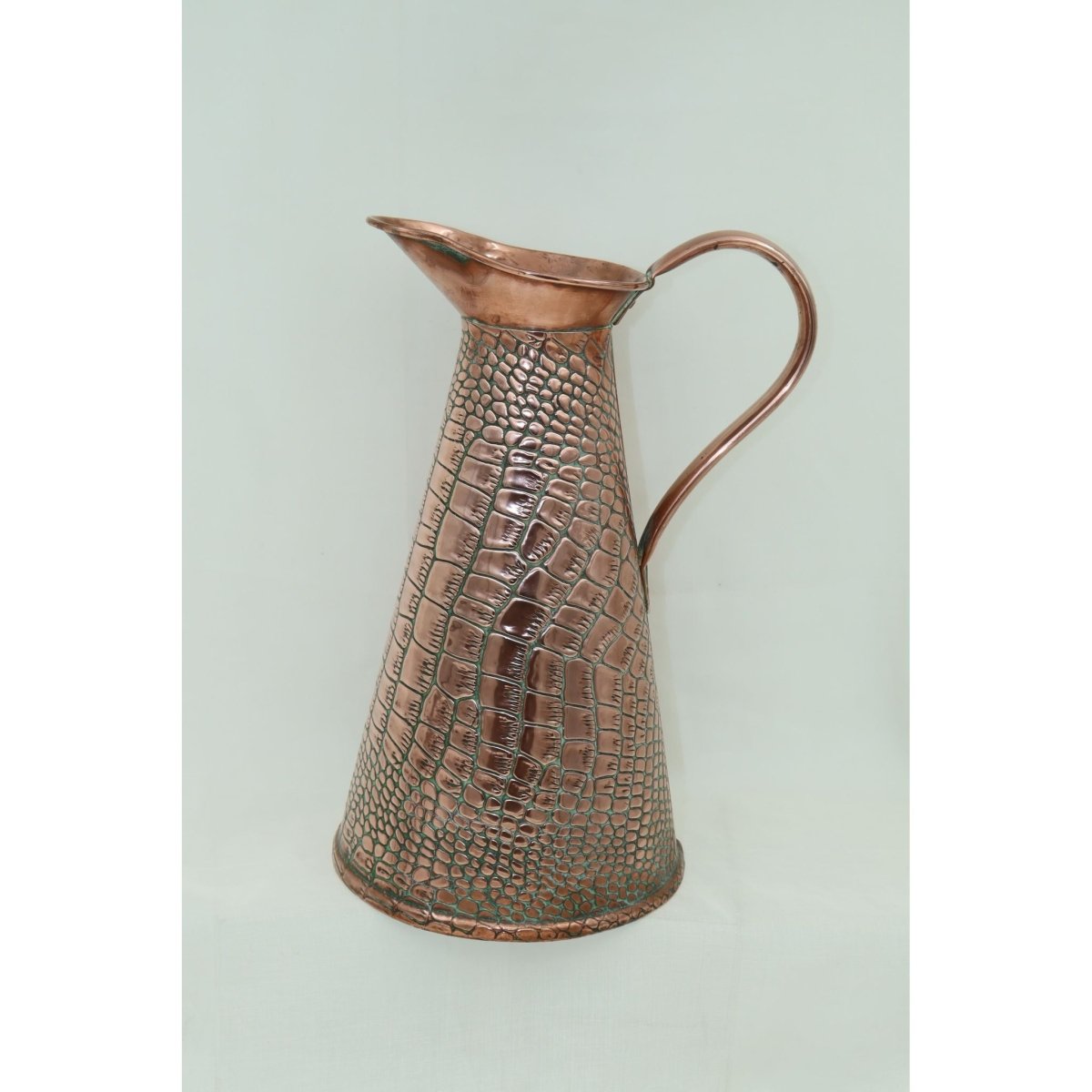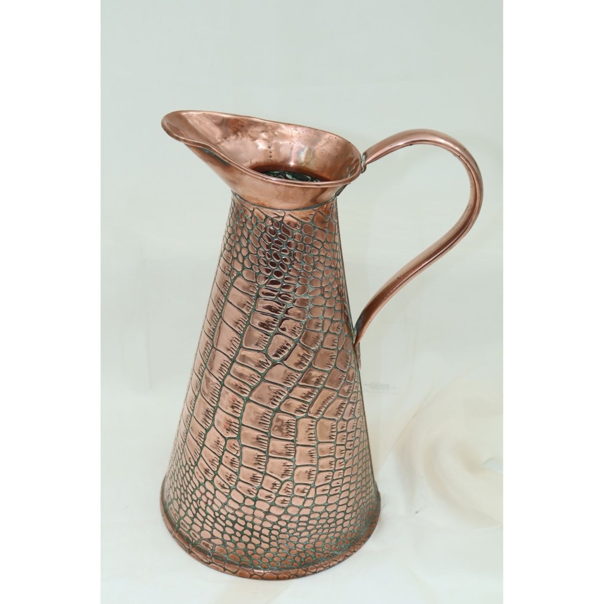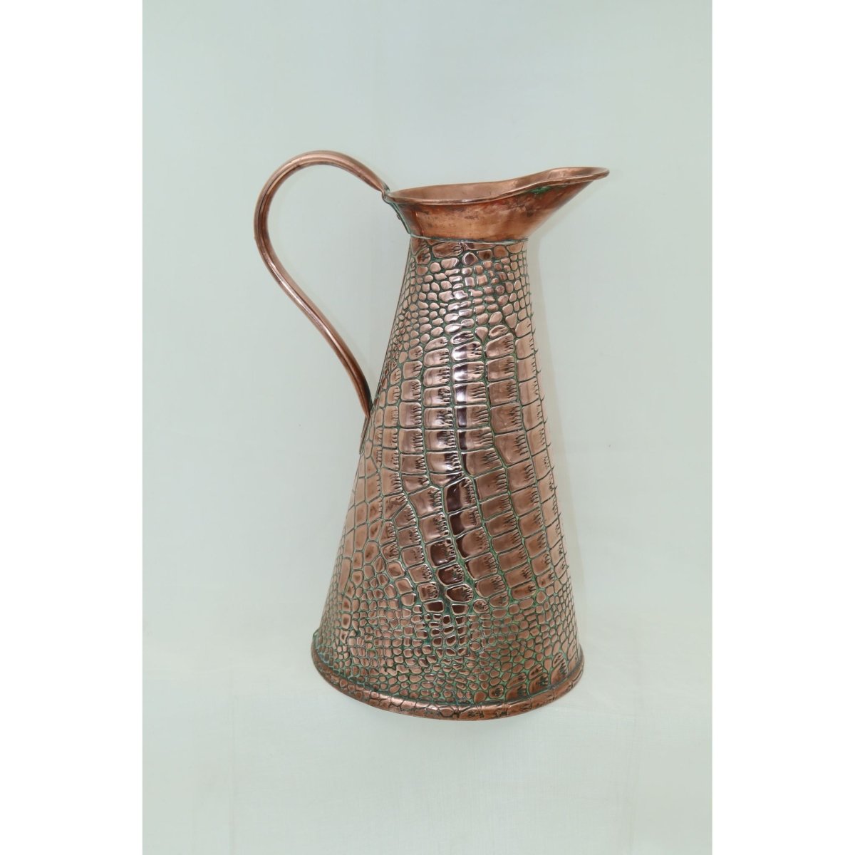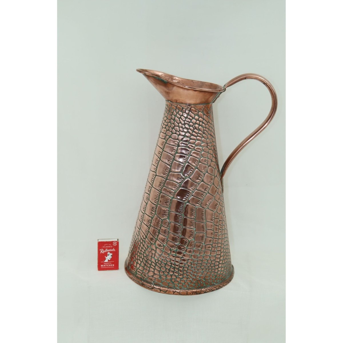 This very decorative large copper jug features a pressed crocodile skin effect by way of decoration. On the base are stamped the number 8, indicating that it holds 8 pints, and the letters JS&S B. It was made by J. Sankey and Sons of Bilston, near Wolverhampton in the West Midlands of England. It stands 355 mm (14 inches) high, with a diameter of 197 mm (7.75 inches) at the base. It is in very good condition, but sadly it doesn't hold water. It dates from around 1900