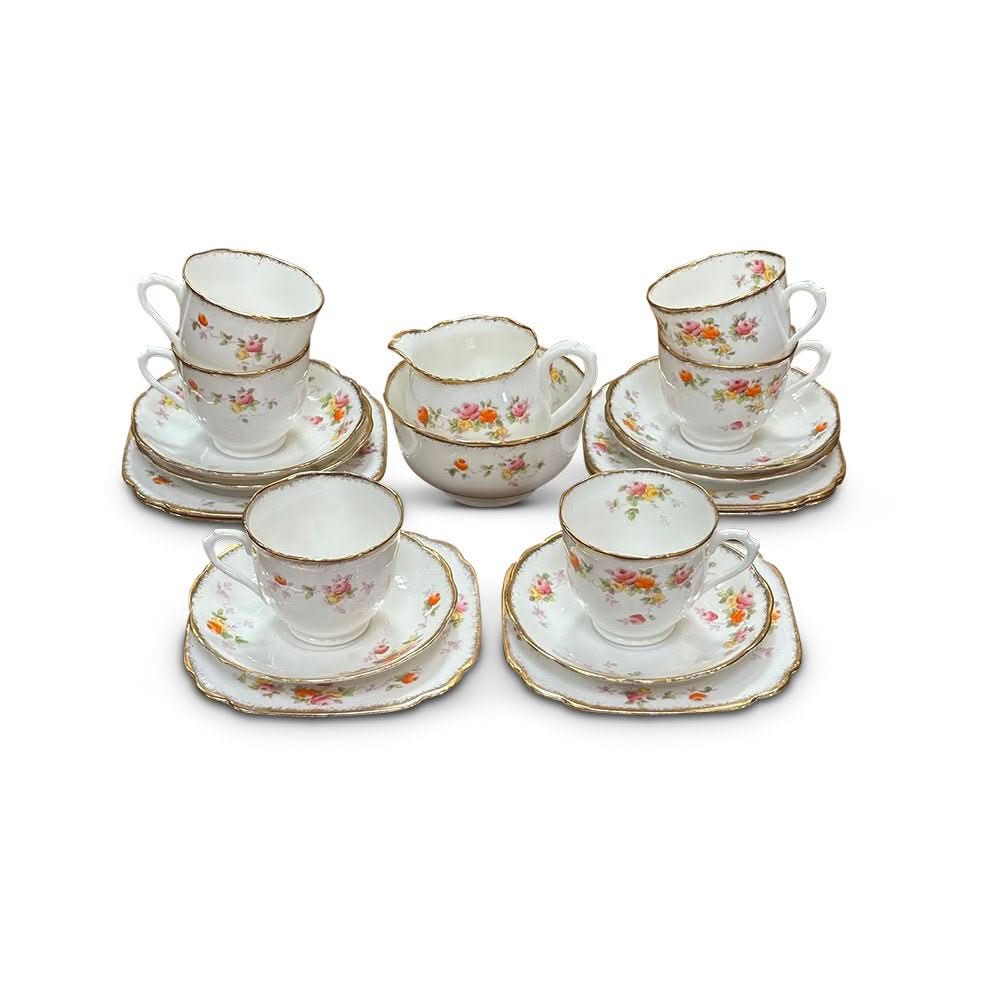Includes:  6 cups, 6 saucers, 6 plates, milk jug and sugar bowl.