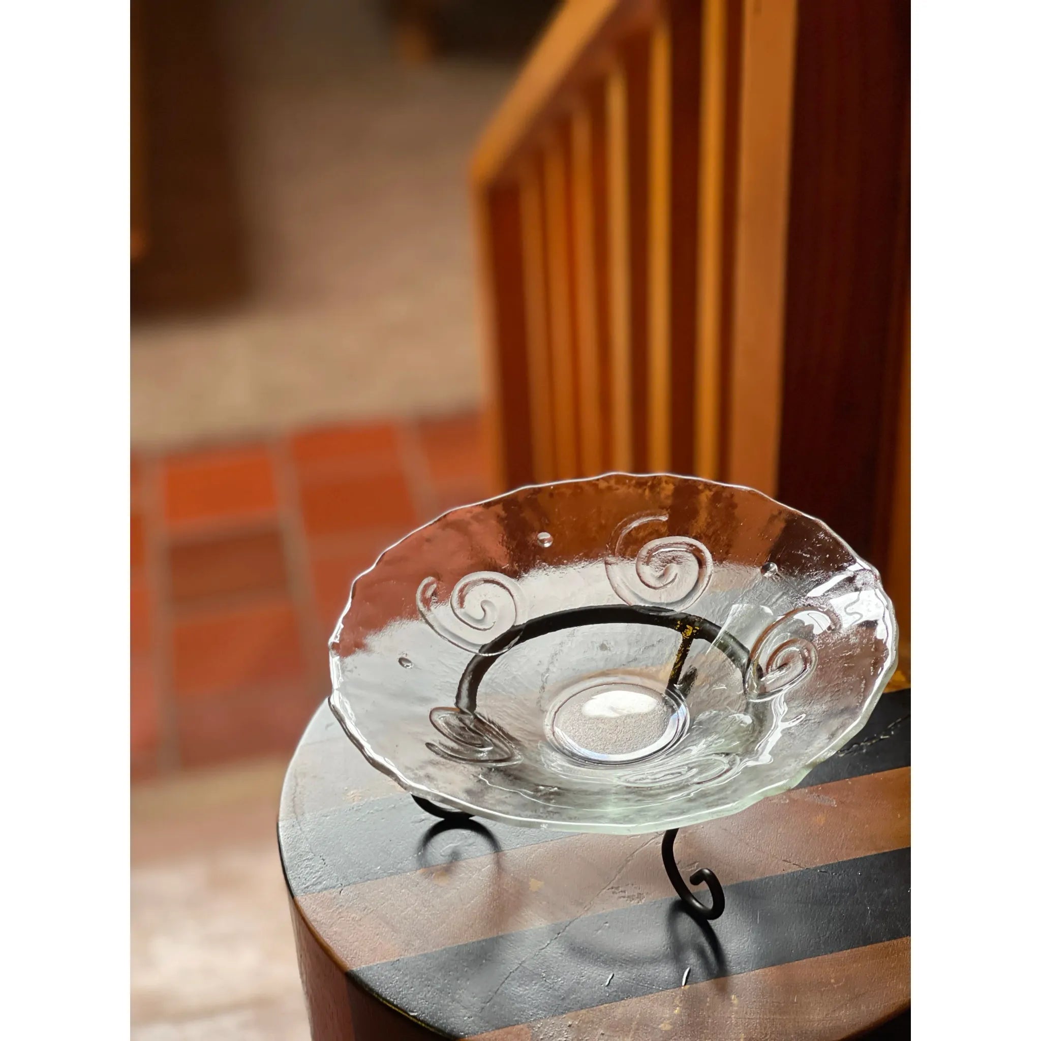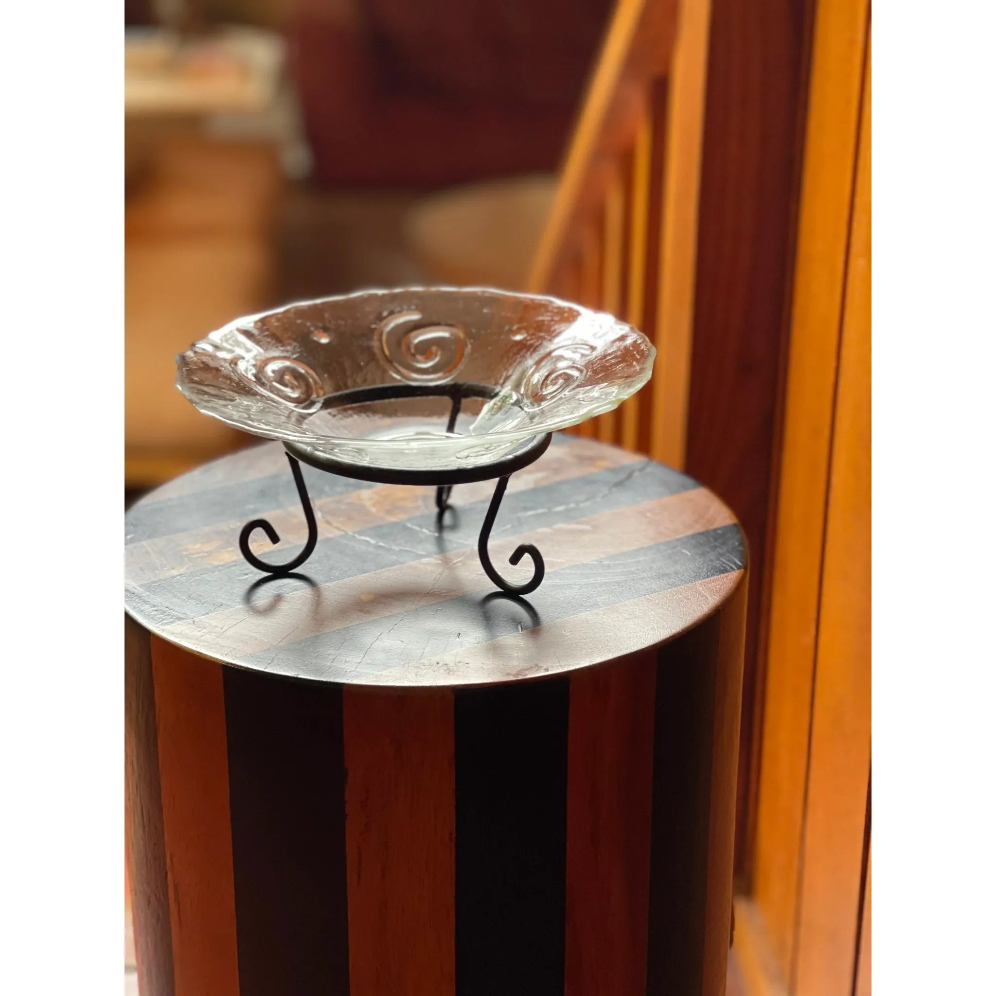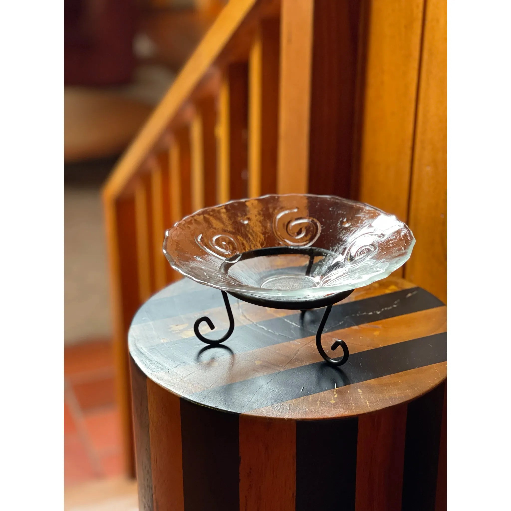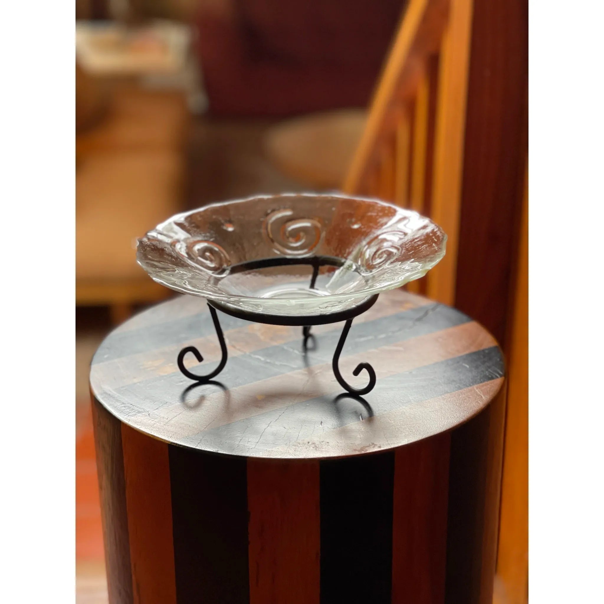 organic shaped glass spiral dish on wrought iron stand, perfect for storing treasures or serving treats or just sitting pretty.