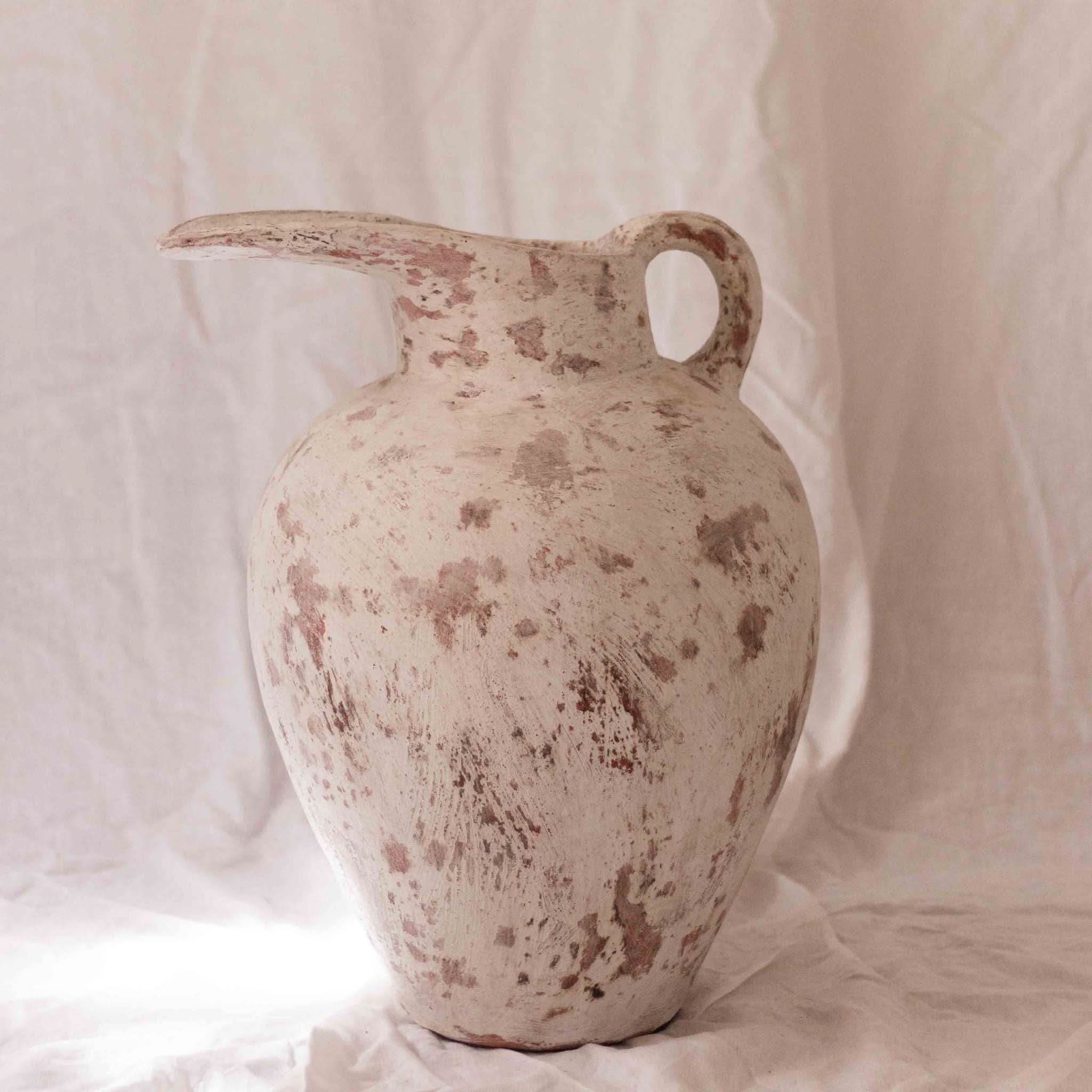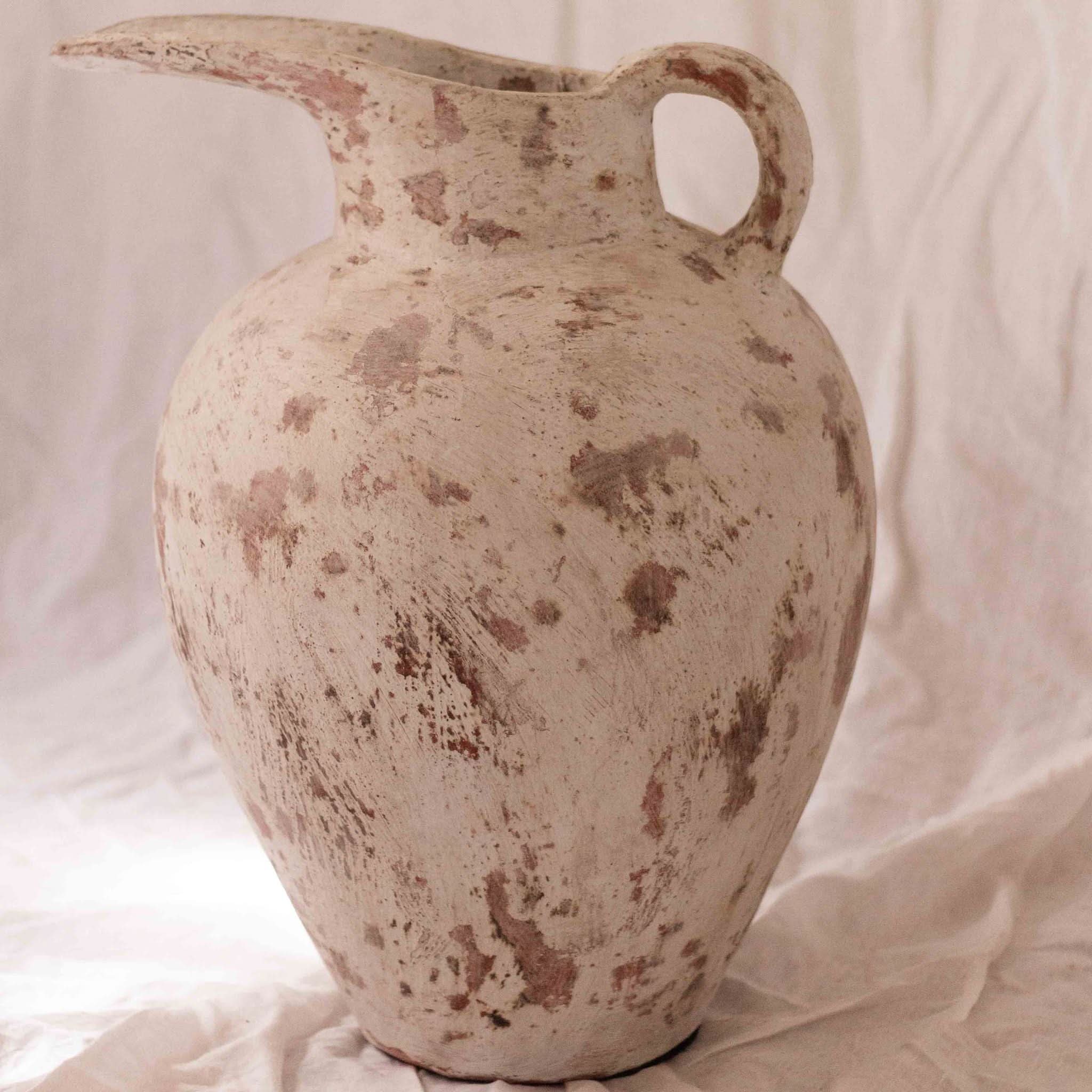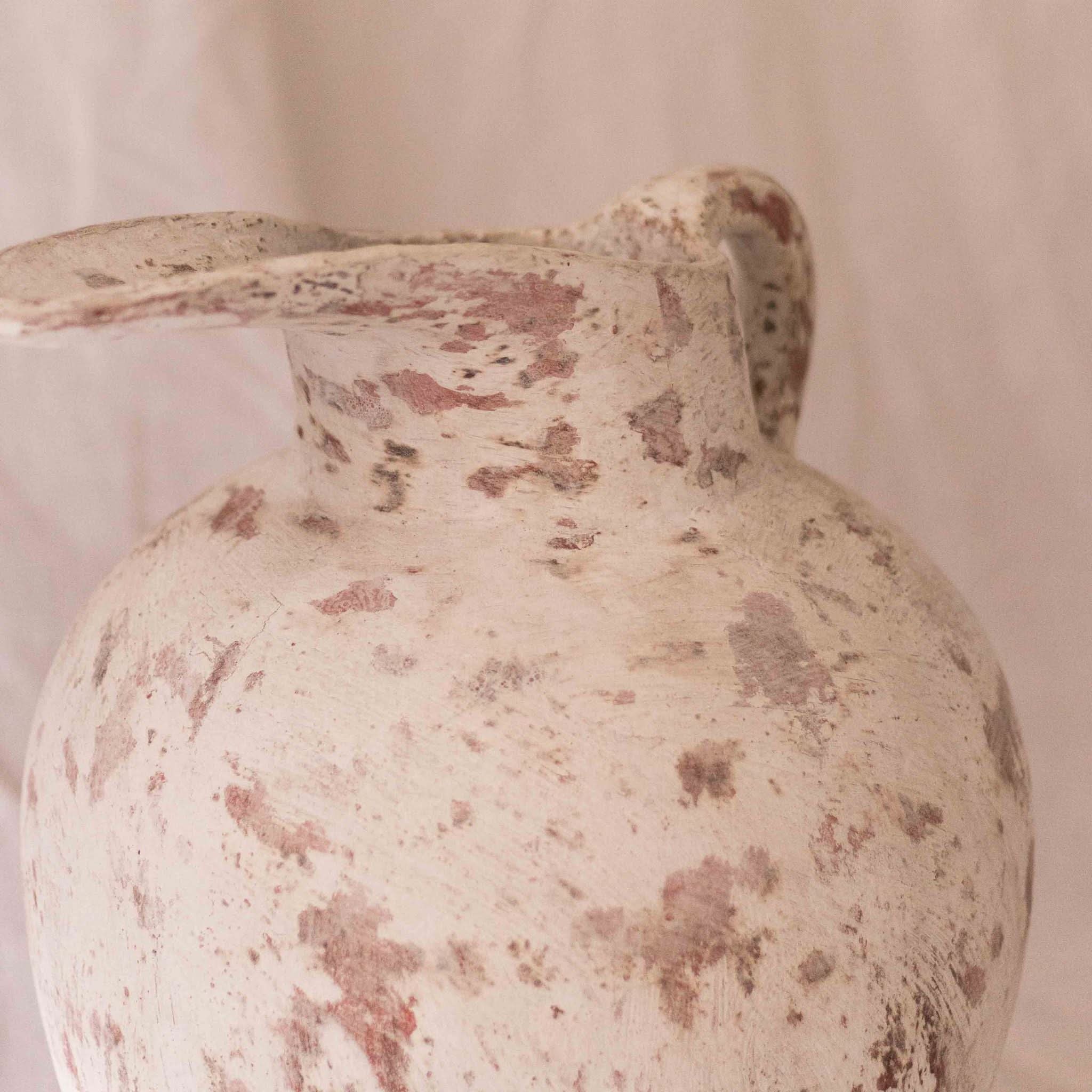 Indonesian Water Jug with a white washed finish. These jugs look great with dried flower arrangement or as a pot indoors or outdoors. No hole at bottom