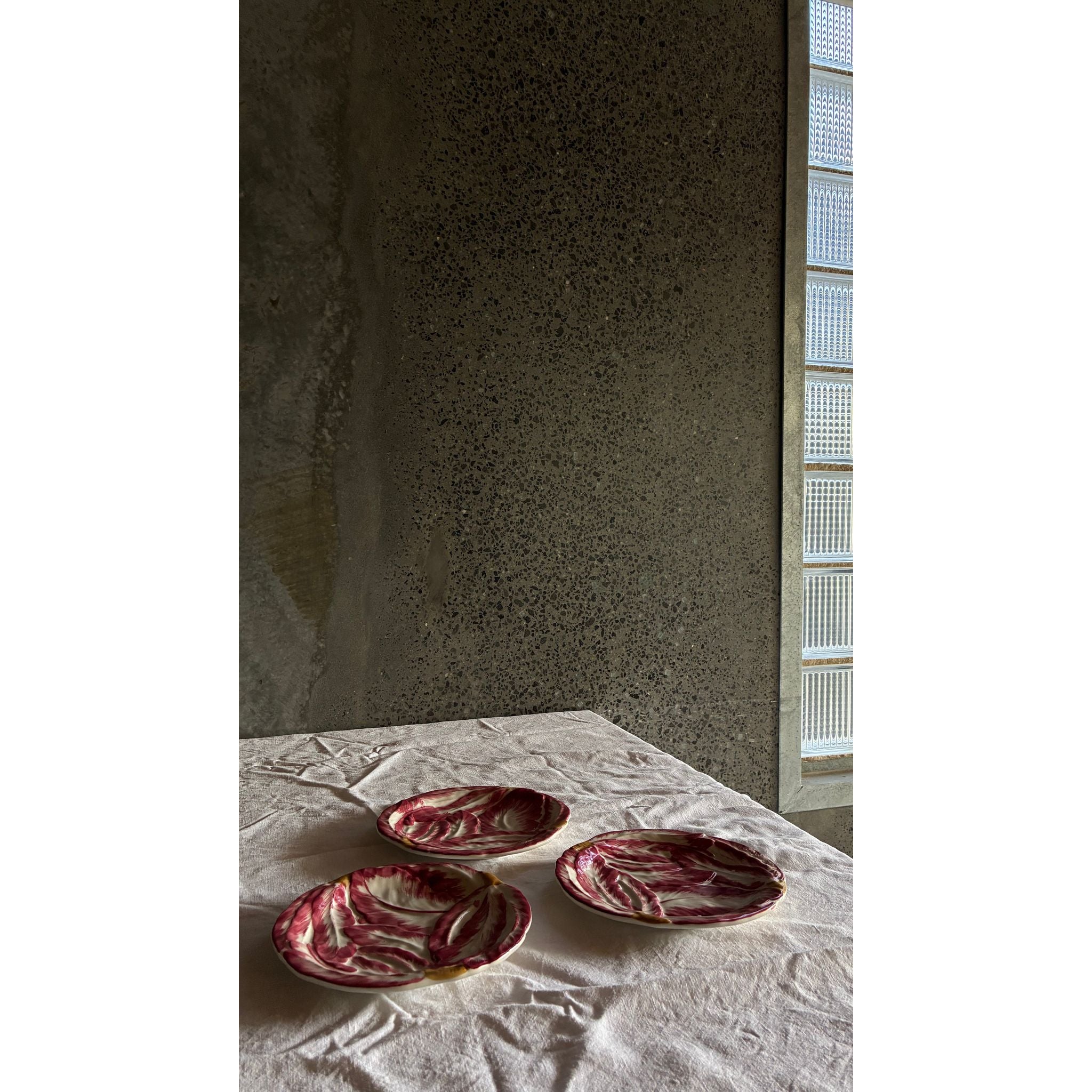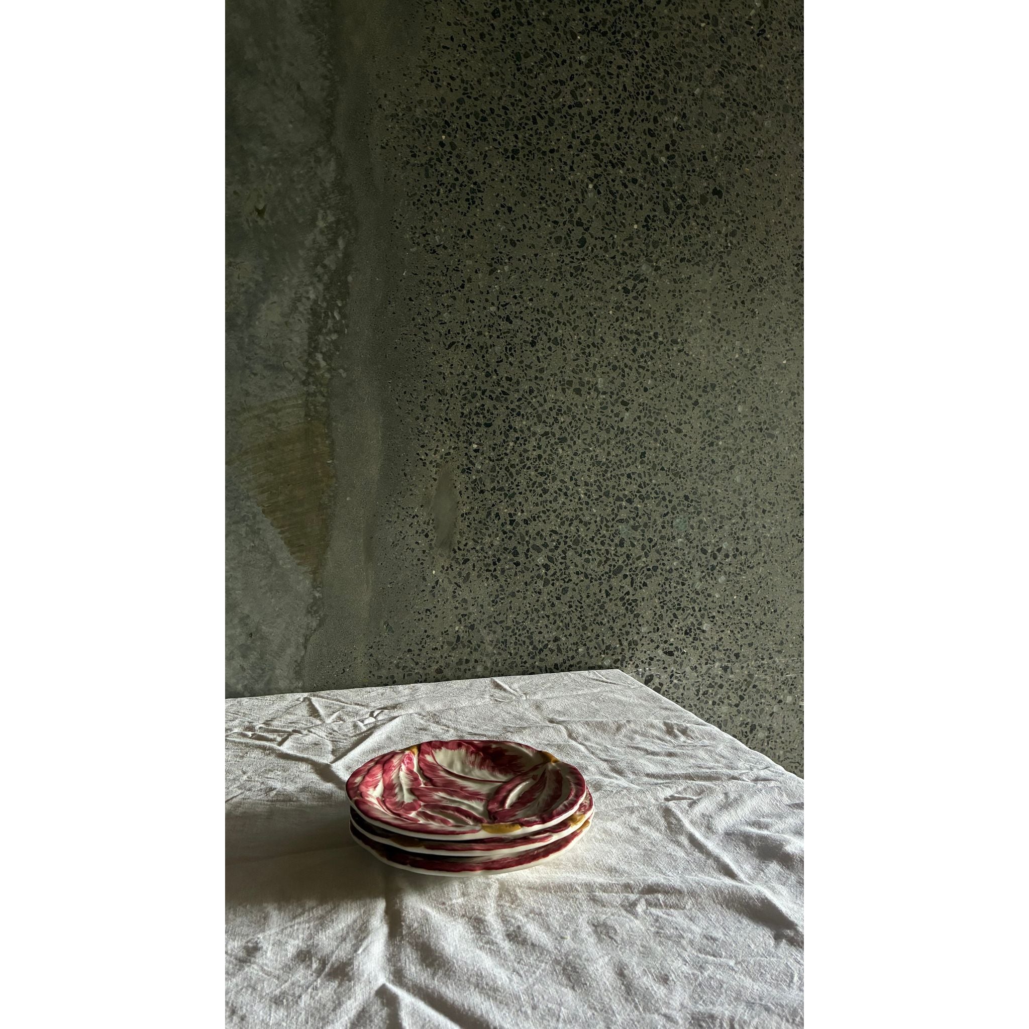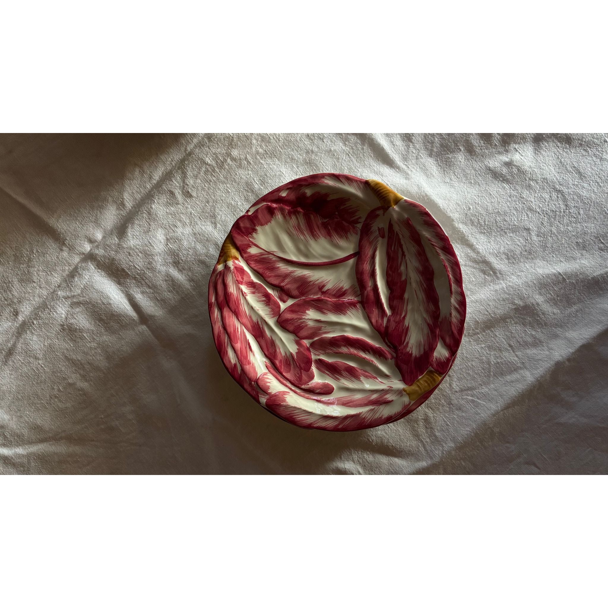 A charming series of Italian ceramic plates shaped and hand-painted to resemble radicchio leaves. Finished in expressive brushstrokes of crimson each plate has a softly sculpted form that gives depth and movement to surface.