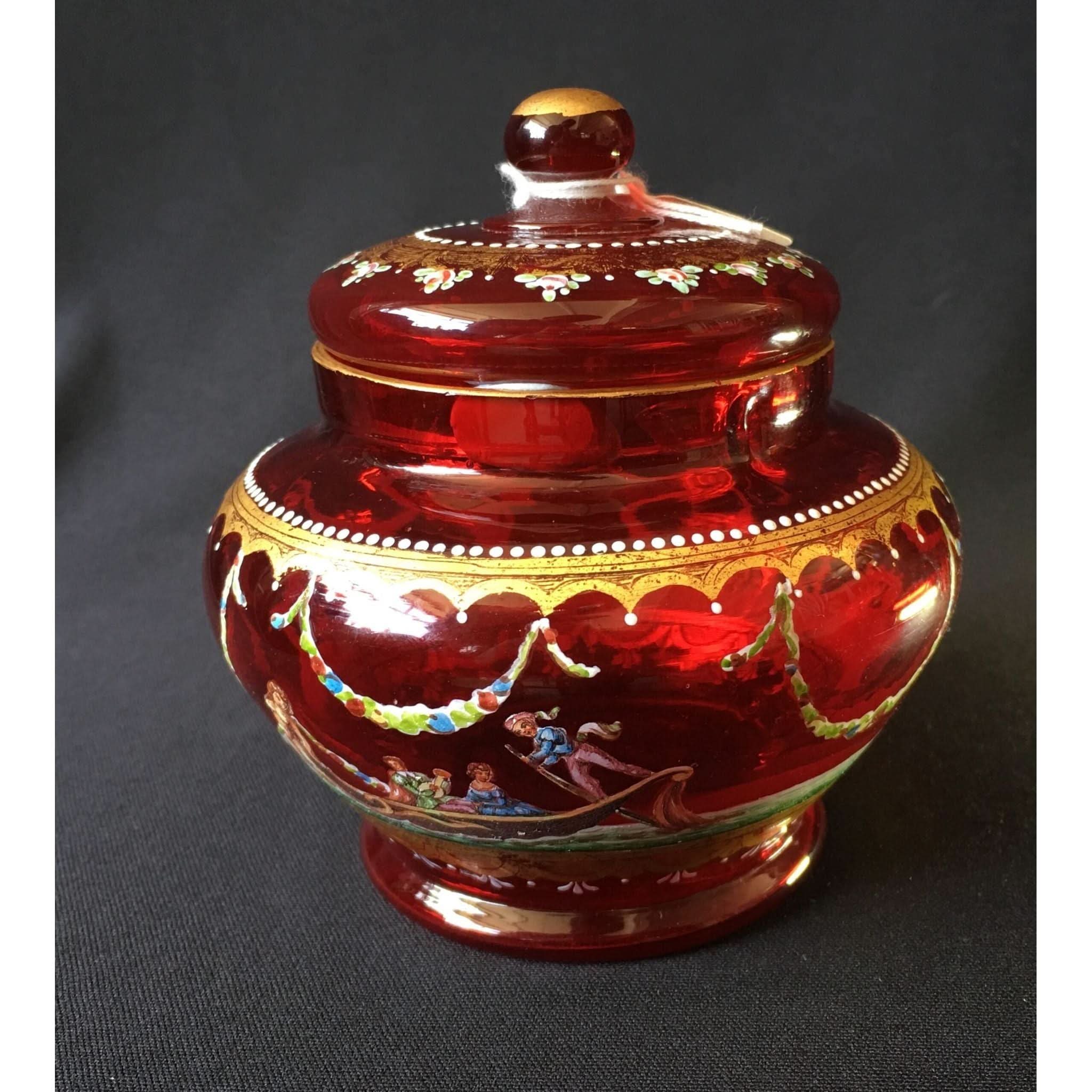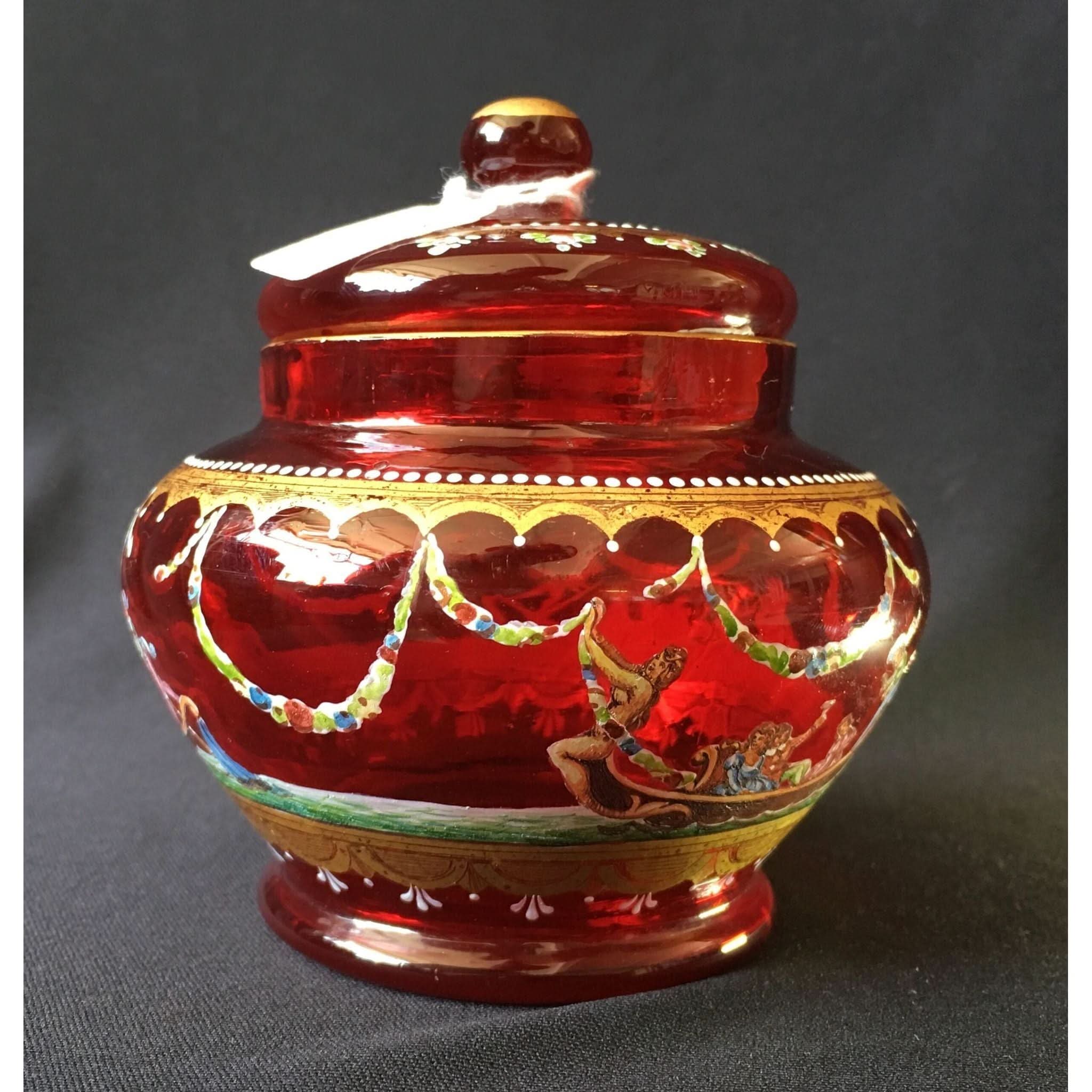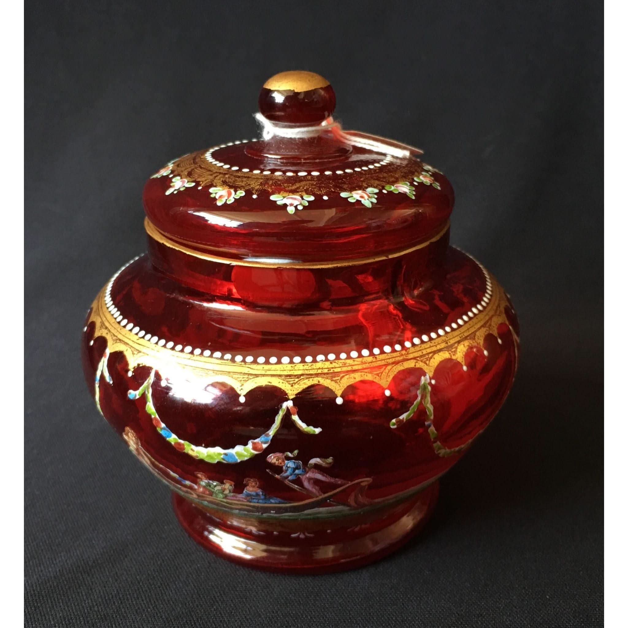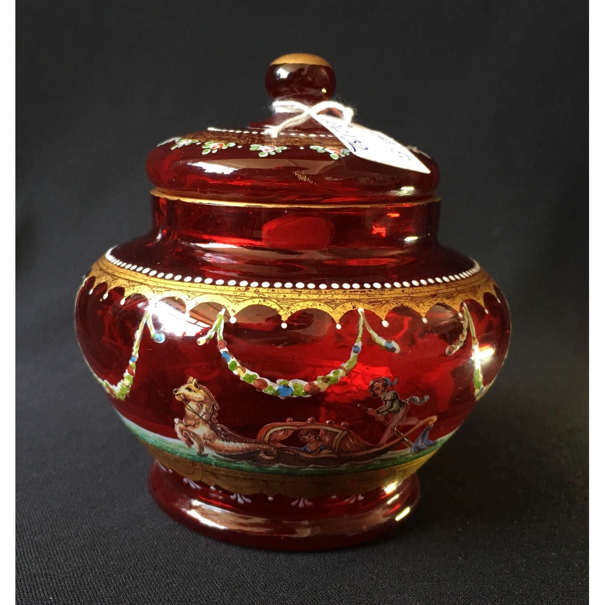 Moser ruby glass covered jar, enamelled in the “Venetian” style with figures in a gondola. Circa 1925