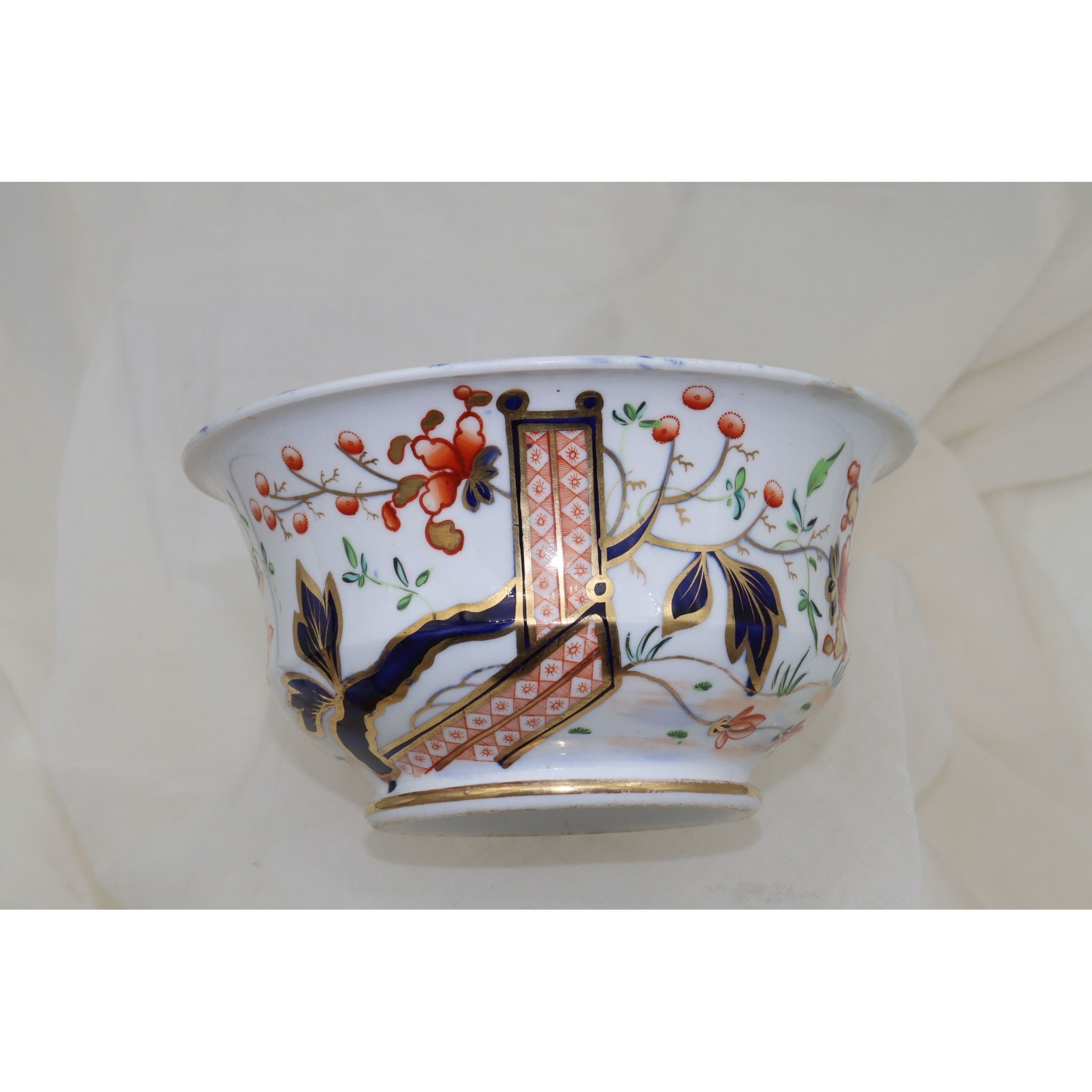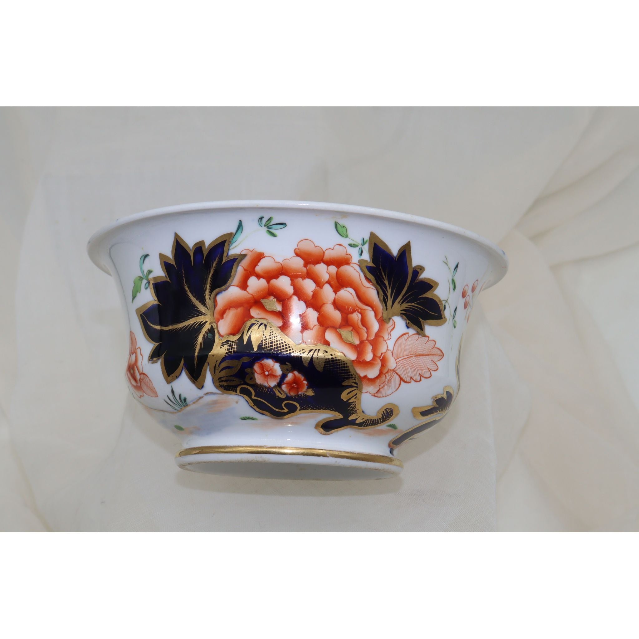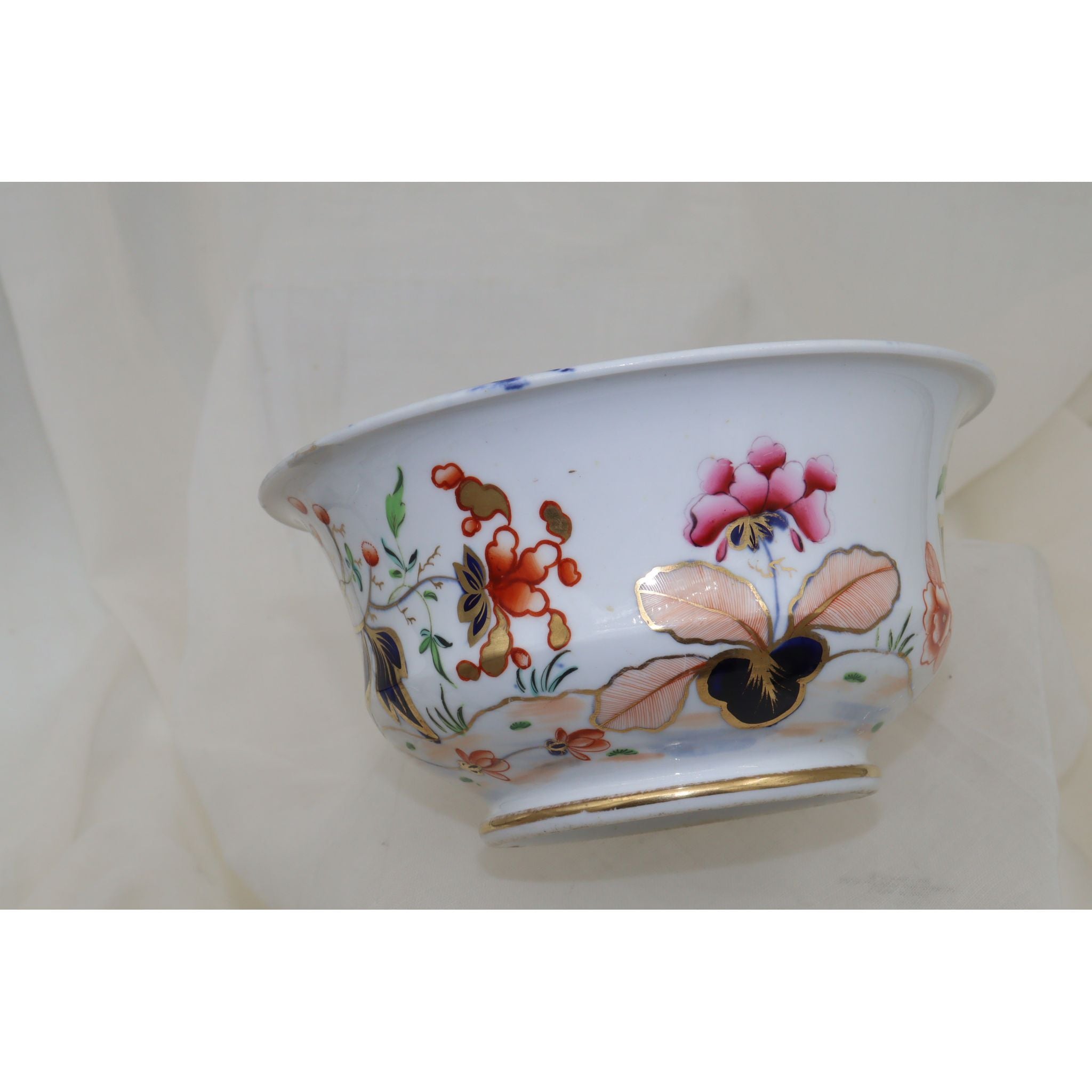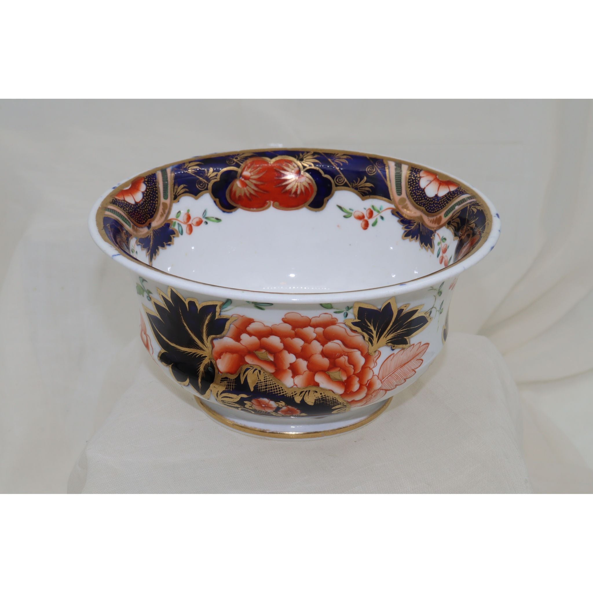 This porcelain slop bowl by R & J Clews, of Hanley in Staffordshire, is decorated with a hand painted and gilded Japan pattern, featuring some very fine painting, particularly to the fence portion of the pattern. The decoration and the painted S on the base are characteristic of the Clews, or Blue V factory. The pattern is very close to the Peover/Mrs Bowring pattern 316. The maker of the bowl is, however, unknown. The bowl has a diameter of 162 mm (6.5 inches) and it stands 82 mm (3.25 inches) high. There is minimal wear to the gilding, and it does have a repair under the lip that measures 16 mm (5/8ths of an inch) long and 5 mm (.25 of an inch) deep. It would date from around 1820.