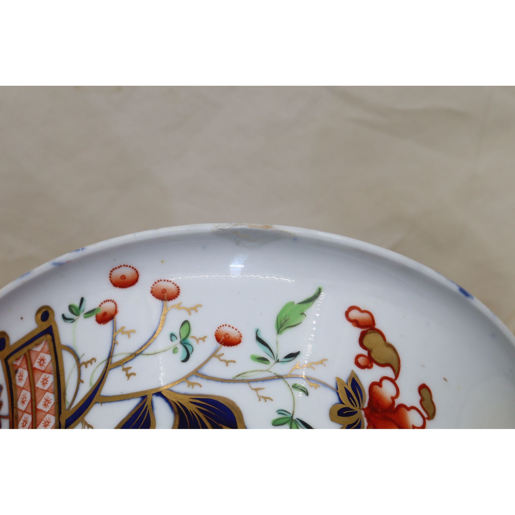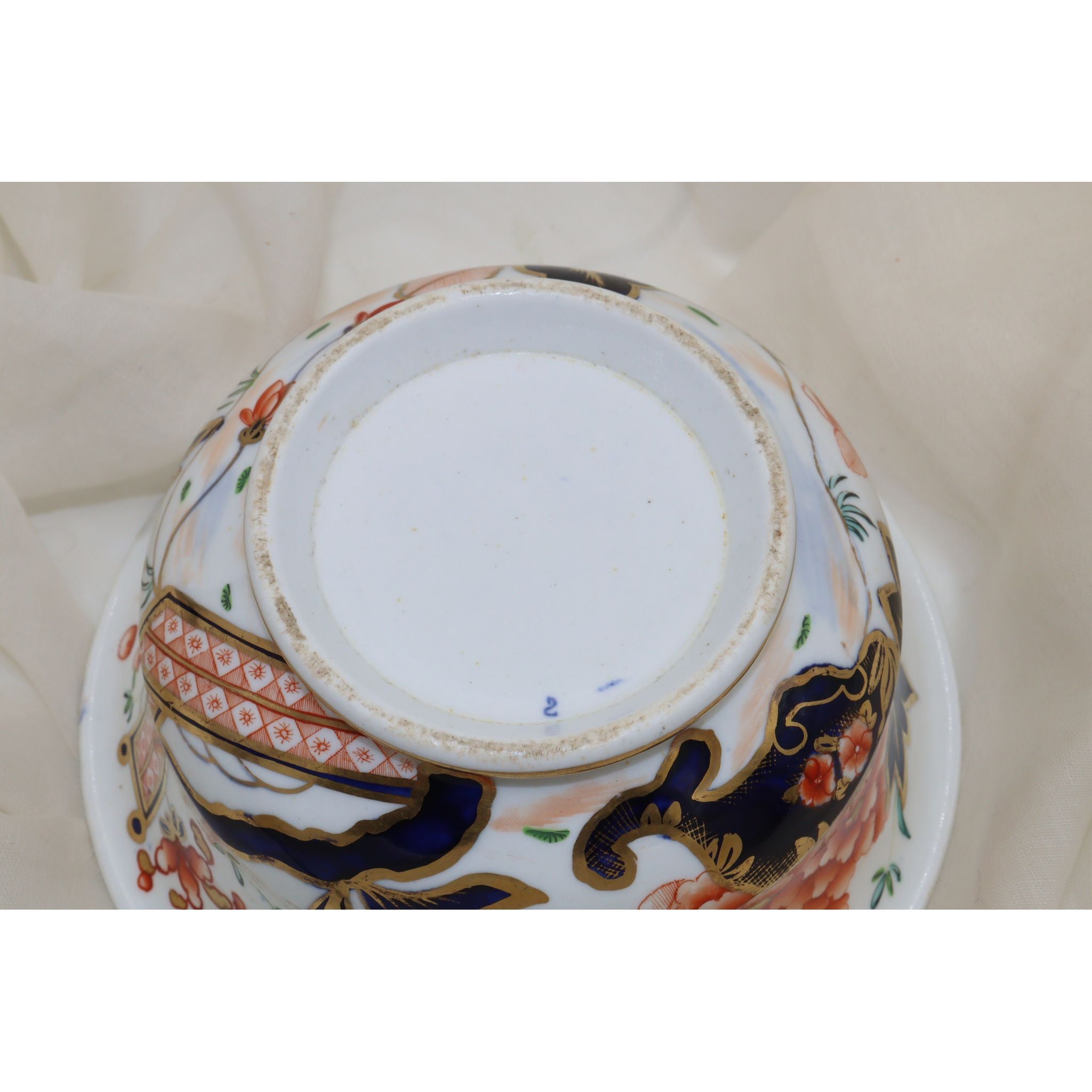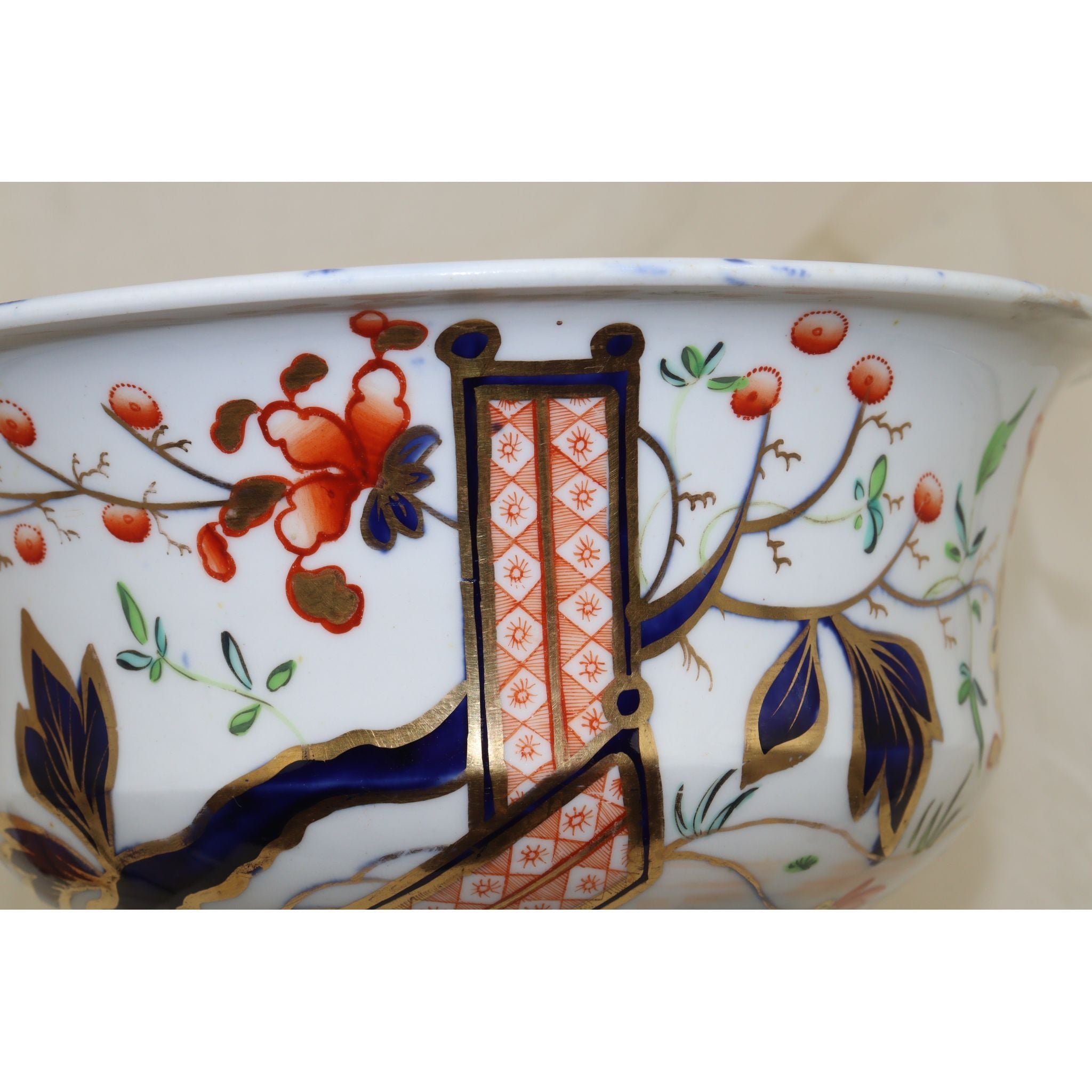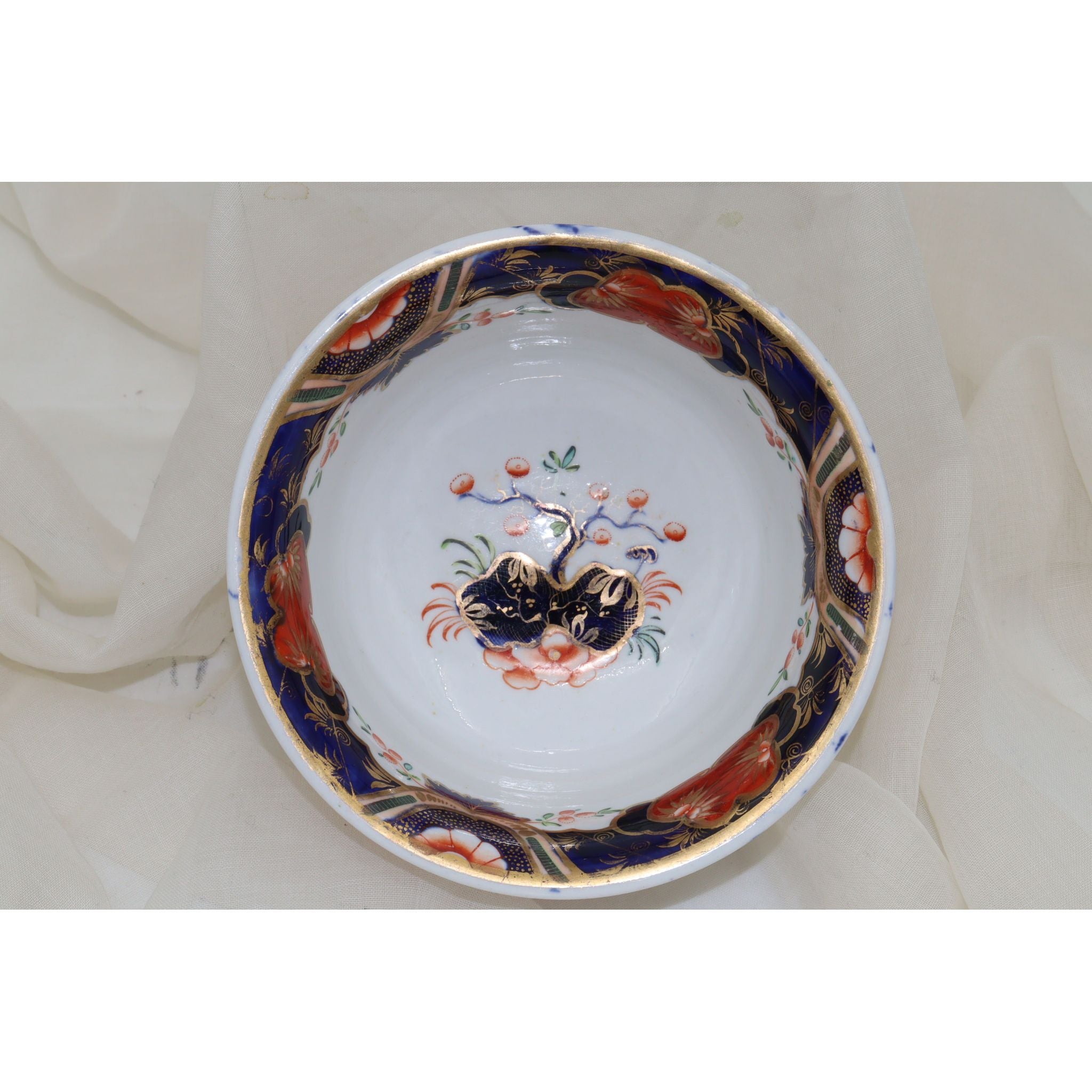 This porcelain slop bowl by R & J Clews, of Hanley in Staffordshire, is decorated with a hand painted and gilded Japan pattern, featuring some very fine painting, particularly to the fence portion of the pattern. The decoration and the painted S on the base are characteristic of the Clews, or Blue V factory. The pattern is very close to the Peover/Mrs Bowring pattern 316. The maker of the bowl is, however, unknown. The bowl has a diameter of 162 mm (6.5 inches) and it stands 82 mm (3.25 inches) high. There is minimal wear to the gilding, and it does have a repair under the lip that measures 16 mm (5/8ths of an inch) long and 5 mm (.25 of an inch) deep. It would date from around 1820.