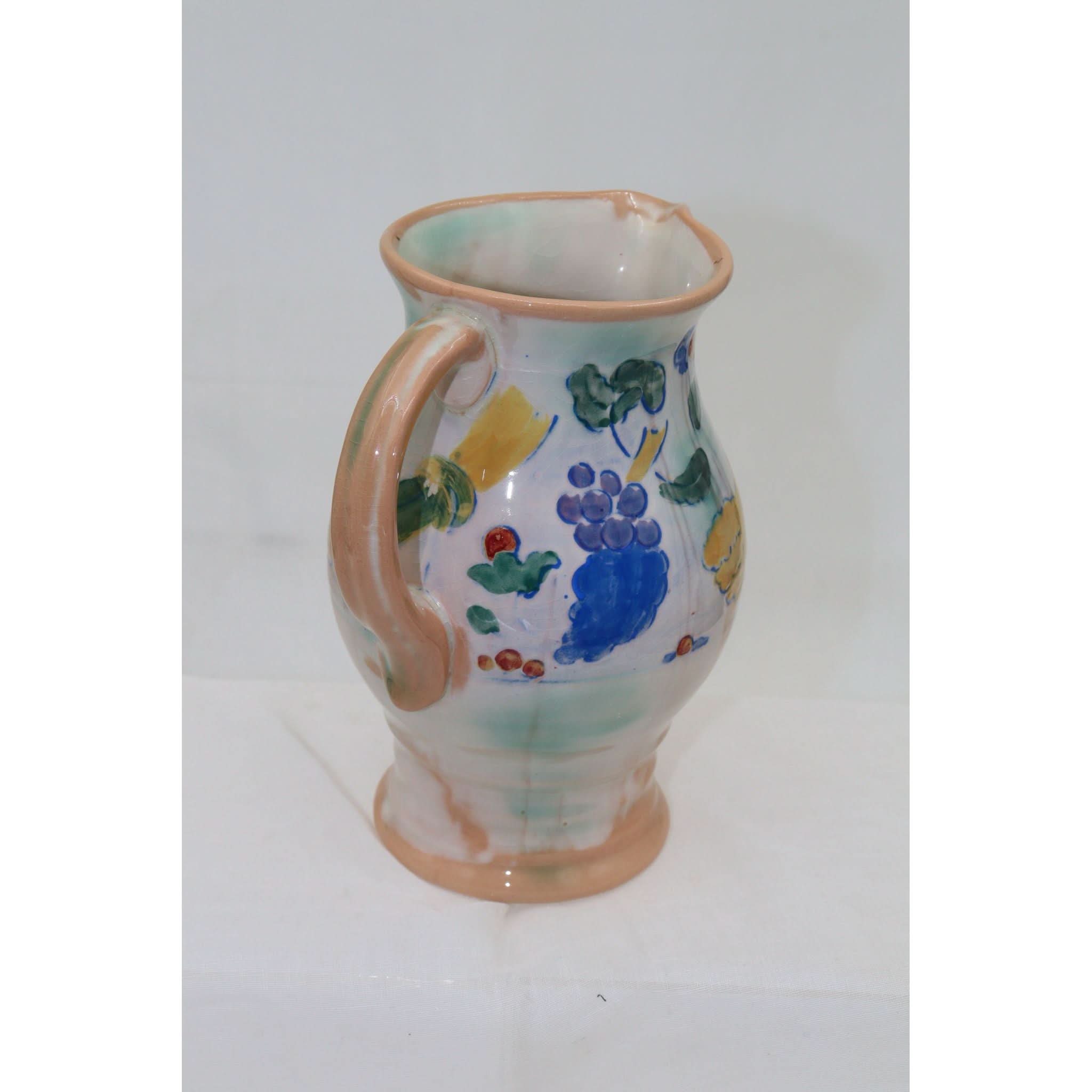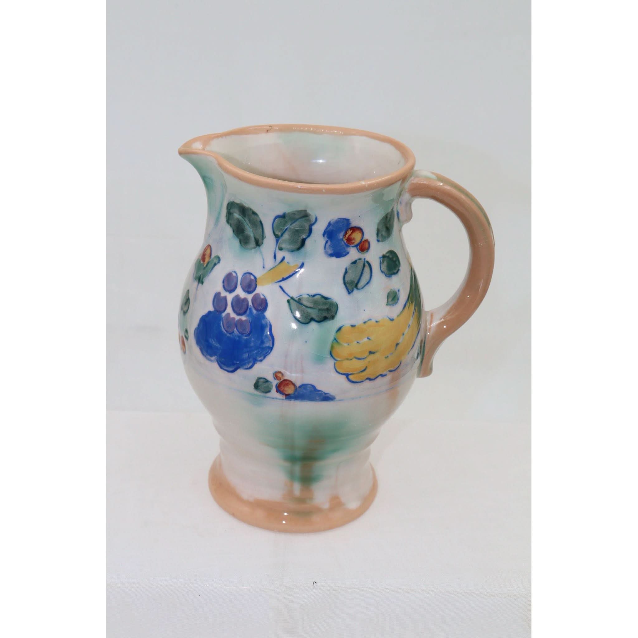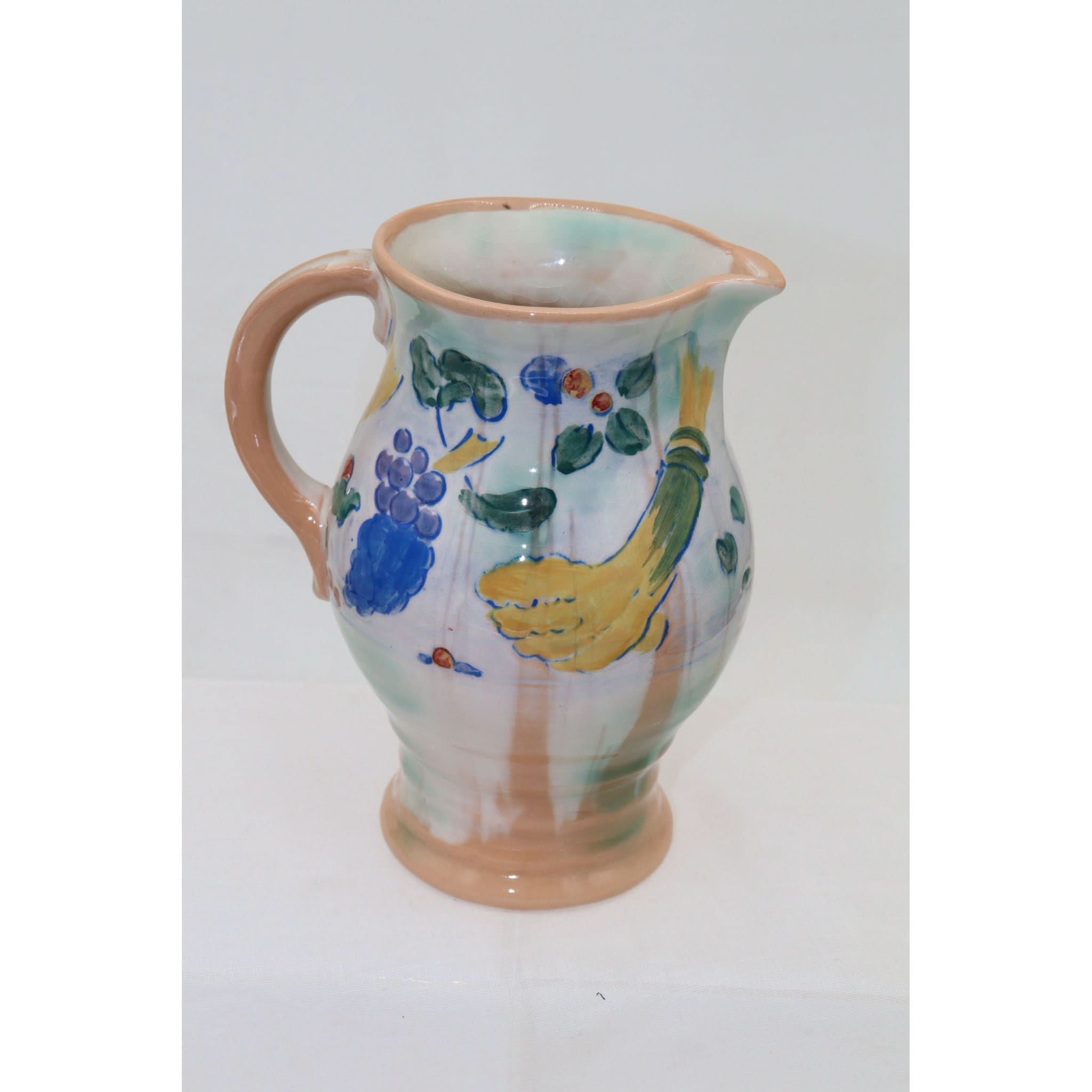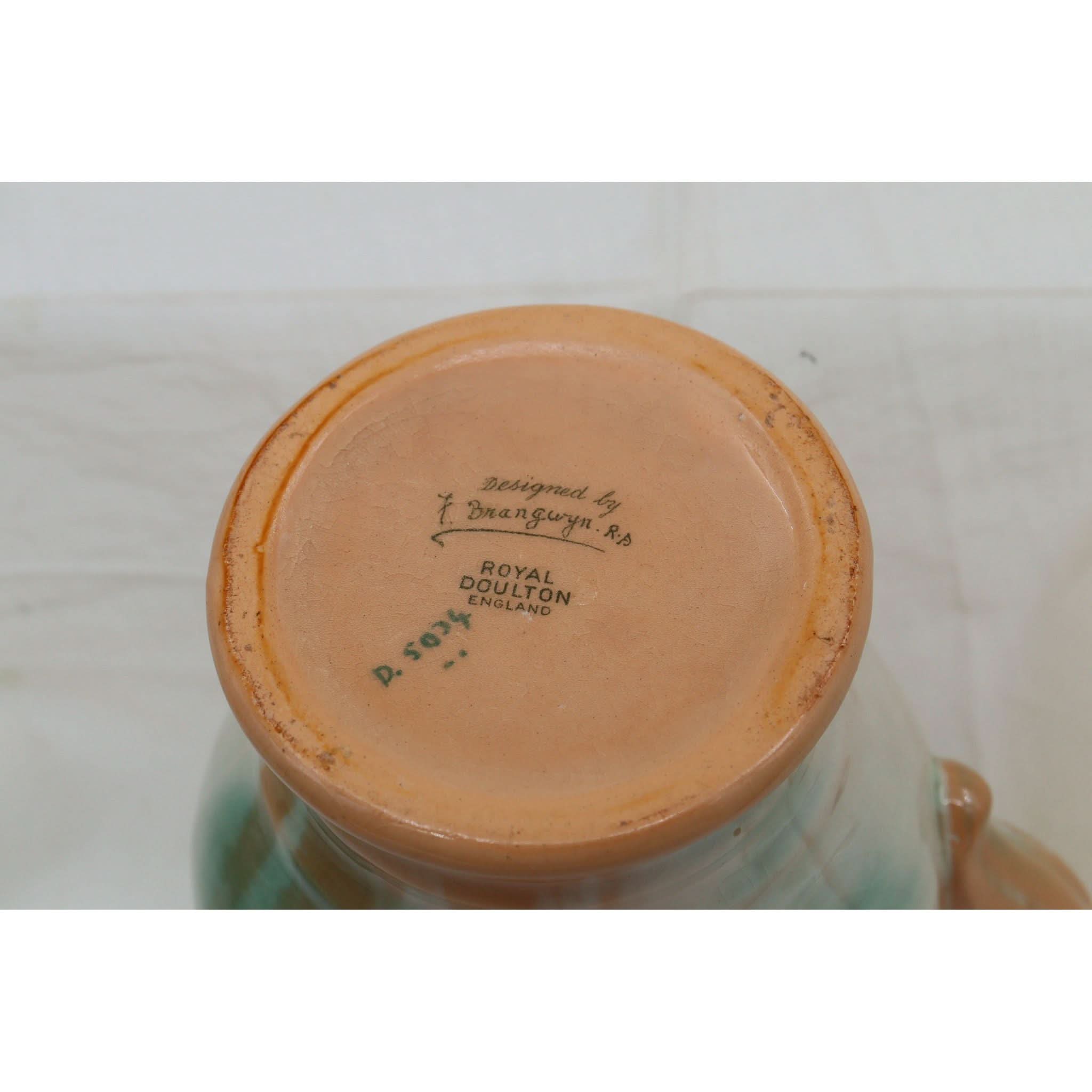 This Royal Doulton Brangwyn Ware jug is decorated with a design by Frank Brangwyn R. A. (1867-1956) and is entitled "Harvest". The jug was given a white ground, and then the design was lightly incised into the body, and coloured by hand. The designs didn't sell particularly well at the time, and as always, the rarity of this ware has meant that it has become very collectable since then. Brangwyn was a prolific artist and designer across a number of diverse mediums, and was admitted as a full member to the Royal Academy in 1919. He was knighted in 1941. The jug stands 180 mm (7 inches) high and has a diameter of 116 mm (4.5 inches). Brangwyn Ware can be prone to some crazing, and this jug does have some crazing, although not particularly noticeable. It would date from the mid 1930's.