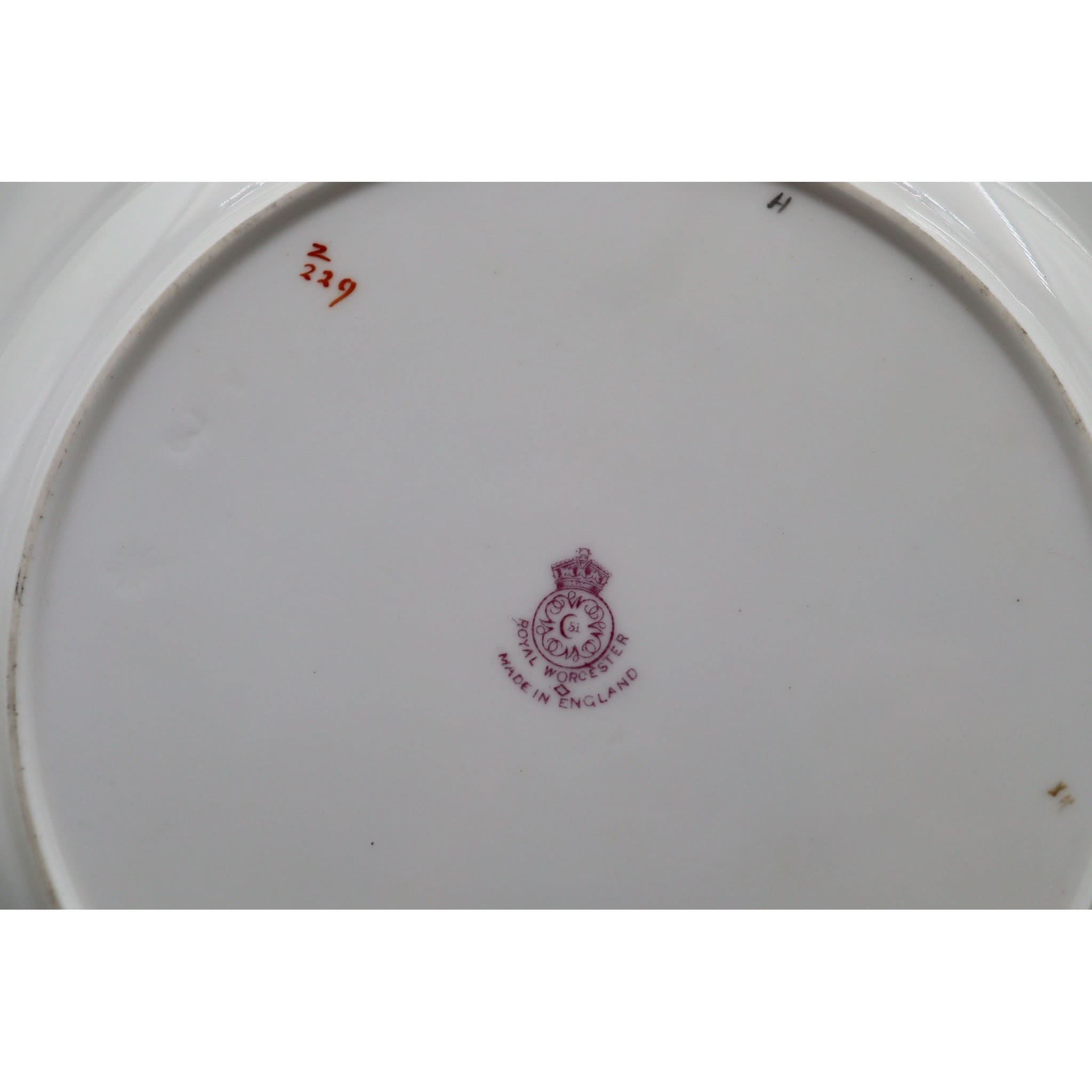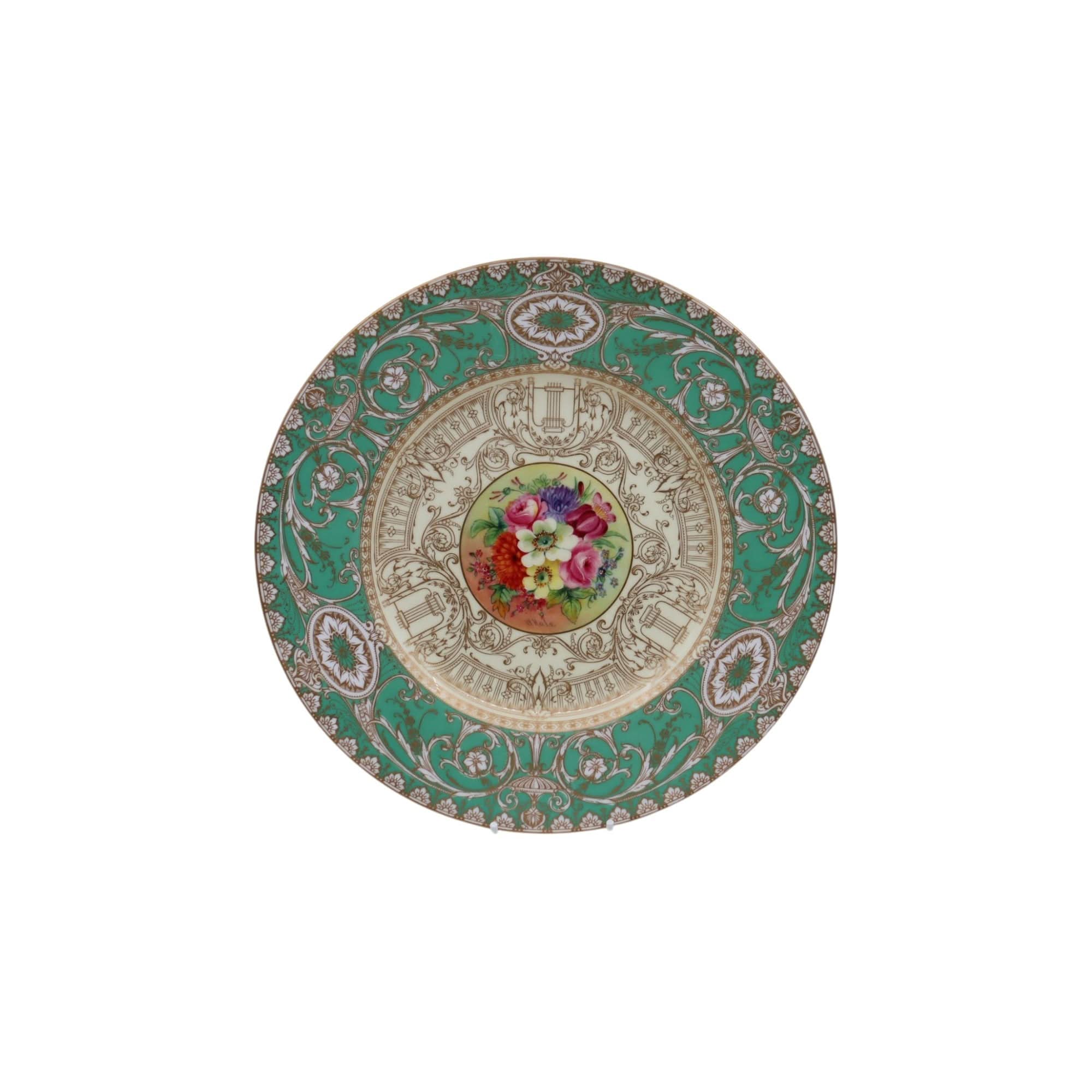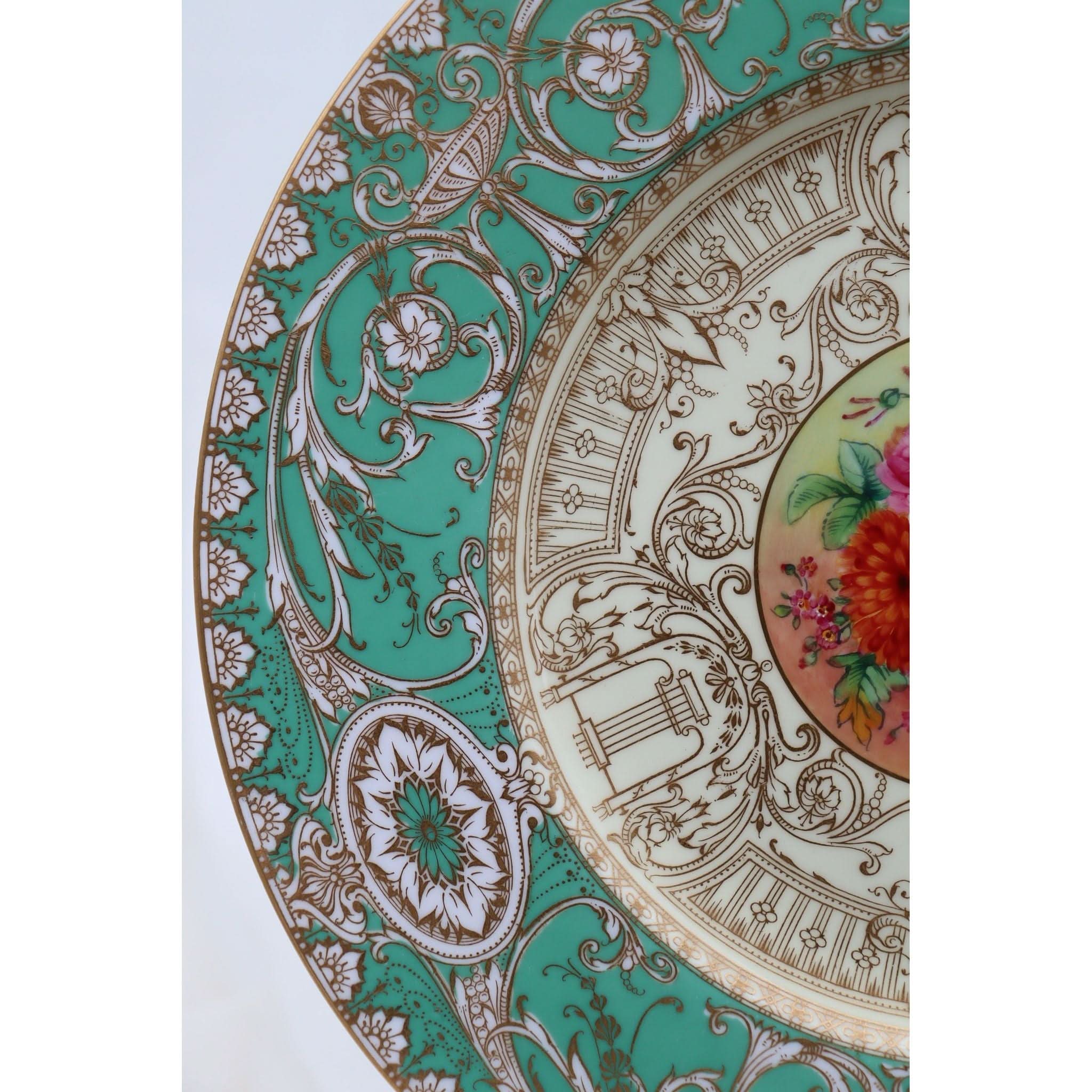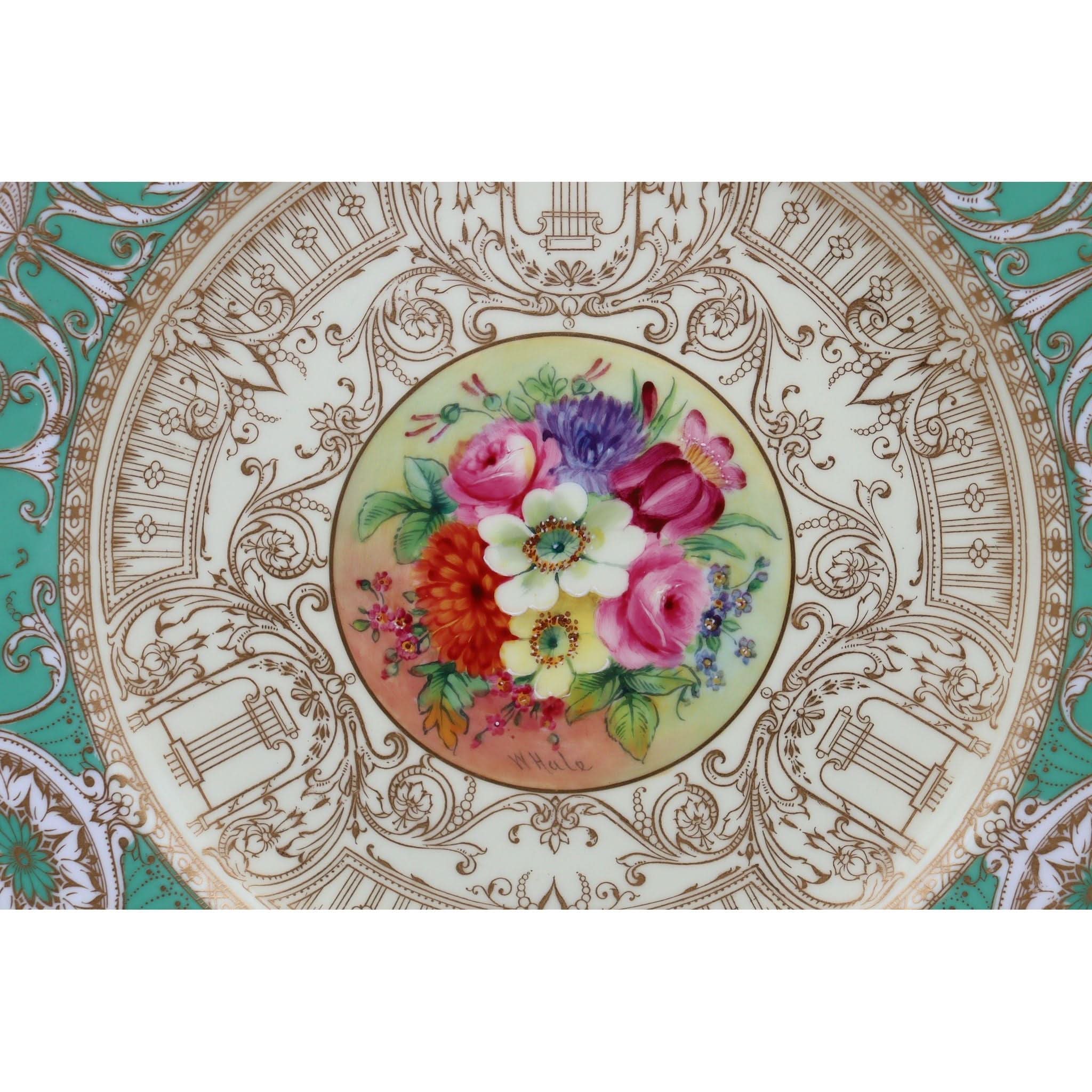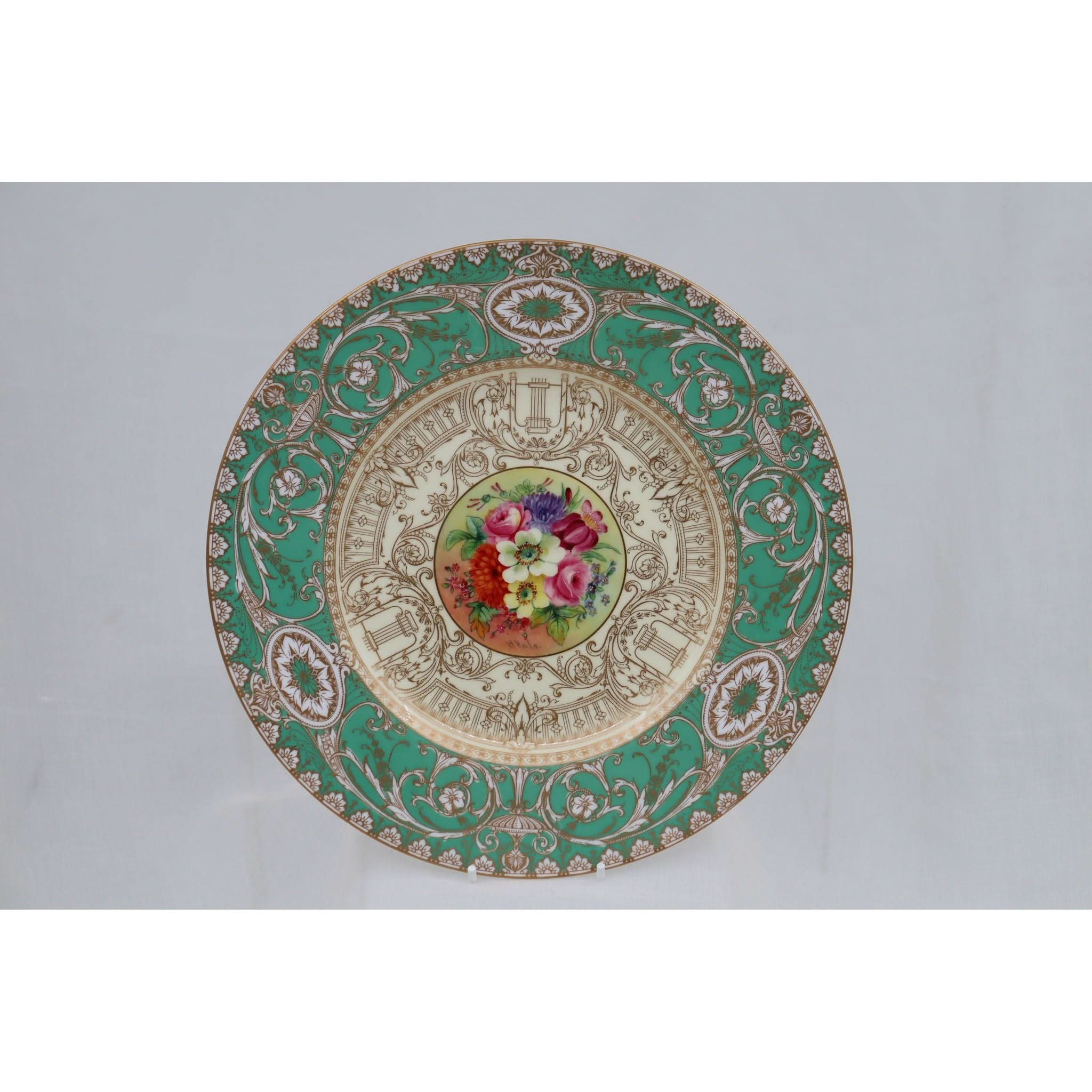 This Royal Worcester cabinet plate is decorated to the centre with a wonderful hand painted floral spray by William Hale (?-1930). This spray is surrounded by extensive raised gilding on a pale yellow ground to the central well, and more on a mid-green ground to the rim. Hale started at Royal Worcester in 1874 and became one of its principal artists. He was regarded as a very fine flower painter, who could also turn his hand to detailed gilding and groundlaying. The diameter of this plate is 266 mm (10.5 inches) and it stands 19 mm (.75 inch) high. It is in excellent condition and carries the date mark for 1929.