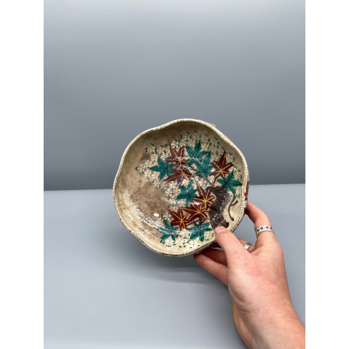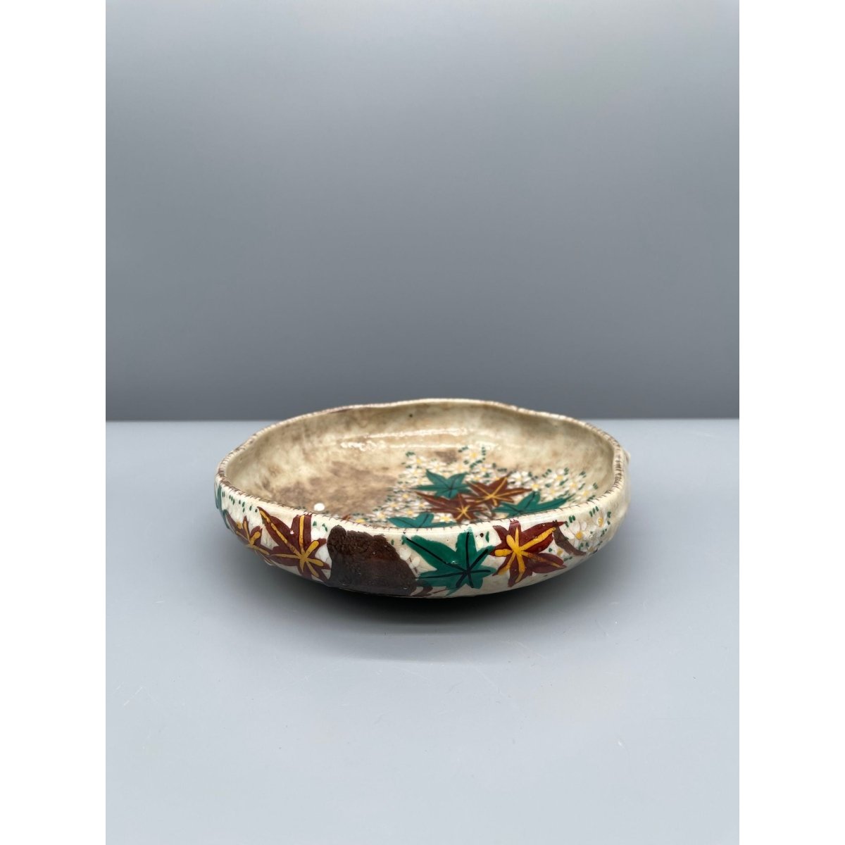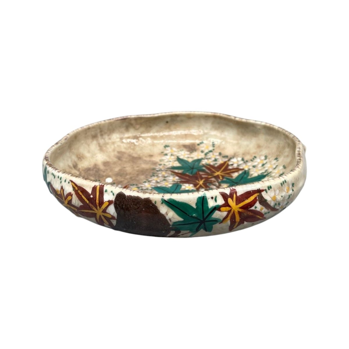 A beautiful hand-painted Japanese serving plate, with a vibrant floral motif featuring blossoms and maple leaves.