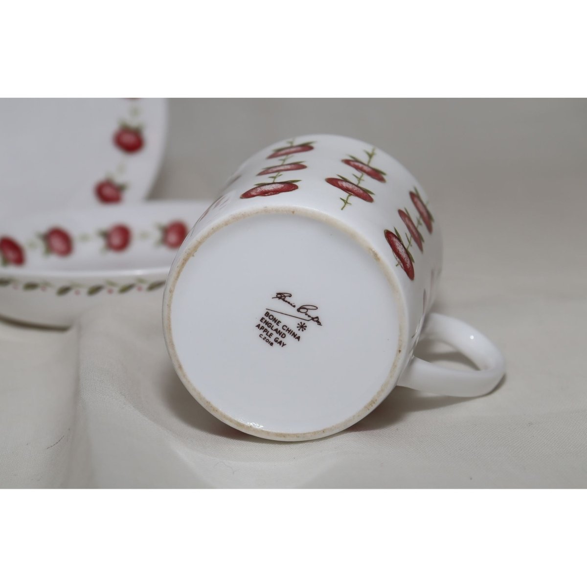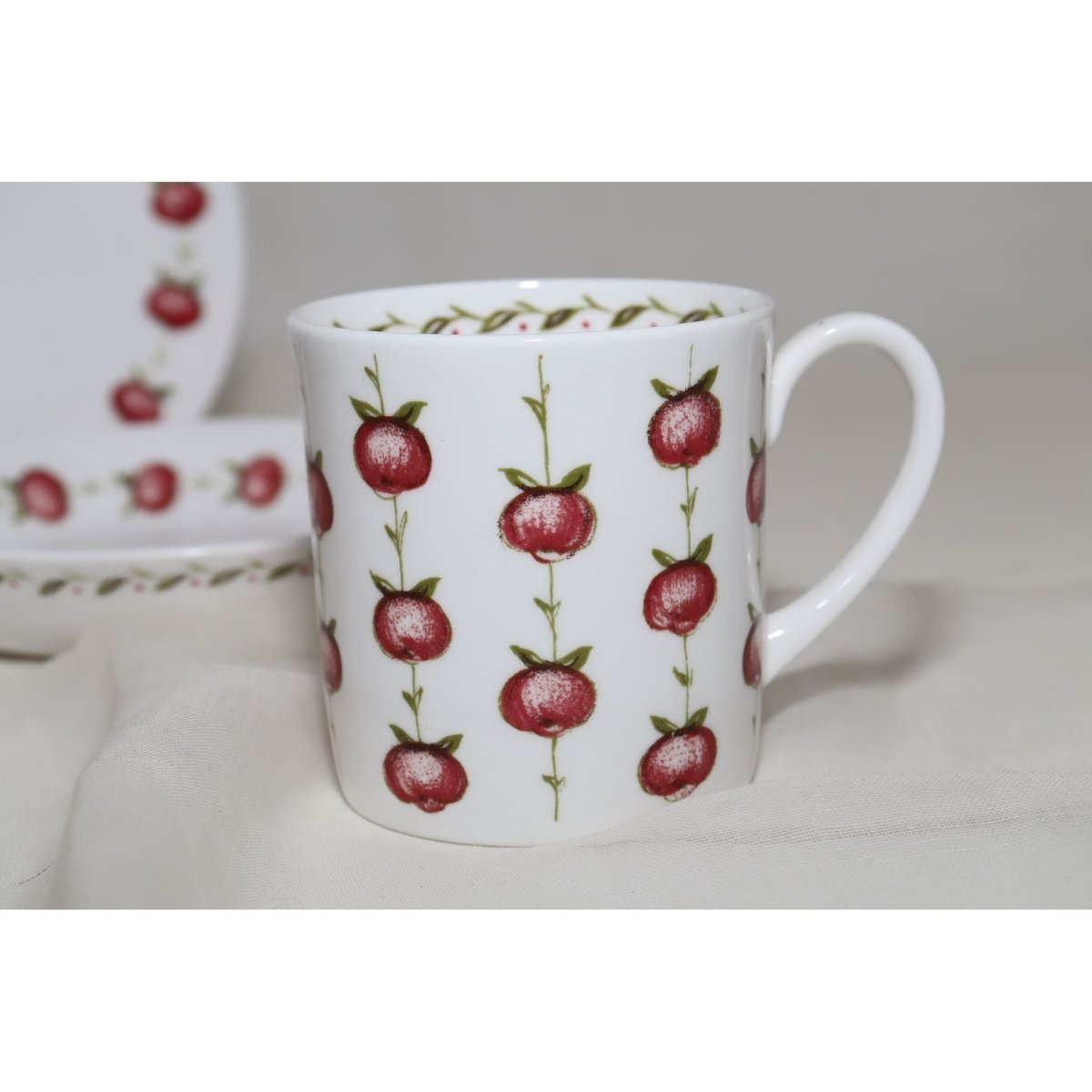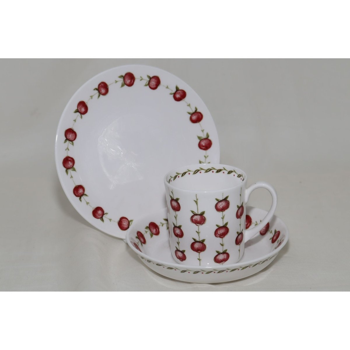 Decorating this cup, saucer and plate by Susie Cooper is her always popular Apple Gay pattern (pattern C 2018). This pattern was first issued in 1961 and ran for a number of years, and the name of the shape is Can, which also had a long life. The mark on the base indicates that this set dates from the period 1961-66. It is in very good condition.