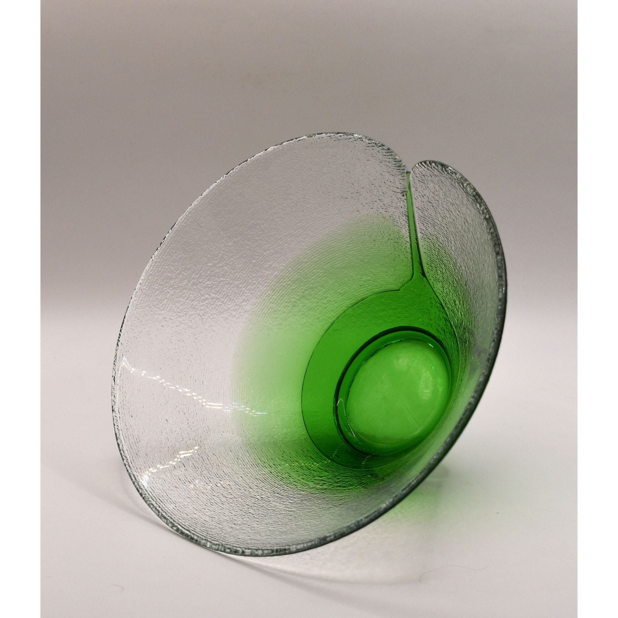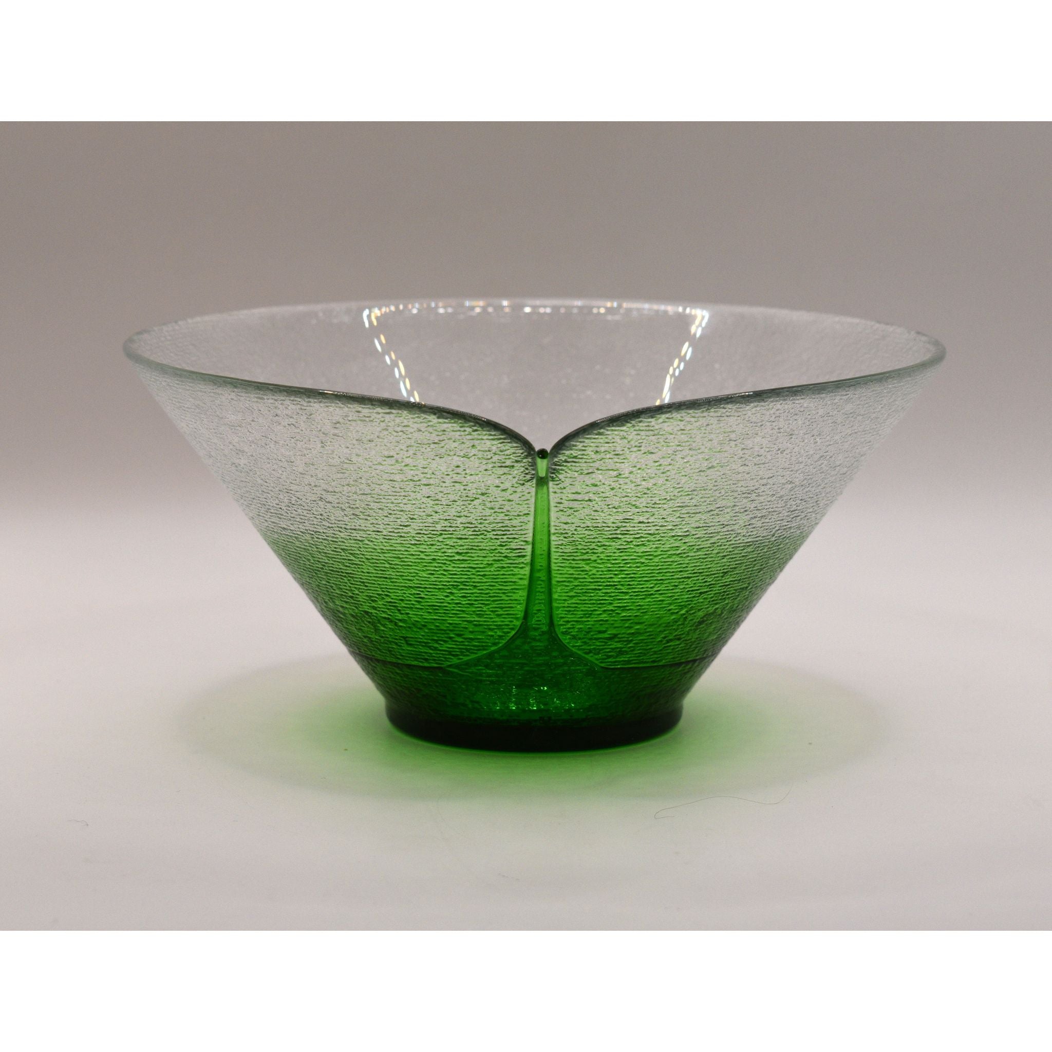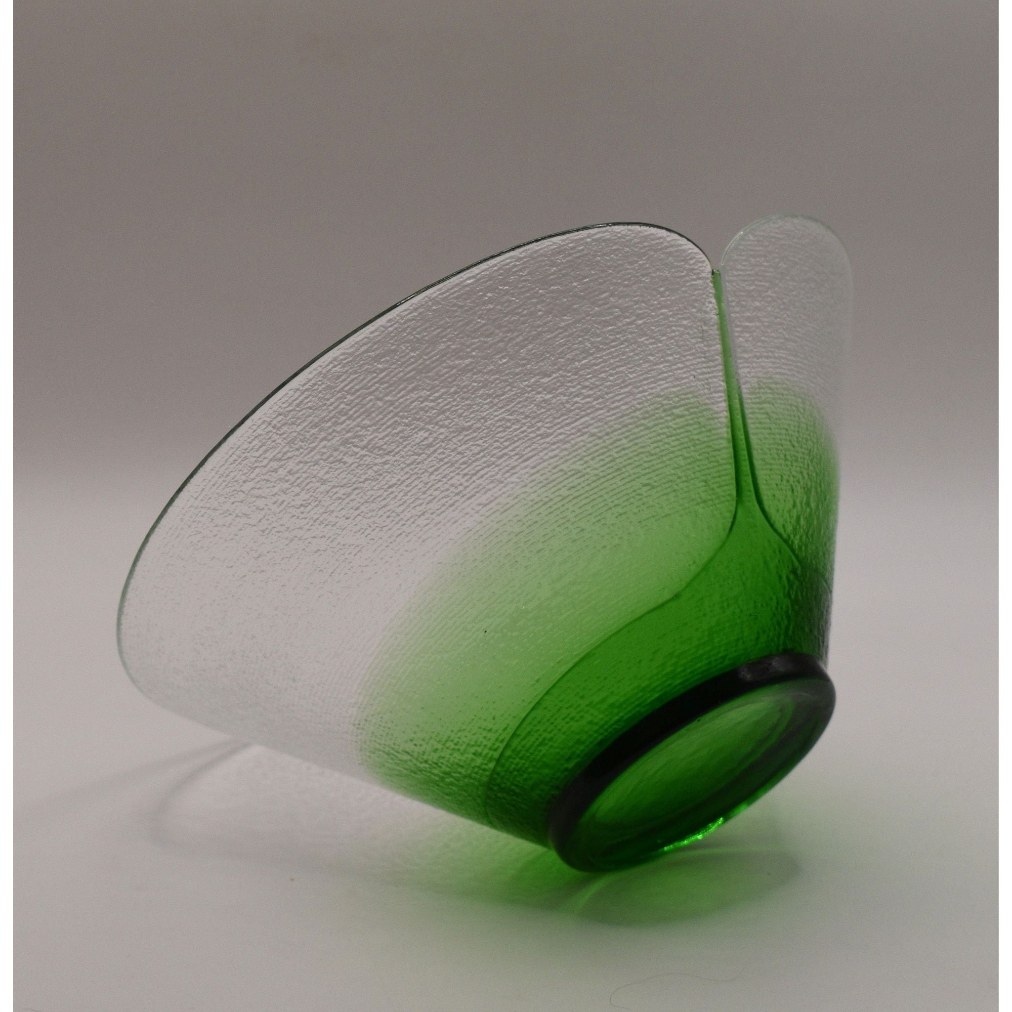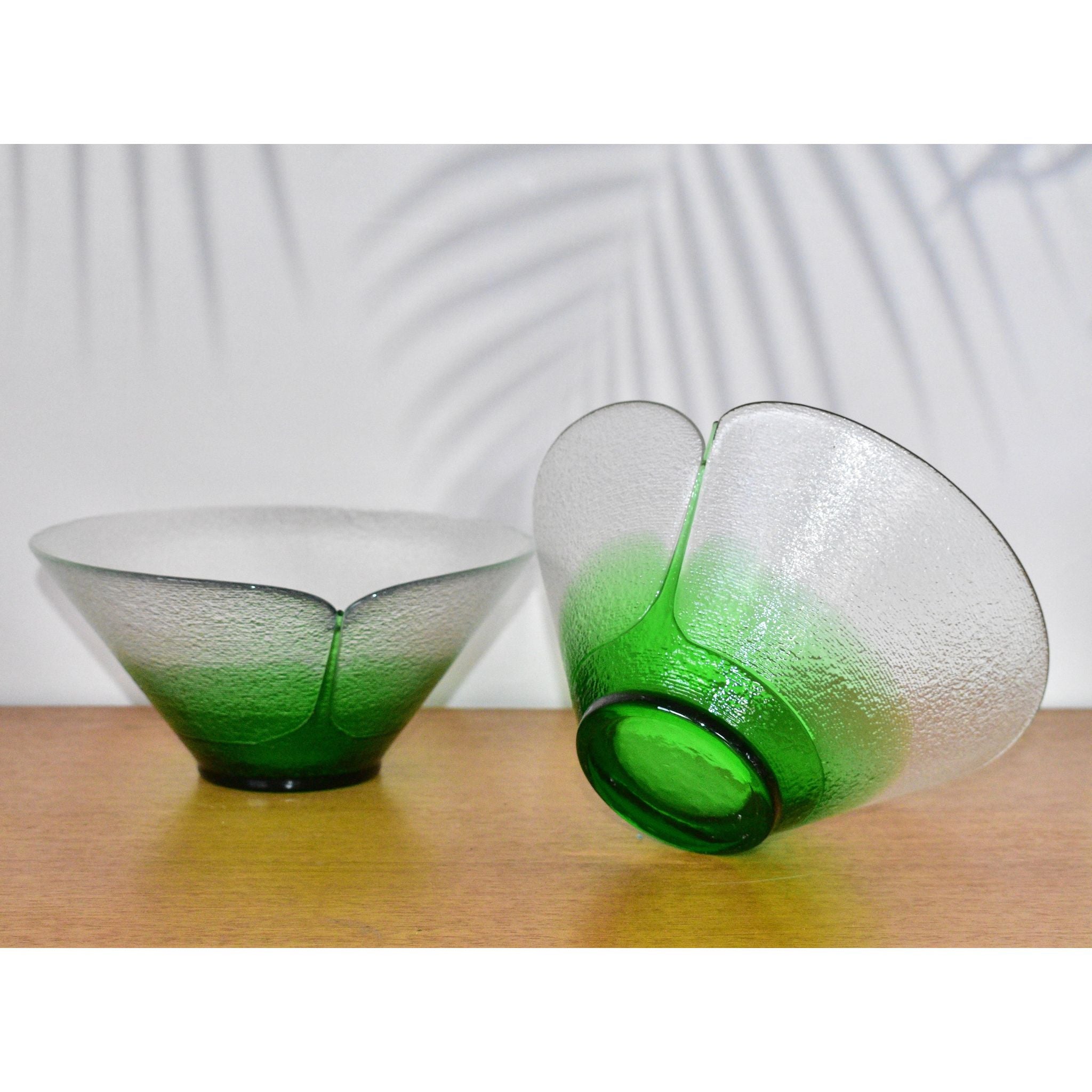 Stunning Bohemia art glass bowls designed by Jiri Suhajek for Crystalex of Czechoslovika. Using a unique centrifugal technique to create the bowl, the exterior has tiny ridged lines covering the clear and graduated green sections. The brilliant green bottom appears to be fused in place. The interior and gentle sloping sides are polished. Created in the 1980's these bowls would make a wonderful addition to any collection.
