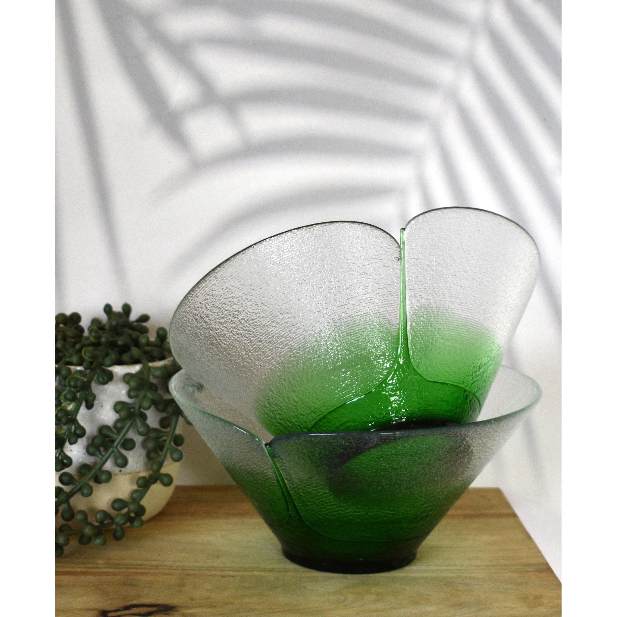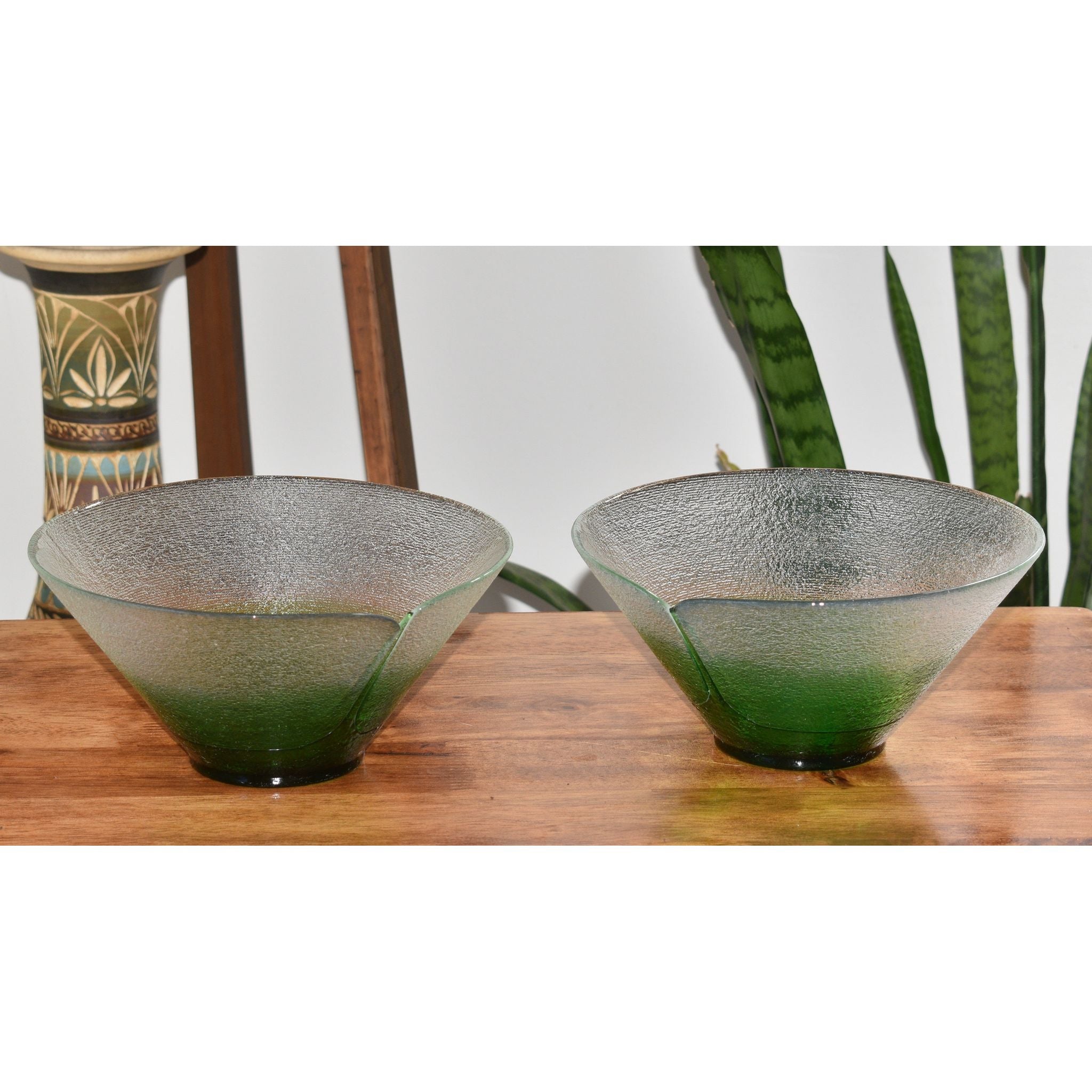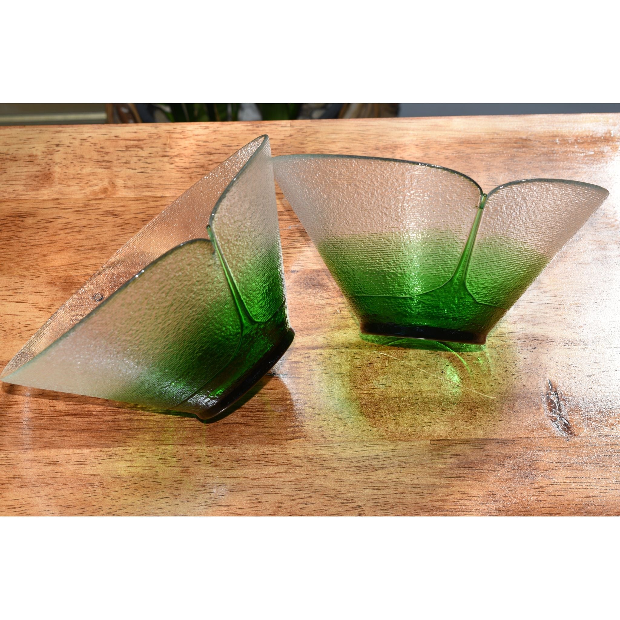 Stunning Bohemia art glass bowls designed by Jiri Suhajek for Crystalex of Czechoslovika. Using a unique centrifugal technique to create the bowl, the exterior has tiny ridged lines covering the clear and graduated green sections. The brilliant green bottom appears to be fused in place. The interior and gentle sloping sides are polished. Created in the 1980's these bowls would make a wonderful addition to any collection.