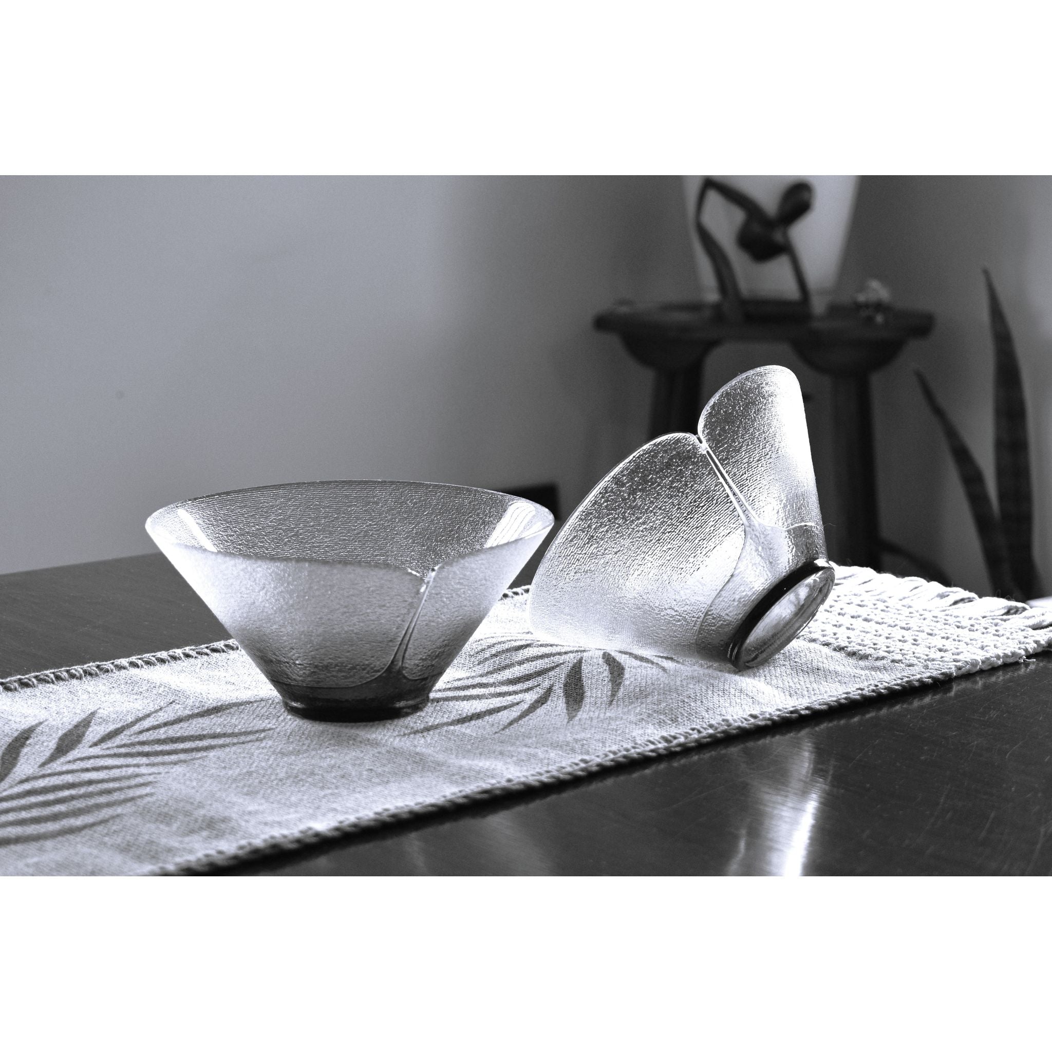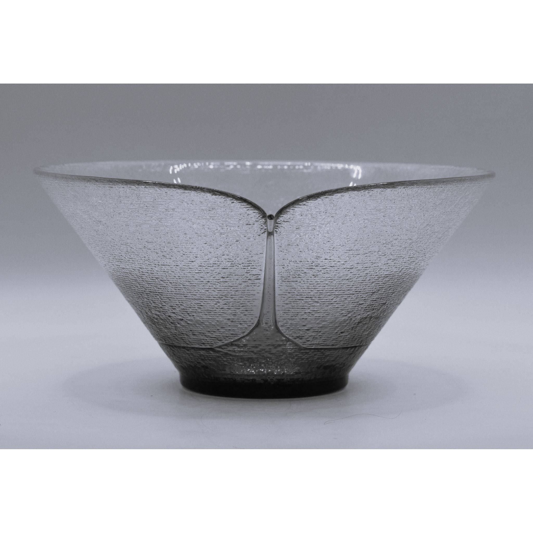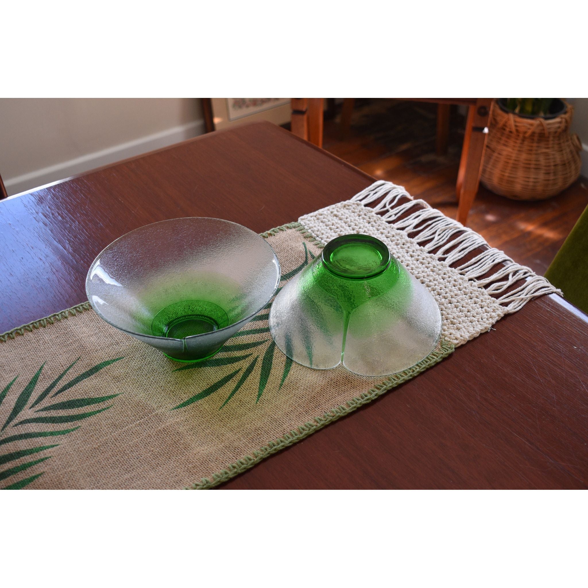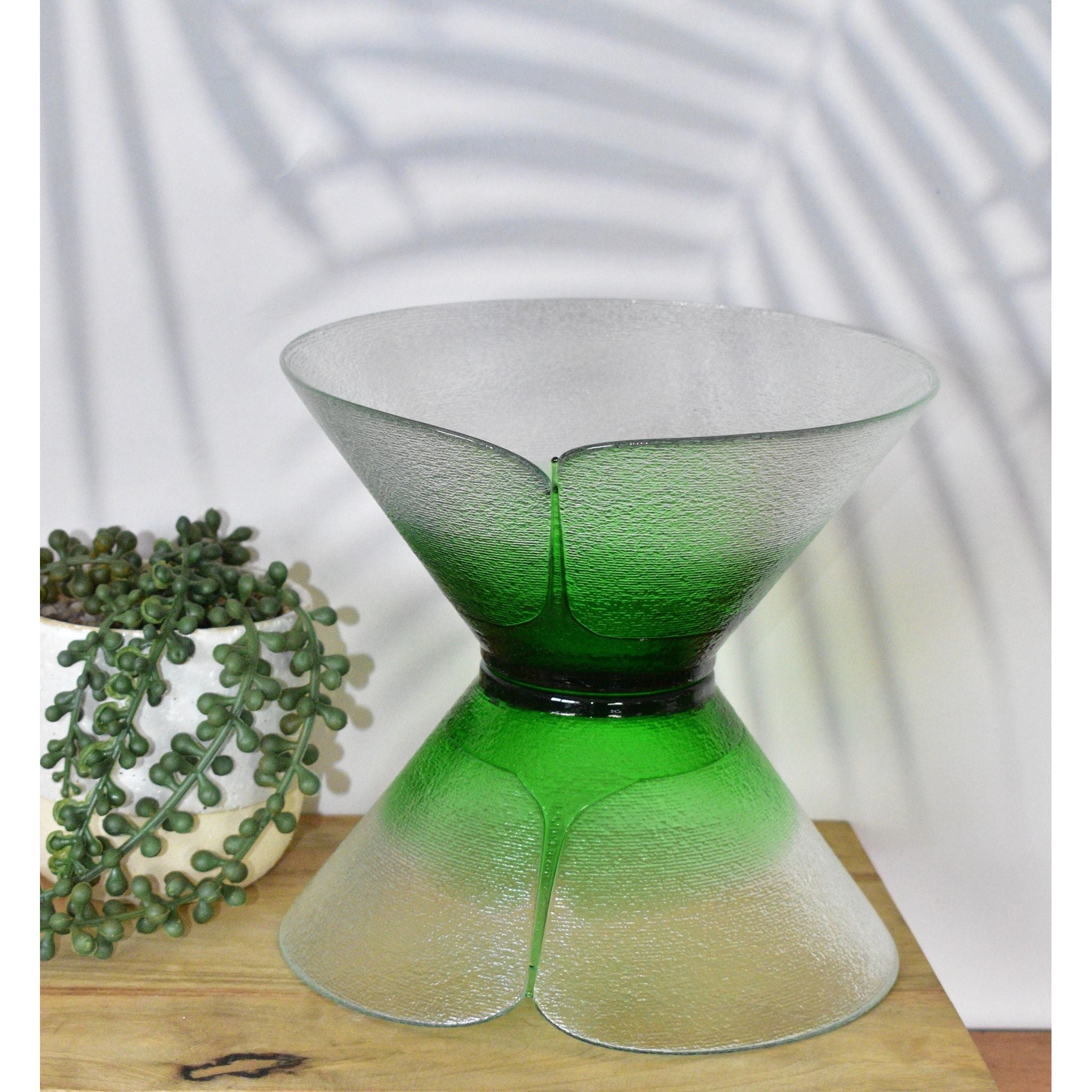 Stunning Bohemia art glass bowls designed by Jiri Suhajek for Crystalex of Czechoslovika. Using a unique centrifugal technique to create the bowl, the exterior has tiny ridged lines covering the clear and graduated green sections. The brilliant green bottom appears to be fused in place. The interior and gentle sloping sides are polished. Created in the 1980's these bowls would make a wonderful addition to any collection.