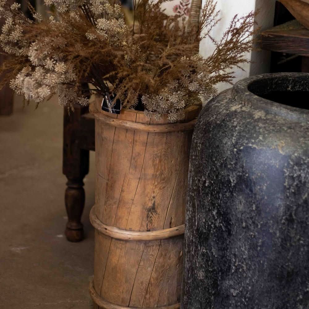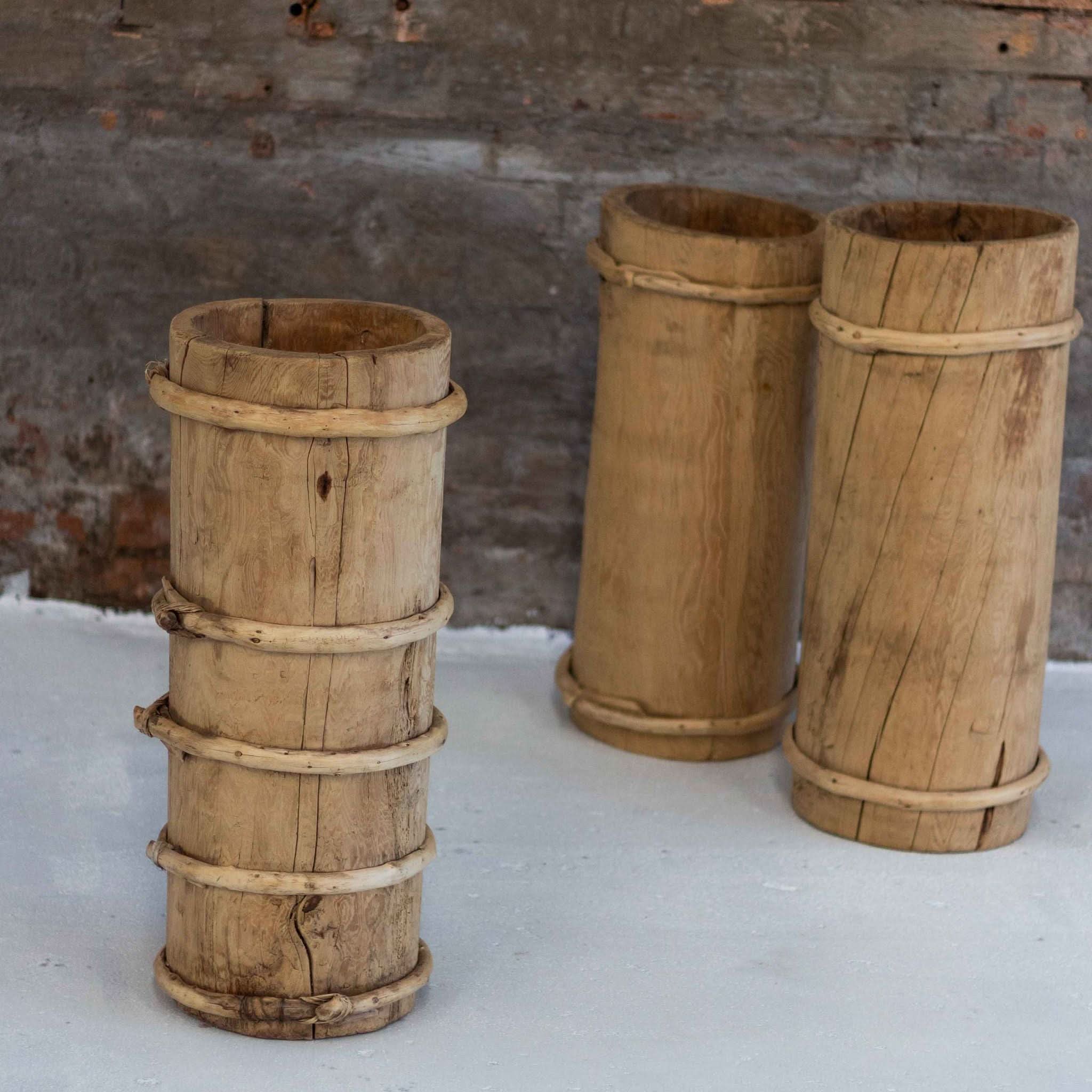 Our vintage Chinese wooden cylinder barrels with hand-carved willow strap ties were traditionally used for churning butter from milk or cream, particularly in rural areas where dairy farming was common. While butter is not as central to Chinese cuisine as it is in many Western cultures, these churns were nonetheless important tools in specific regions, especially in areas with strong ethnic and regional variations in food production, such as Tibetan or Mongolian communities in China