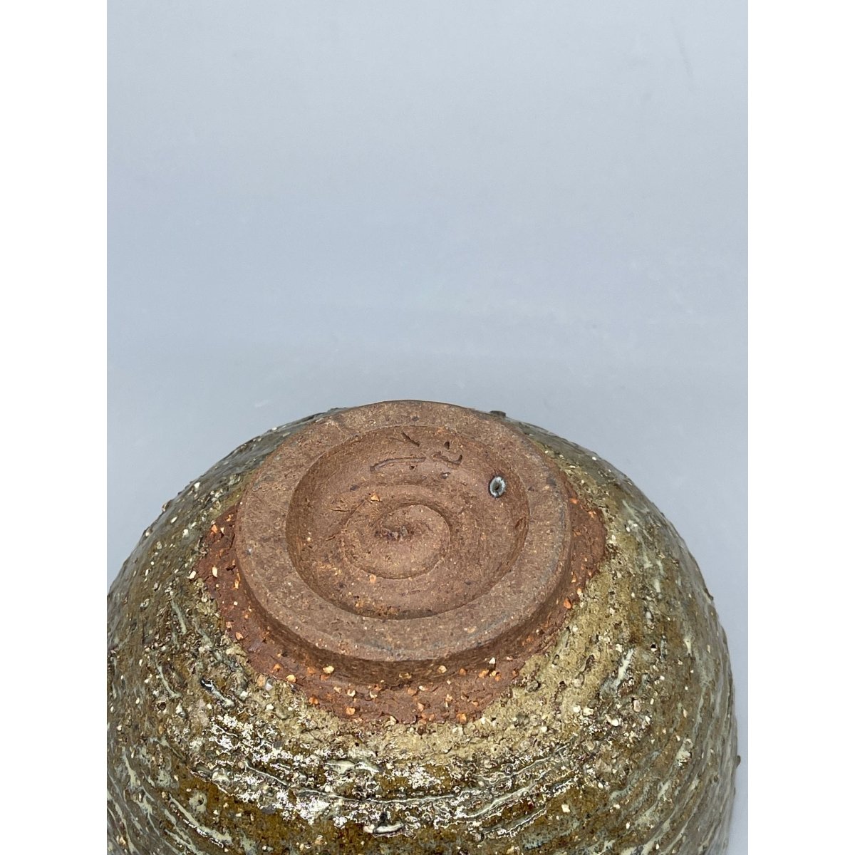 This piece features a Wan-nari (椀形) - wooden bowl shape, with an earthy green and textural finish and an artist signature on its base.