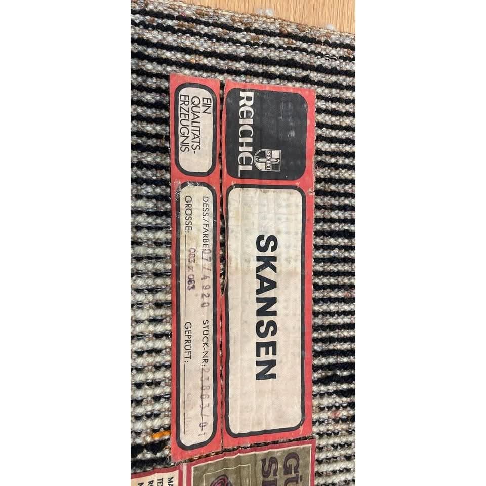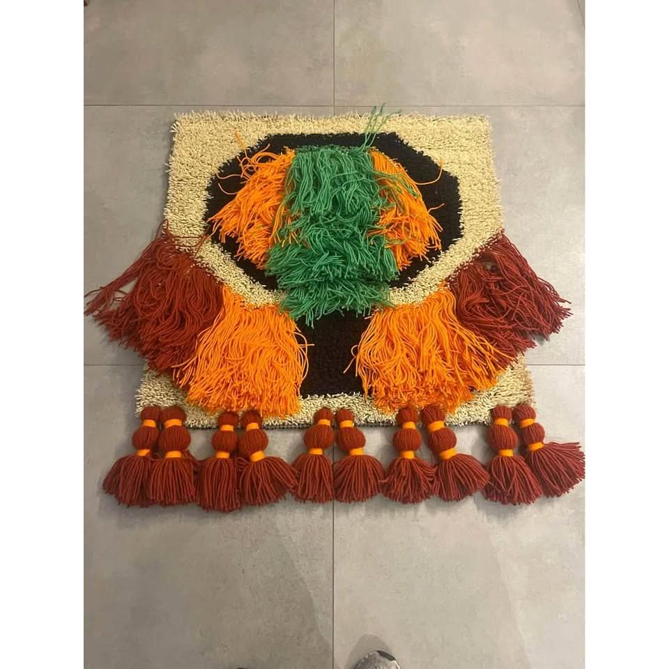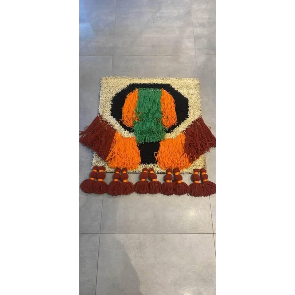 Bold and textured, this 1960s Danish wall hanging features vibrant orange, green and burgundy tones on a natural backdrop. With playful fringe and tassel details, it’s the perfect statement piece to bring warmth and character to any space.