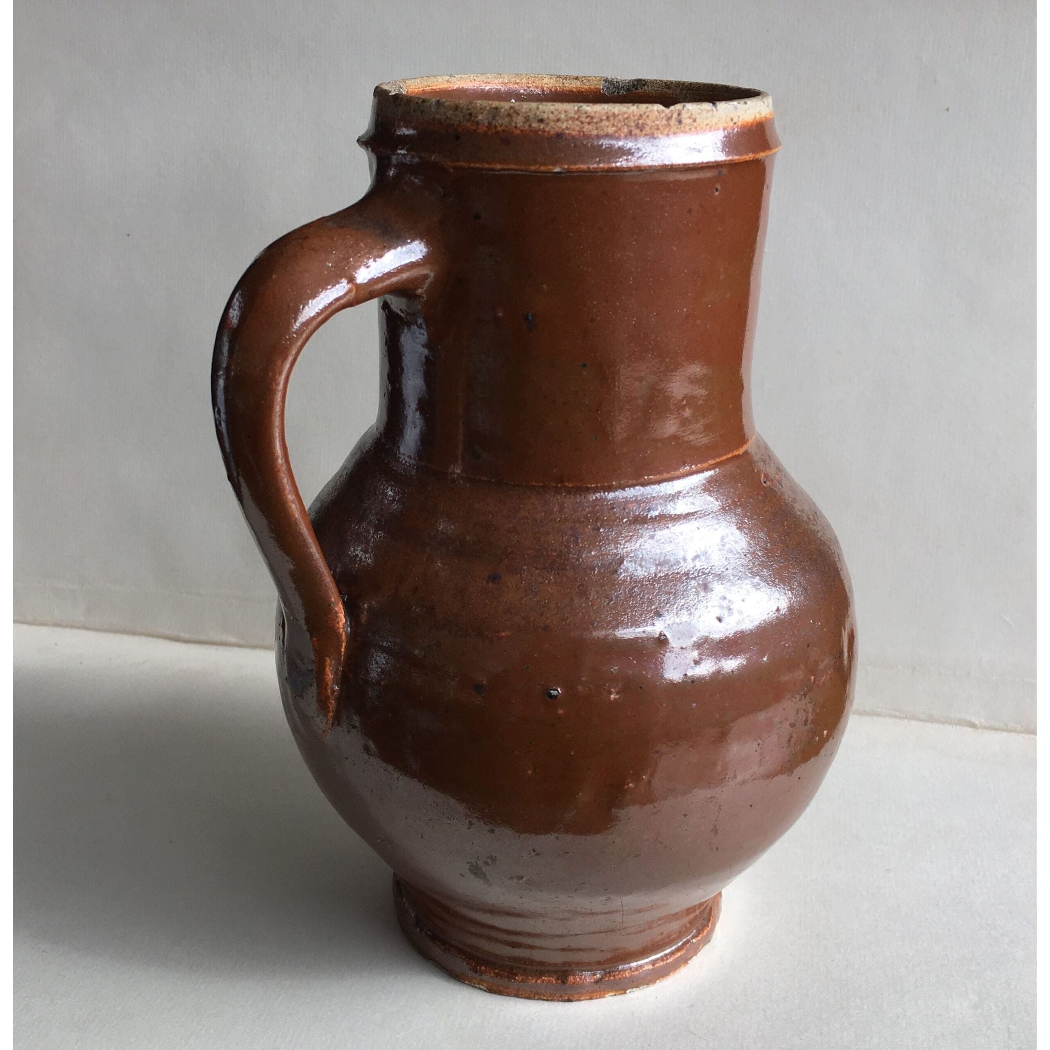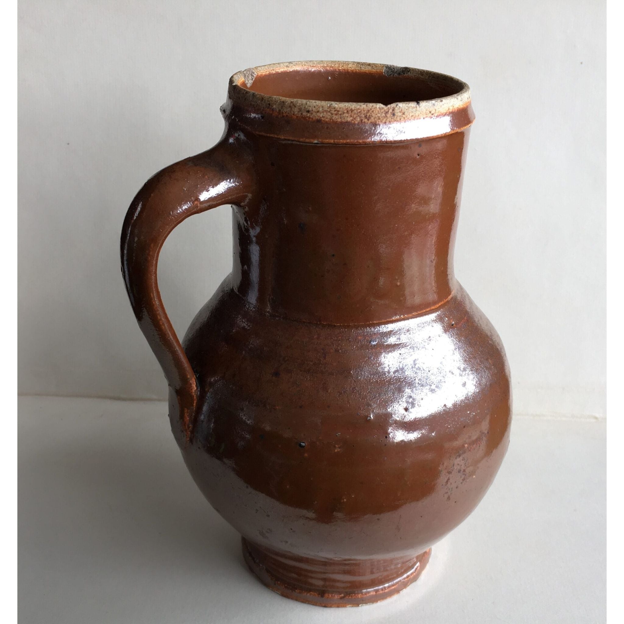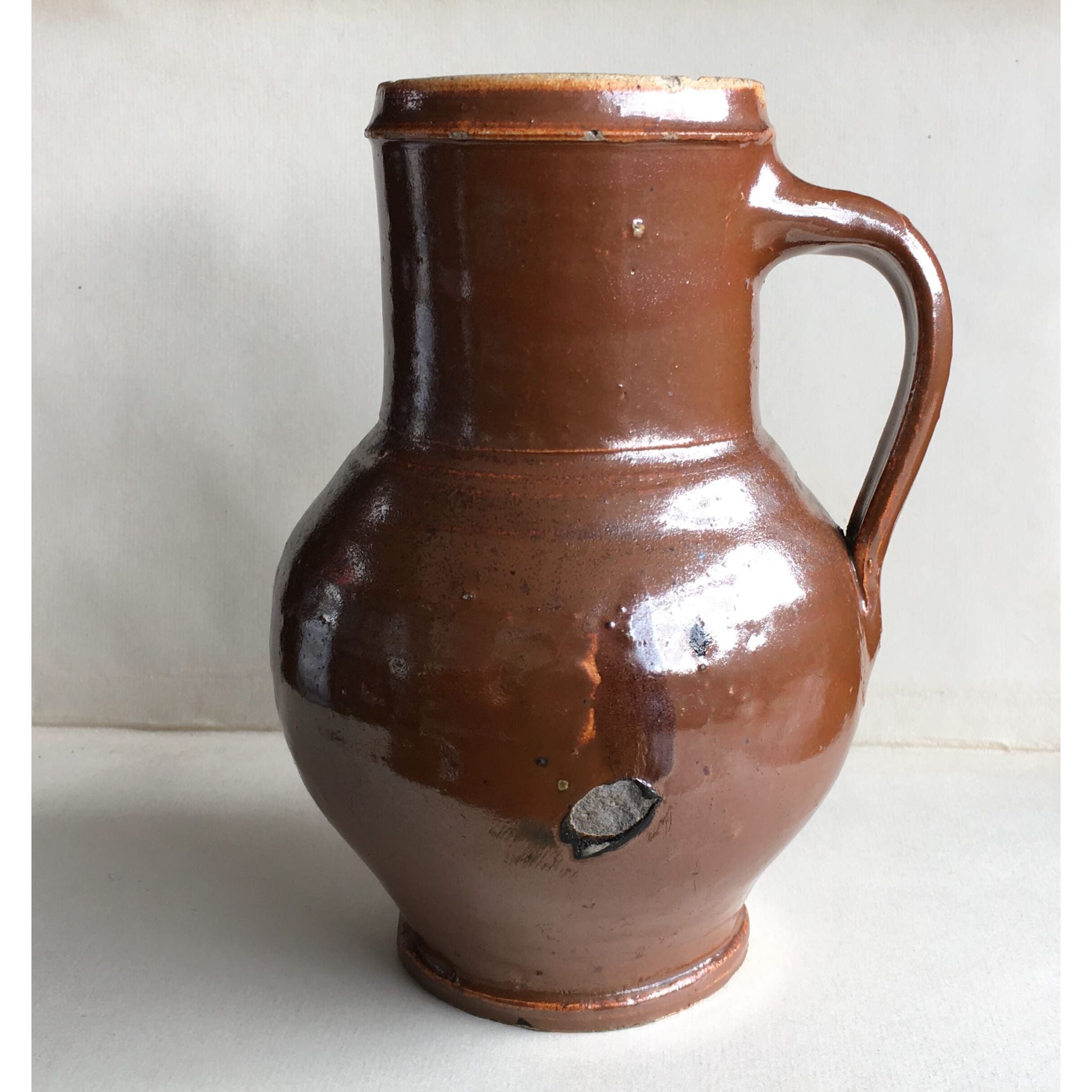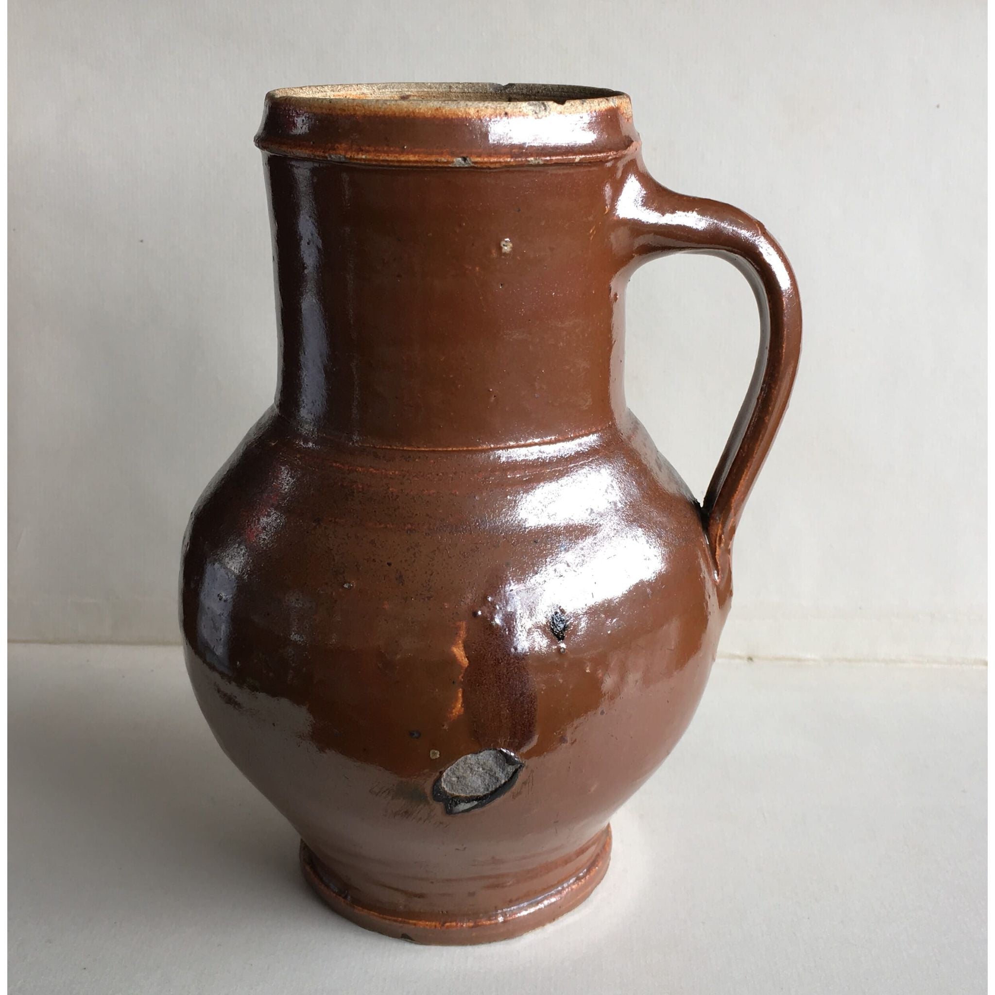 Interesting stoneware mug with rich chocolate glaze with a slight iradescent finish. Probably German, Late 18th/early 19th century