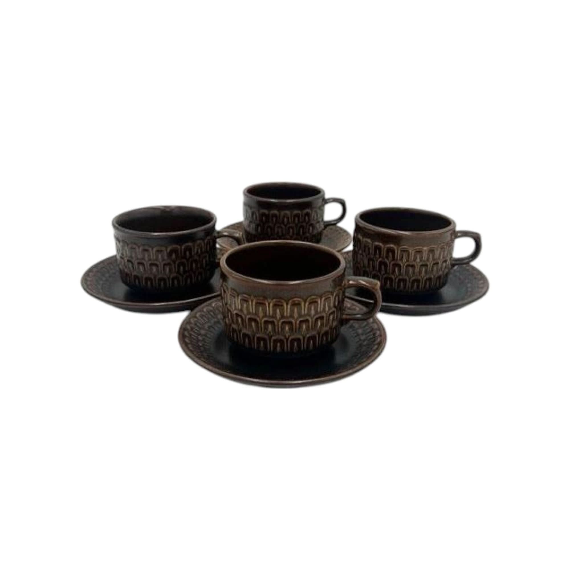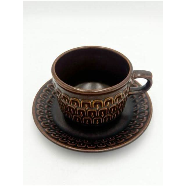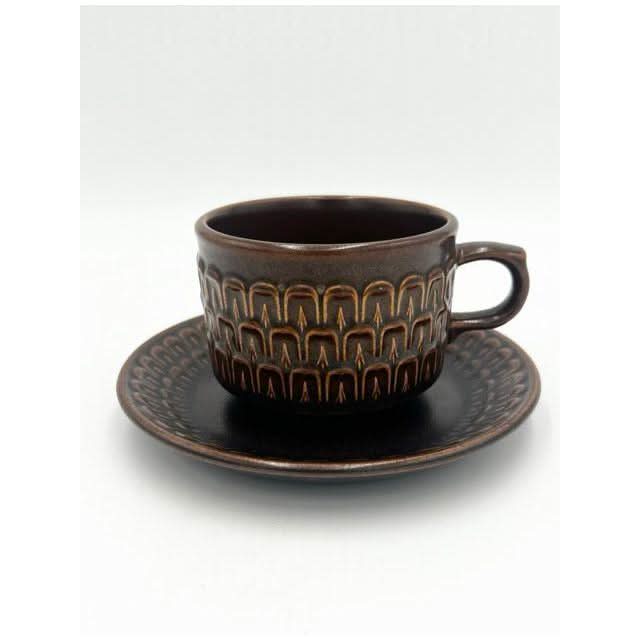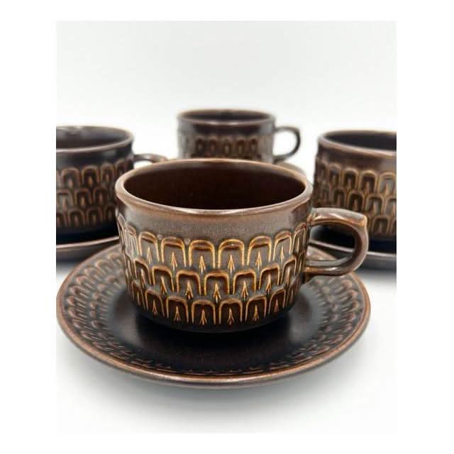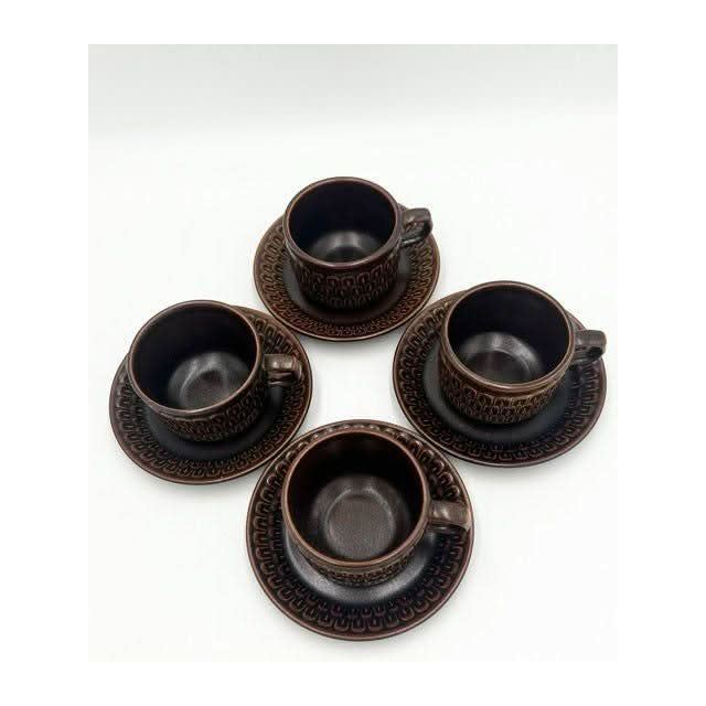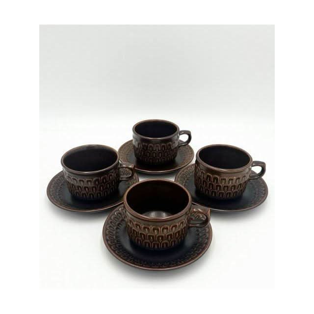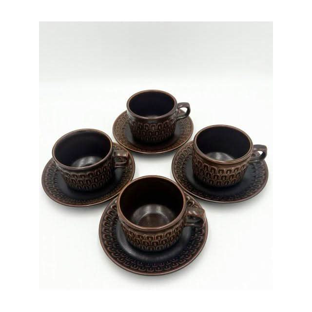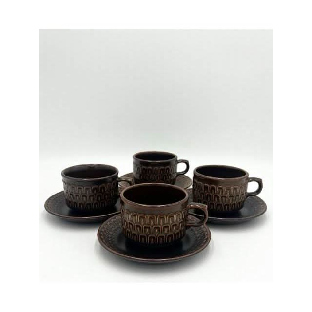 Elevate your tableware collection with this vintage set of four coffee or tea cups with matching saucers from the iconic Wedgwood ‘Pennine’ range. Crafted in England, these durable stoneware pieces feature a rich brown glaze and a distinct textured arch pattern, blending 1970s charm with timeless quality.