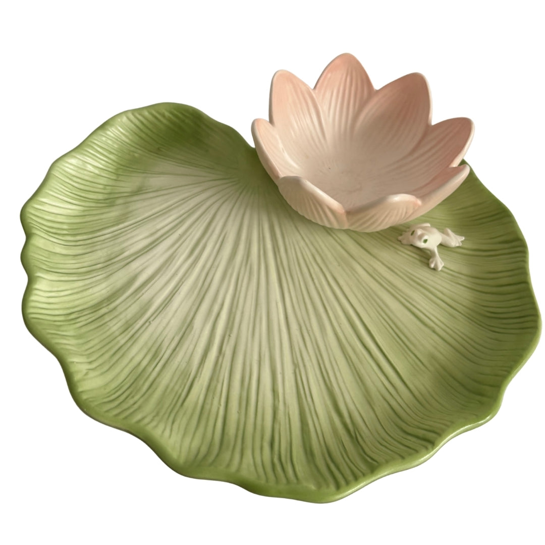 This mid-century modern ceramic frog and lotus plate or 'chip and dip' platter by FITZ & FLOYD is made in Japan and is in excellent condition. It measures approx. 29cm
