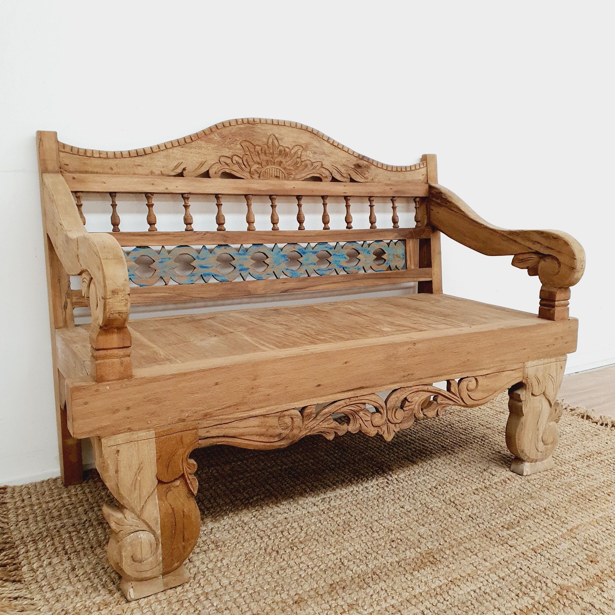 This one of a kind vintage Balinese hand carved daybed bench seat has plenty of WOW factor. Crafted from teak and adorned with intricate carvings and a touch of blue, this bench seat exudes a plenty of vintage charm. Perfect for lounging or as a statement piece, this bench seat is a must-have for any design and vintage lover.