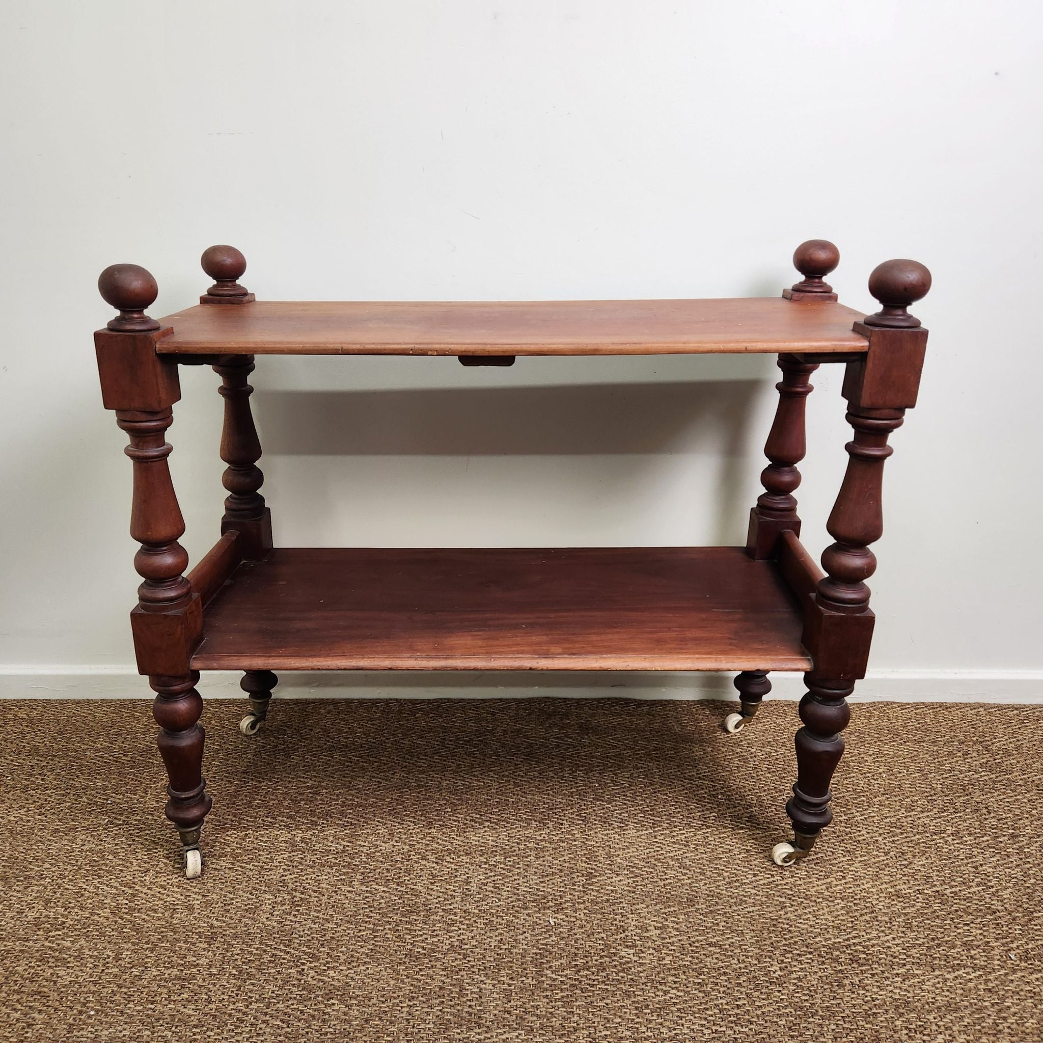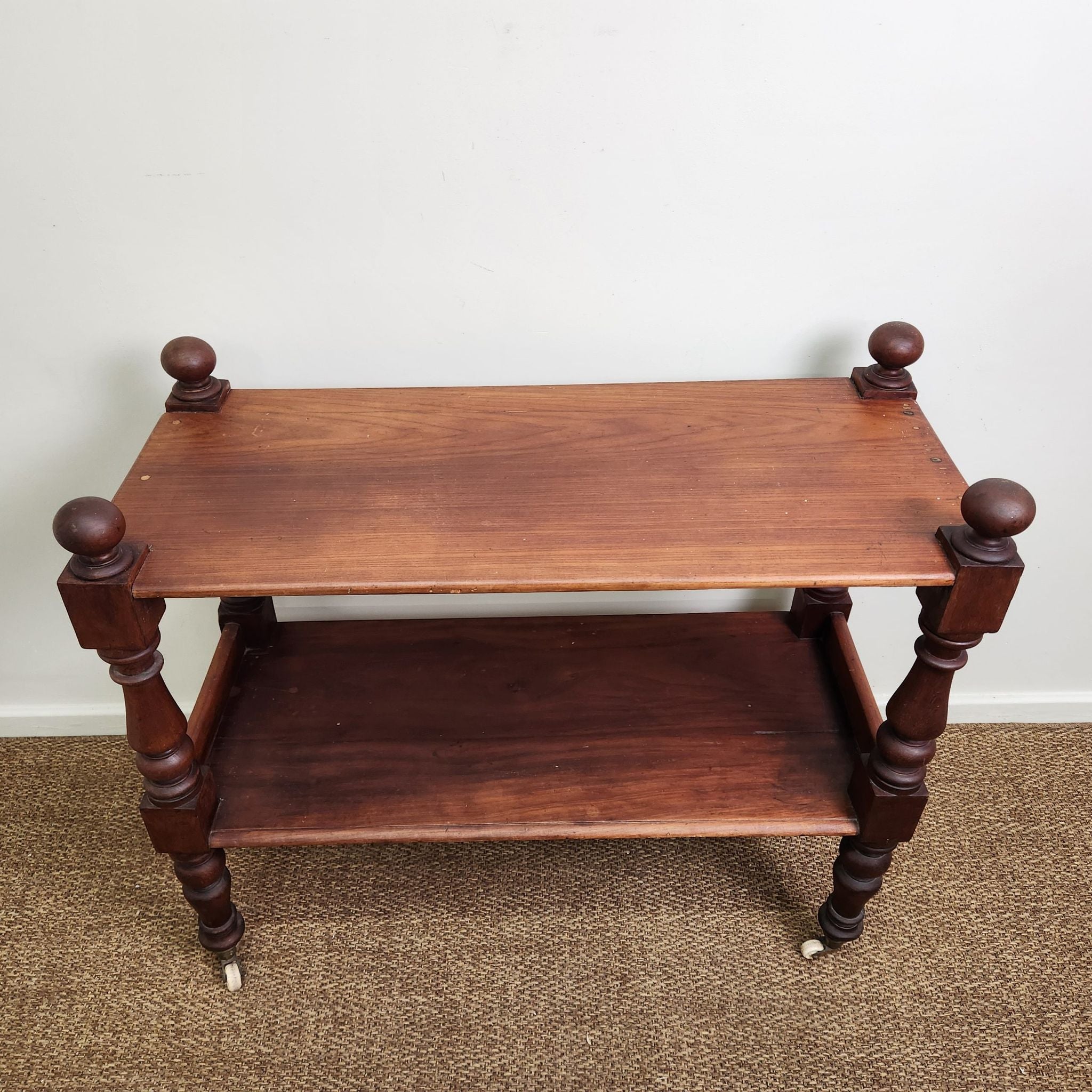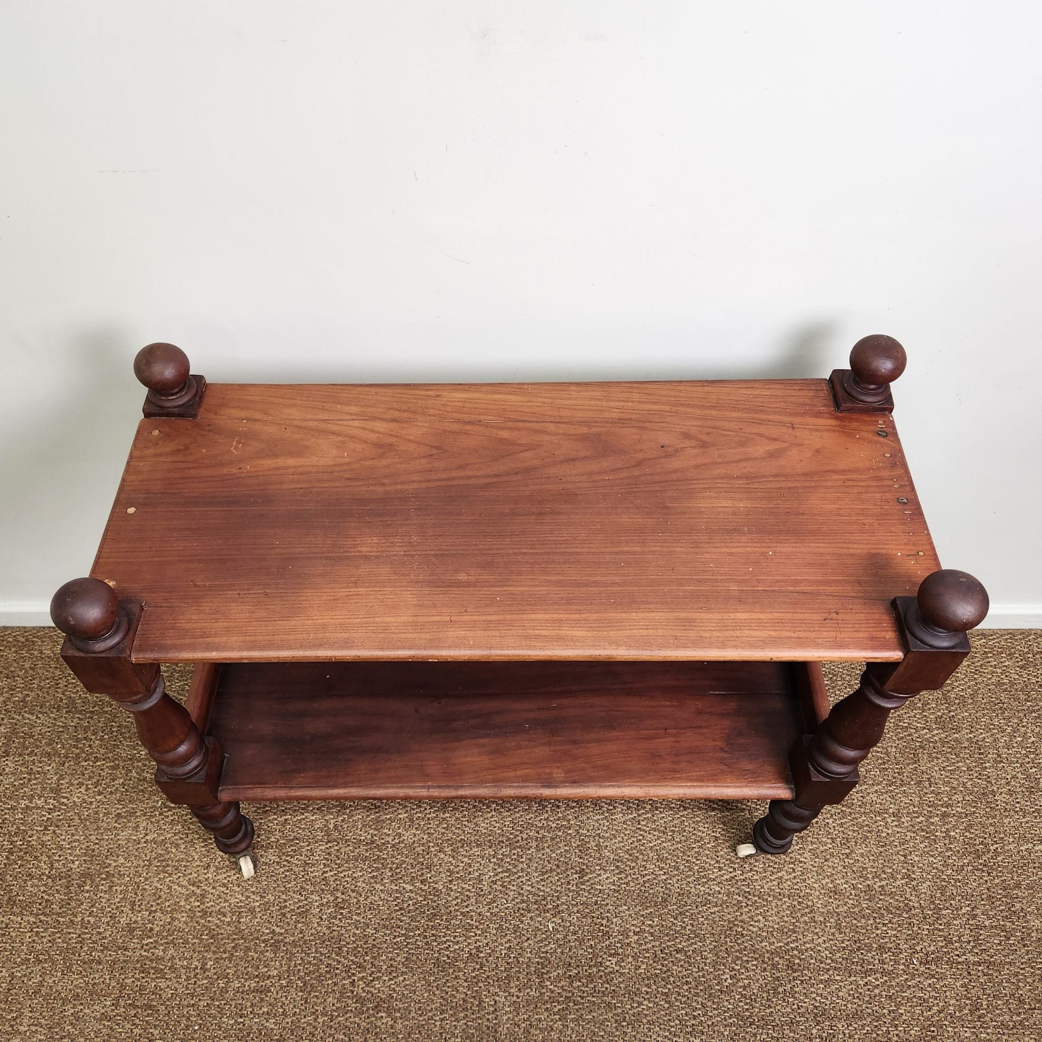 This antique Australian cedar display trolley features two tiers and turned legs, showcasing simple craftsmanship and the warm tones of cedar. Its compact form and classic detailing make it a versatile piece for layered, traditional, or vintage-inspired interiors.
