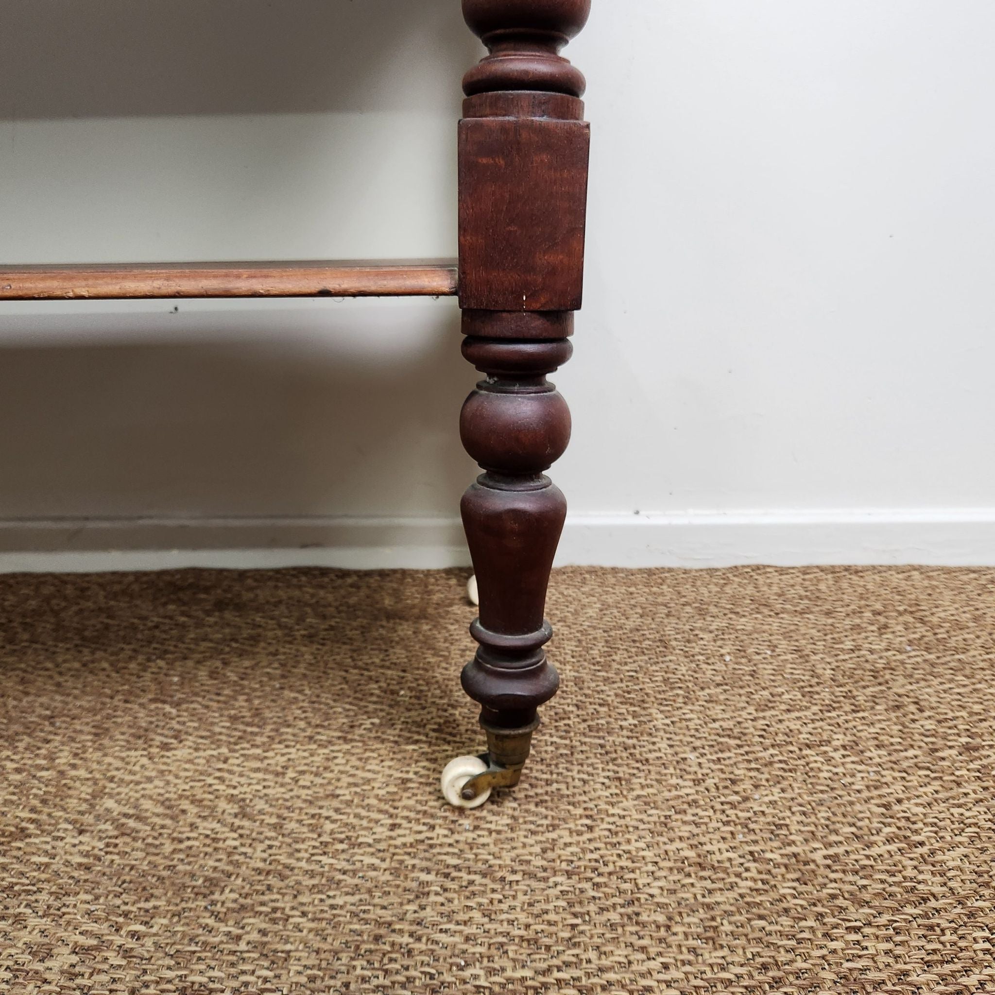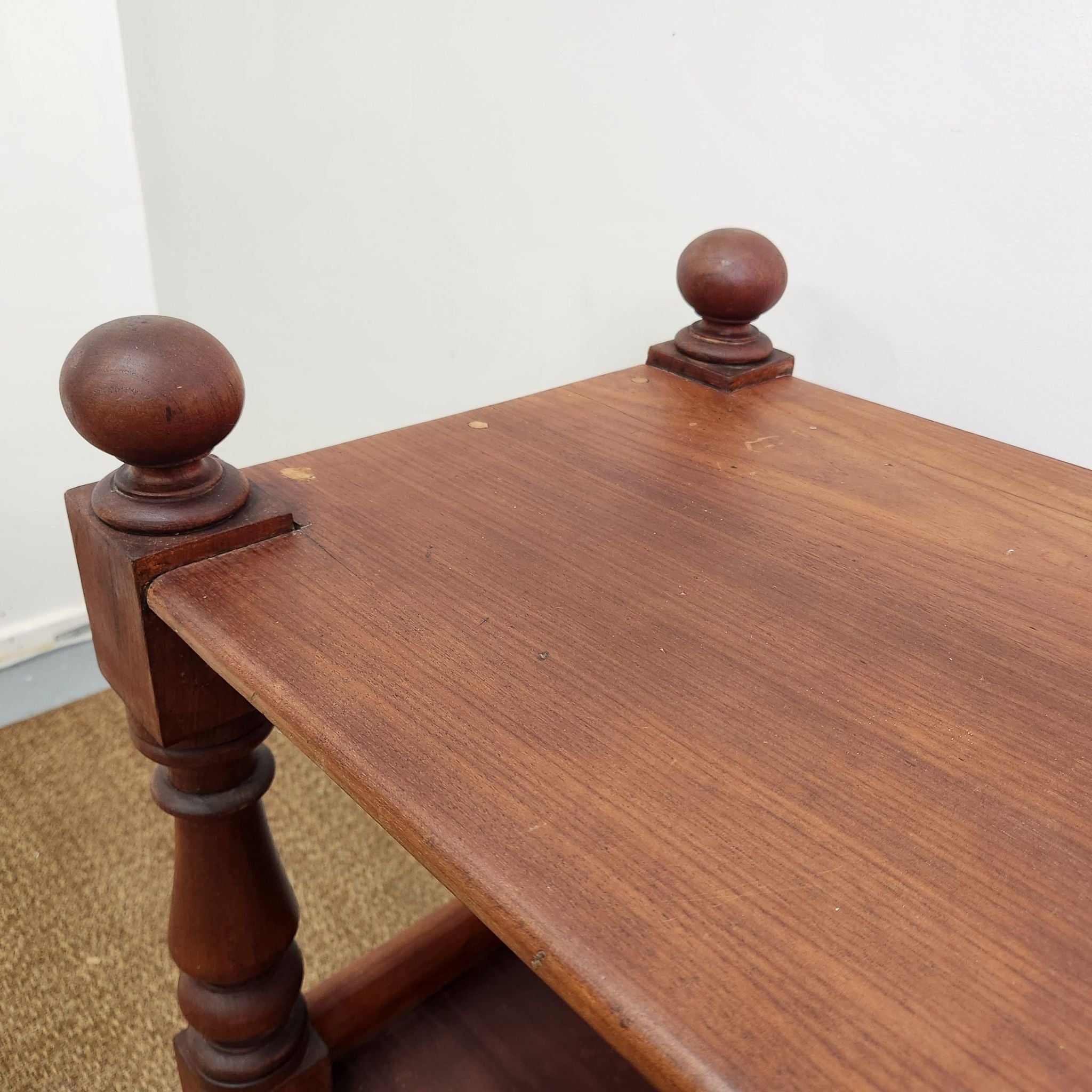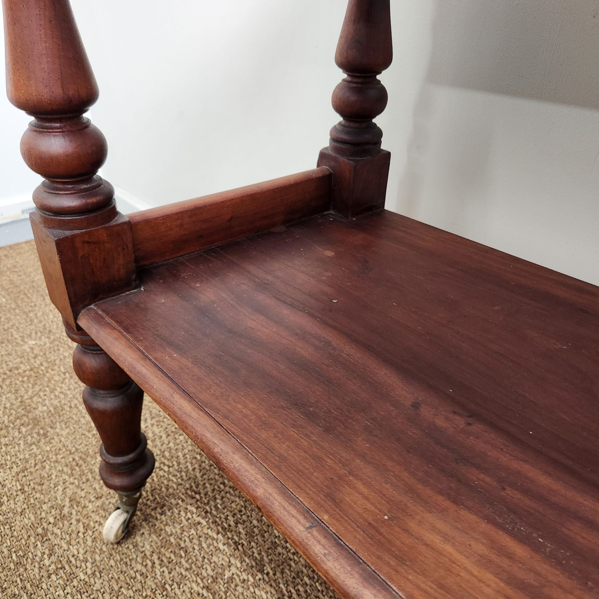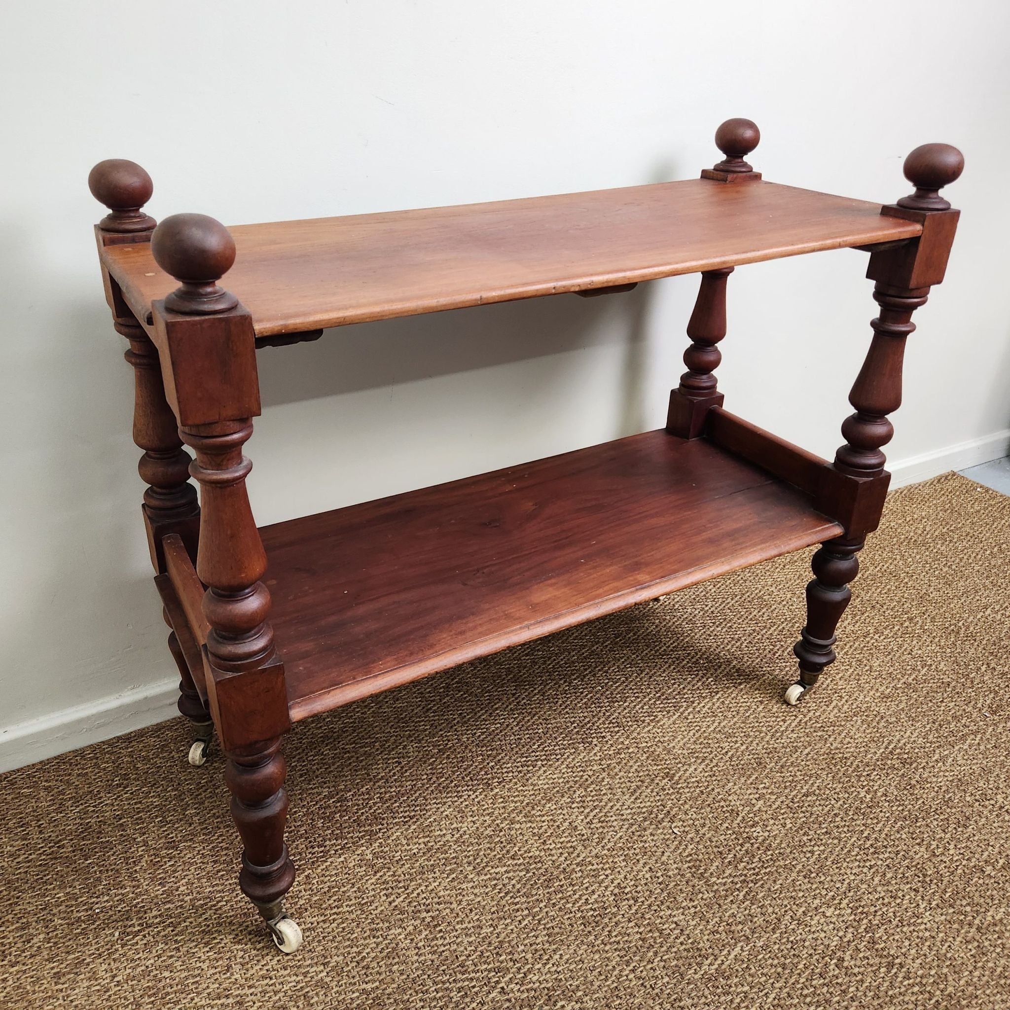 This antique Australian cedar display trolley features two tiers and turned legs, showcasing simple craftsmanship and the warm tones of cedar. Its compact form and classic detailing make it a versatile piece for layered, traditional, or vintage-inspired interiors.