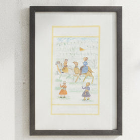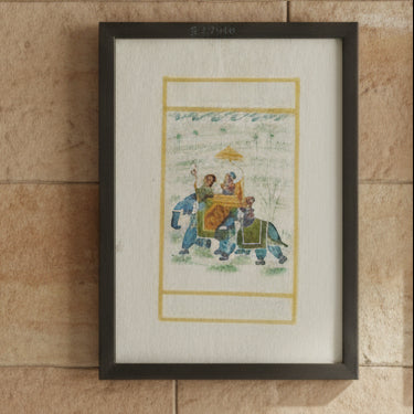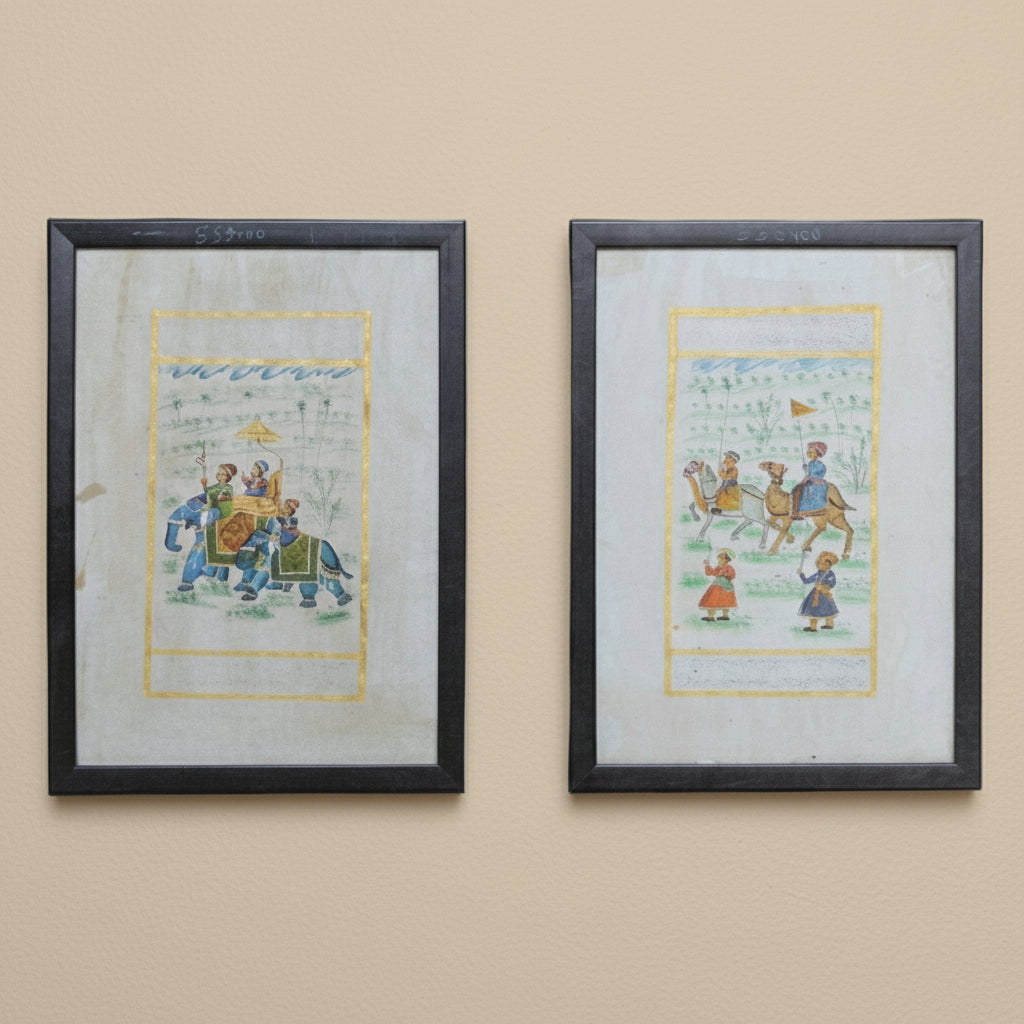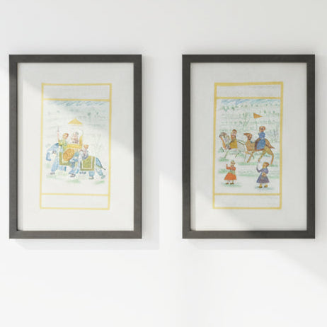 This set features two beautifully framed hand drawings showcasing Indian miniature painting style artwork. Each piece depicts intricate scenes from royal courts, epics, or daily life, rendered in the traditional miniature painting technique.