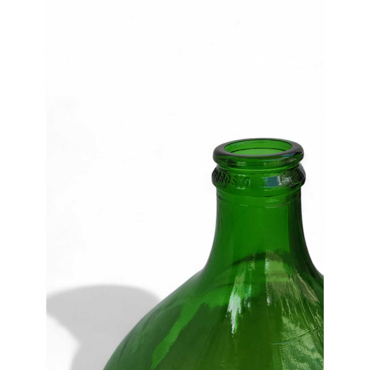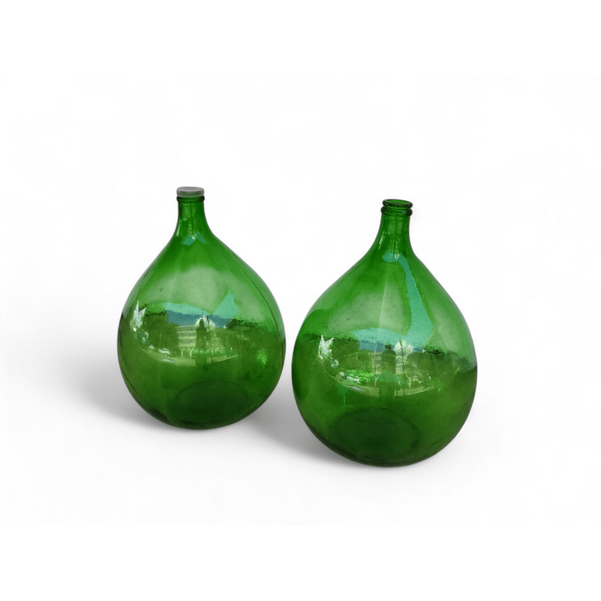 Italian green glass demijohns, also known as "damigiana" or "carboy," are large, rounded glass vessels traditionally used for fermentation, aging, and storing beverages such as wine, cider, and vinegar.