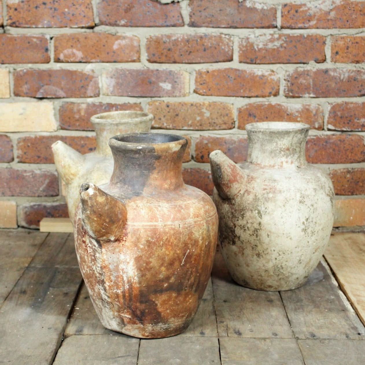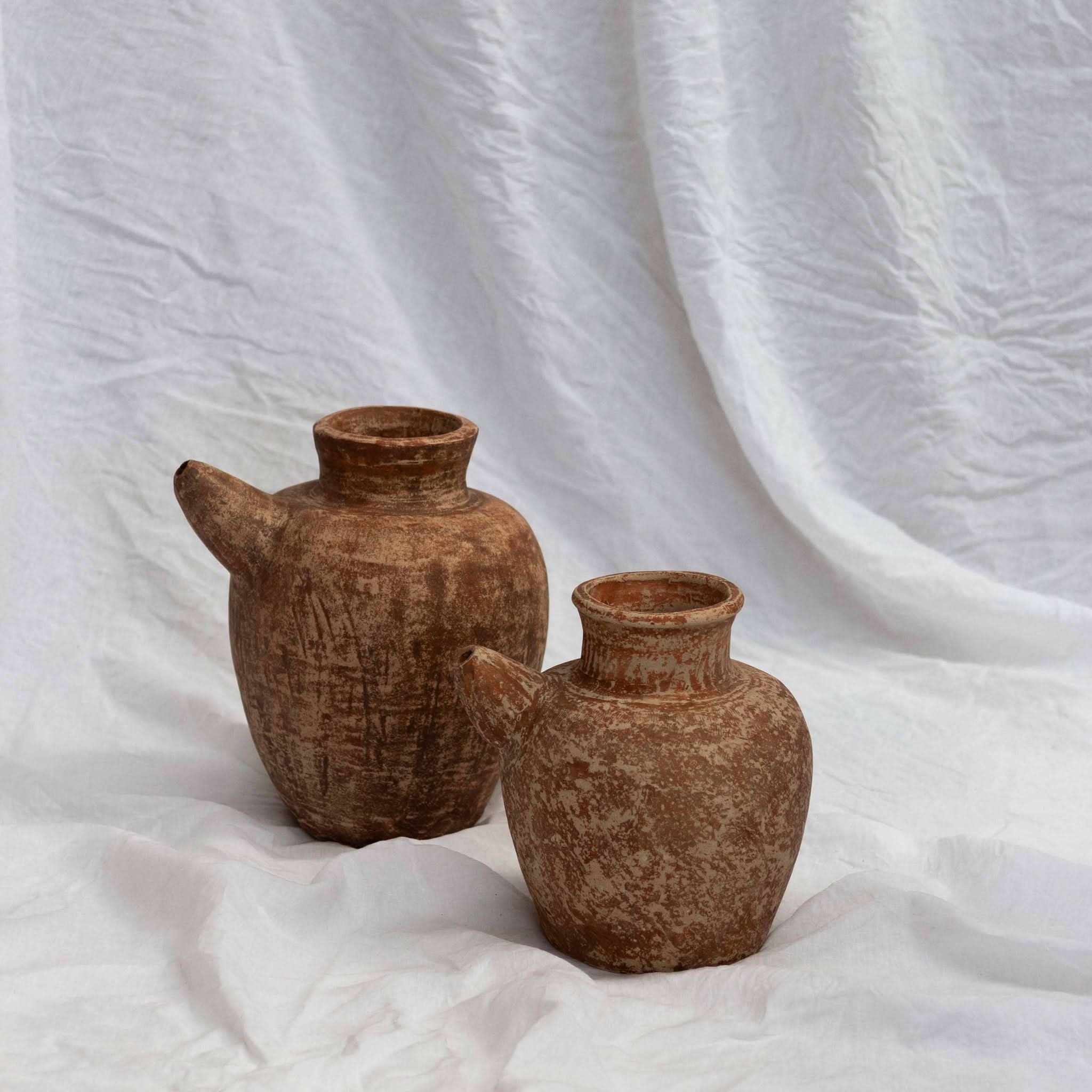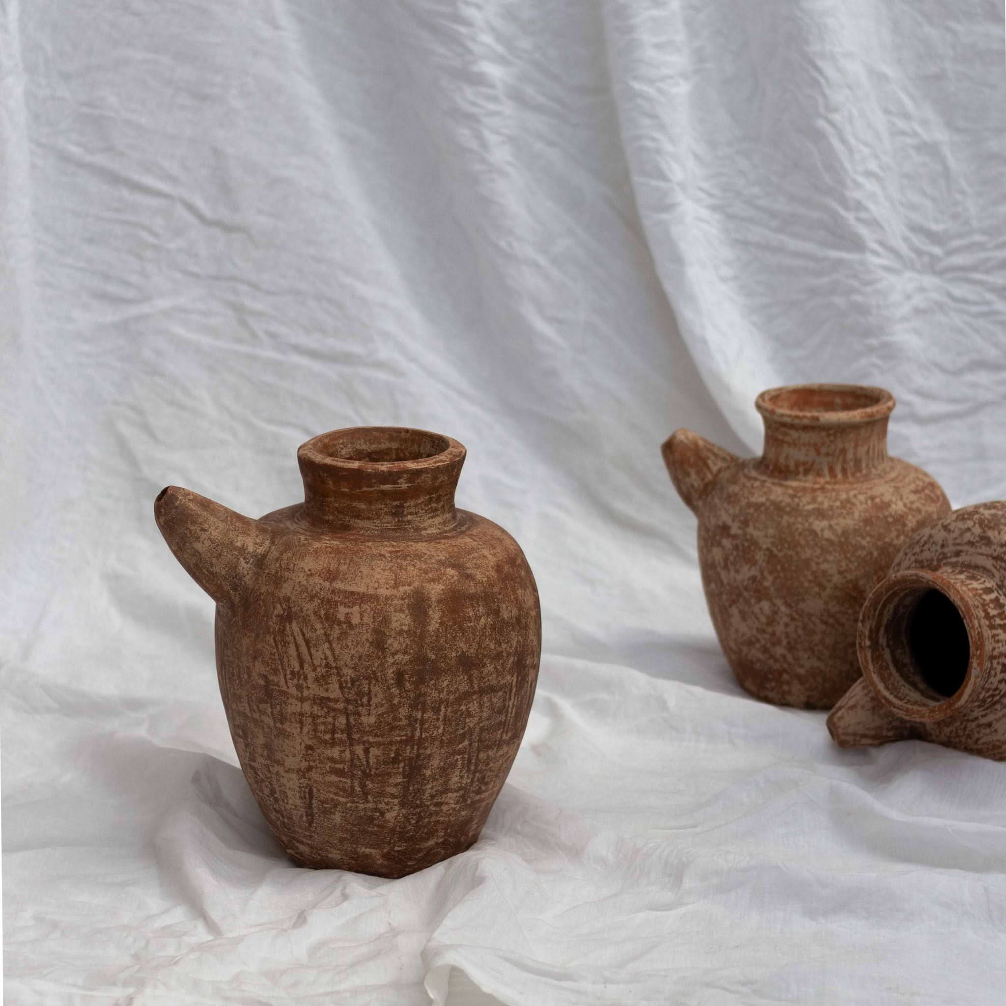 Hand-formed with distinctive spouts and rounded bodies, these jugs are as sculptural as they are functional. The surface reveals layers of age, subtle markings, faded patterns, and natural imperfections that make each one entirely unique.