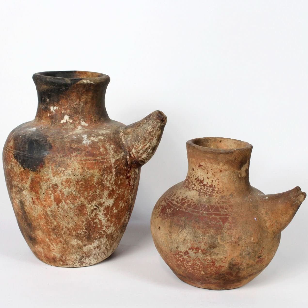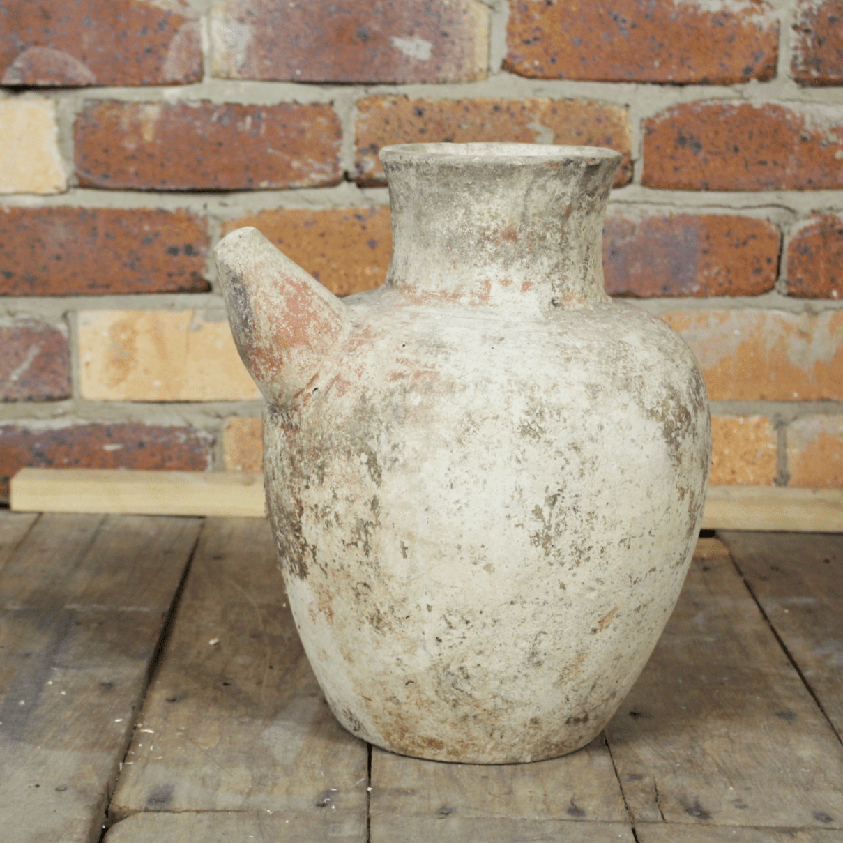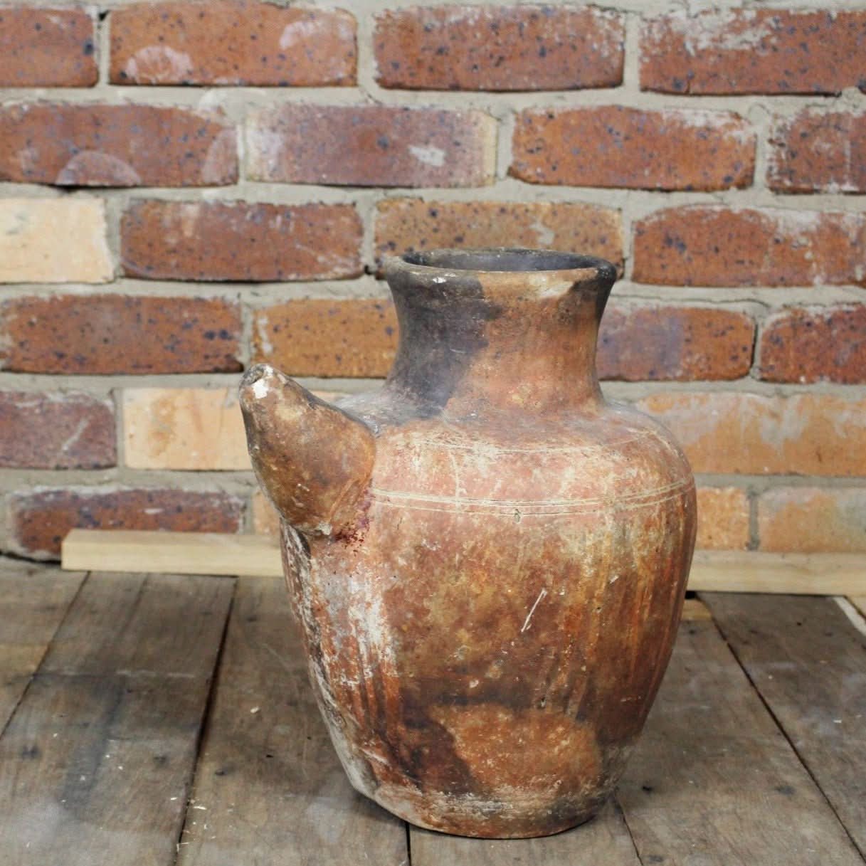 Hand-formed with distinctive spouts and rounded bodies, these jugs are as sculptural as they are functional. The surface reveals layers of age, subtle markings, faded patterns, and natural imperfections that make each one entirely unique.