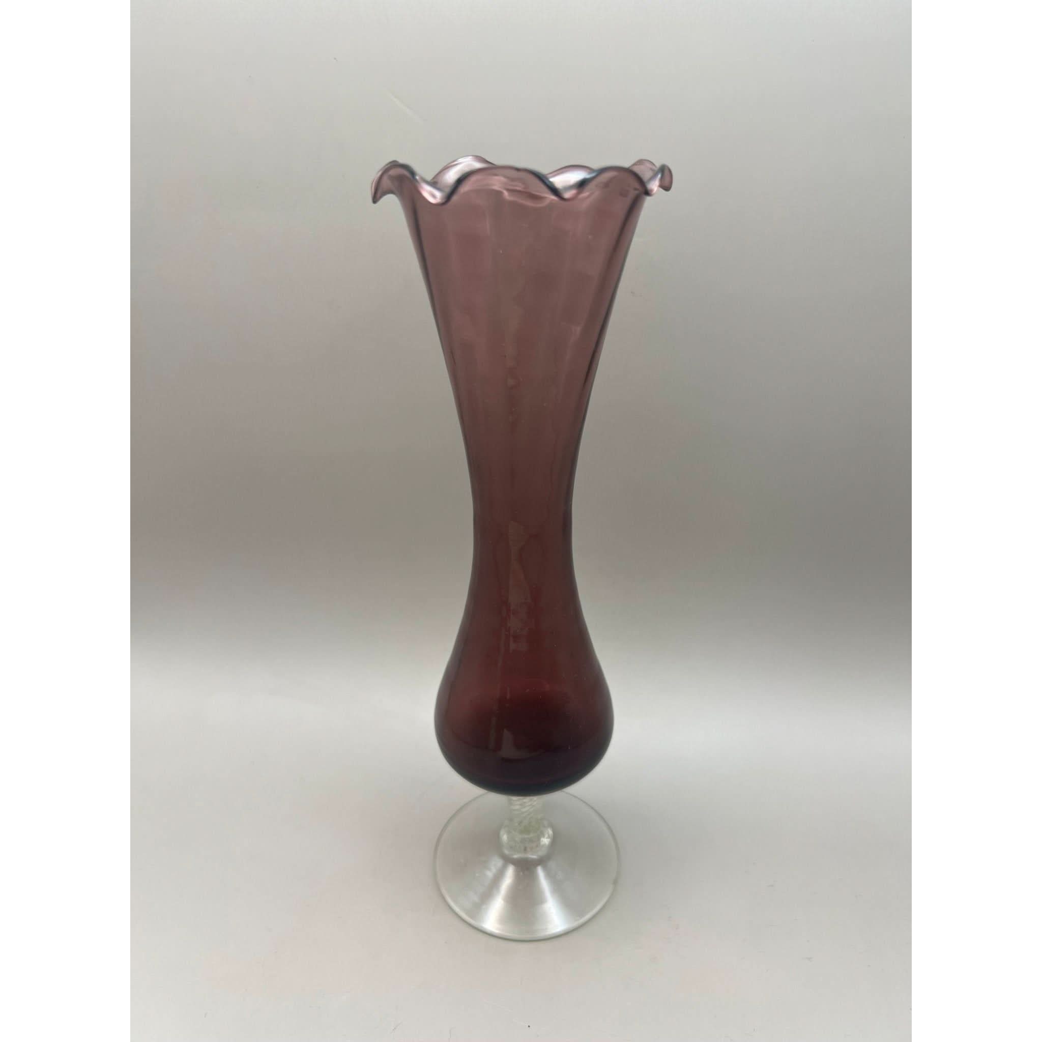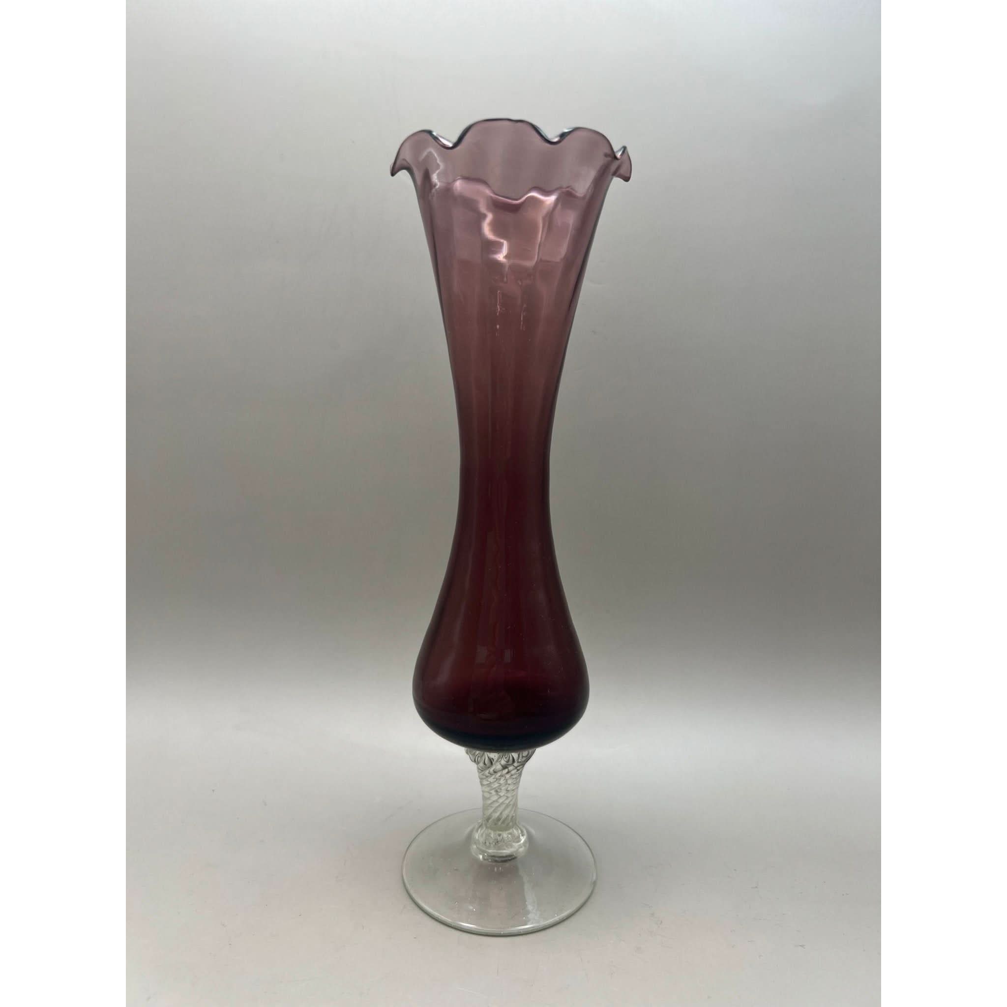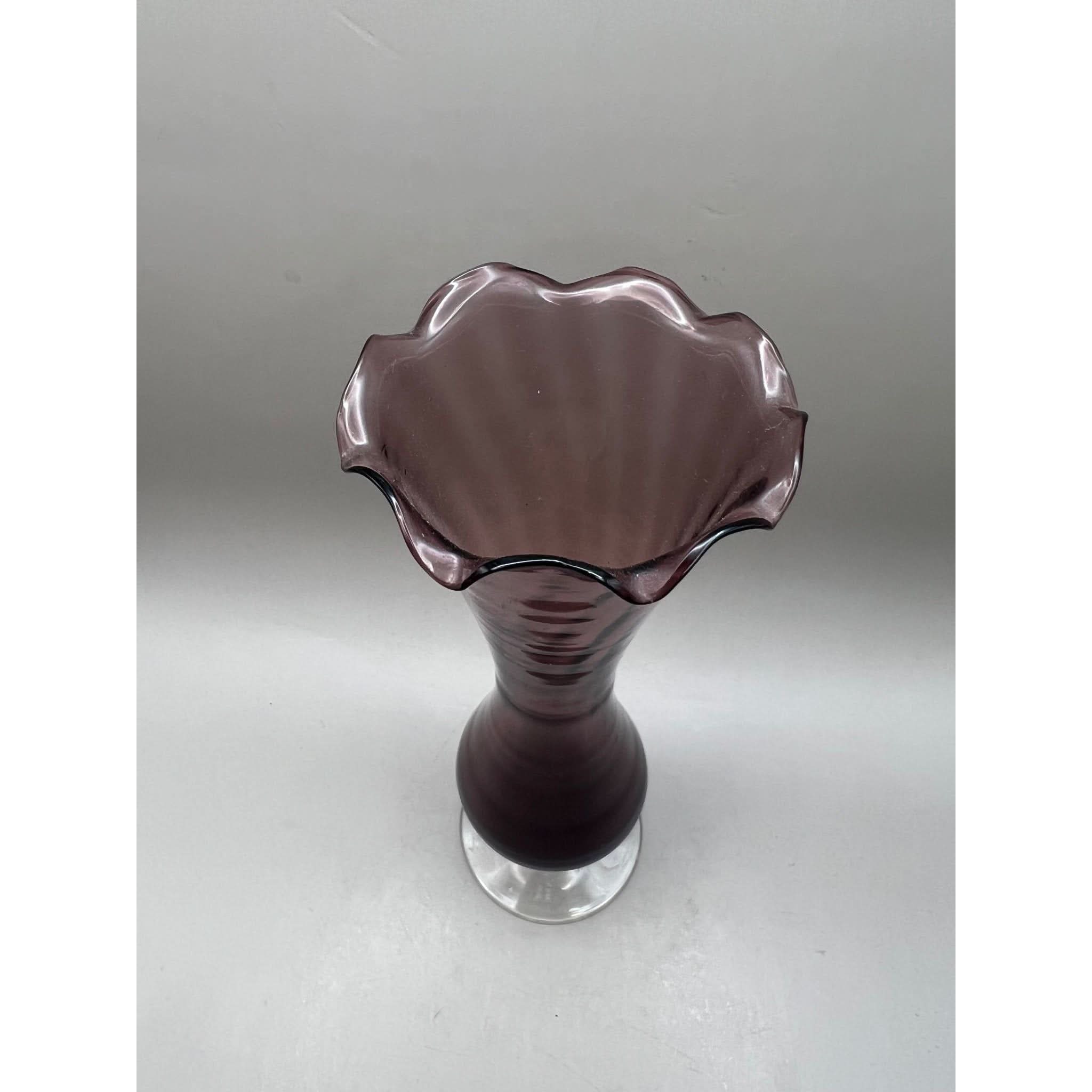 This vase has been produced in an amethyst glass with a fluted top and a clear twisted stem.