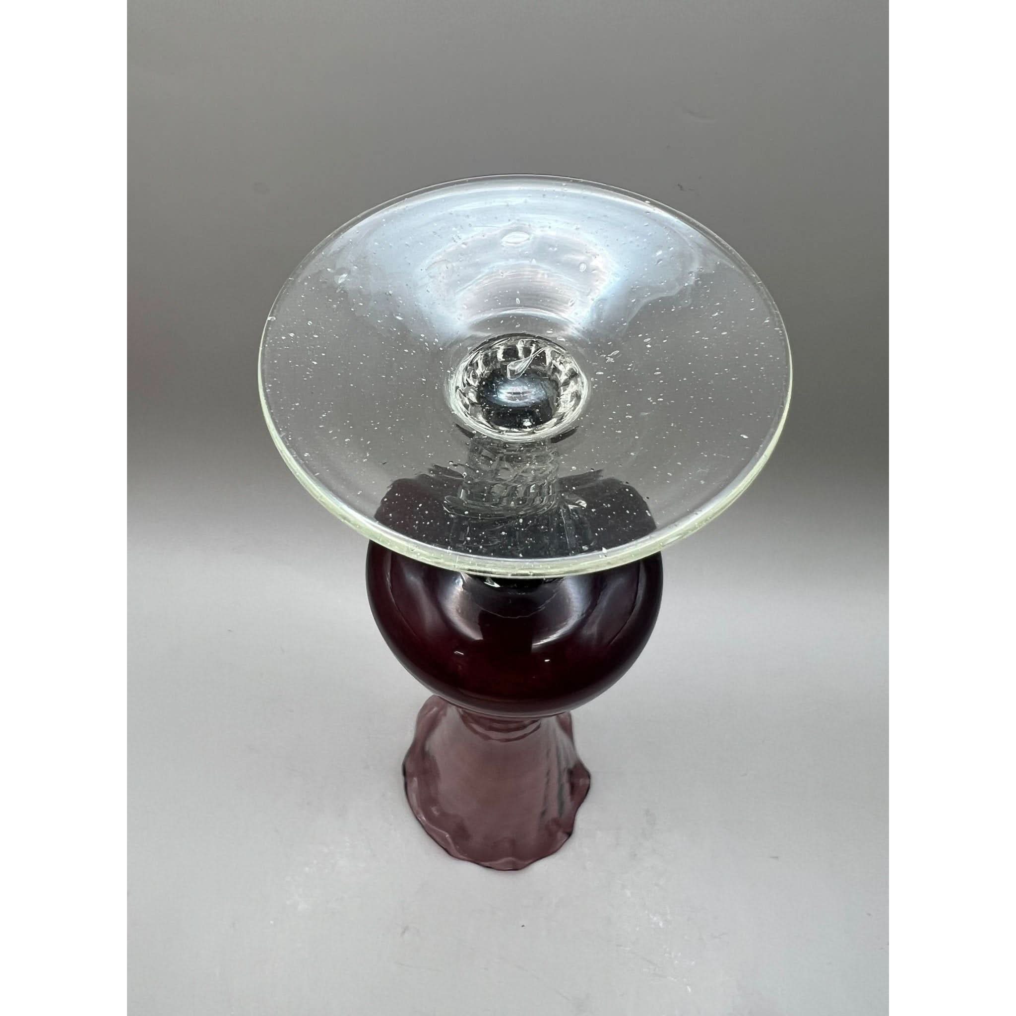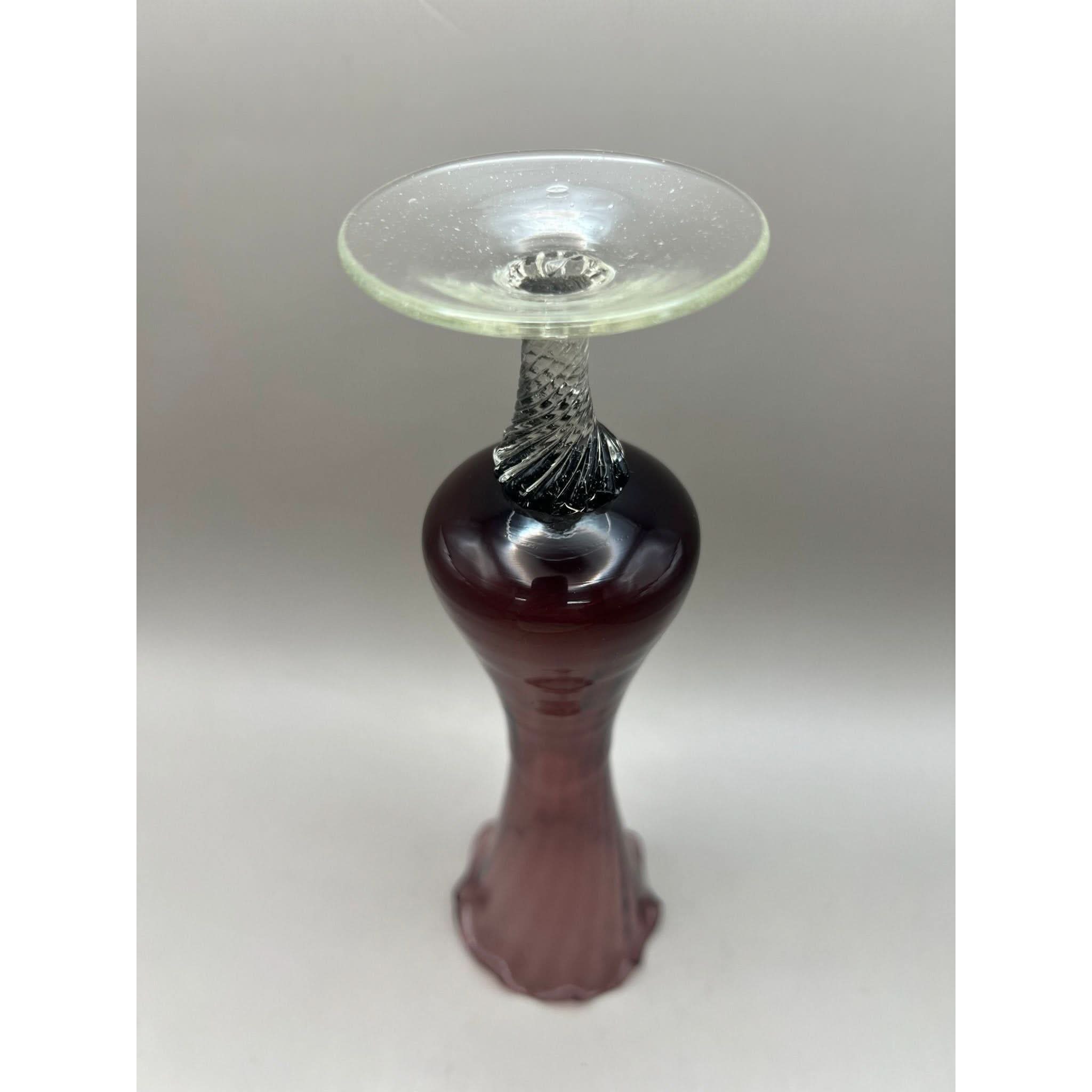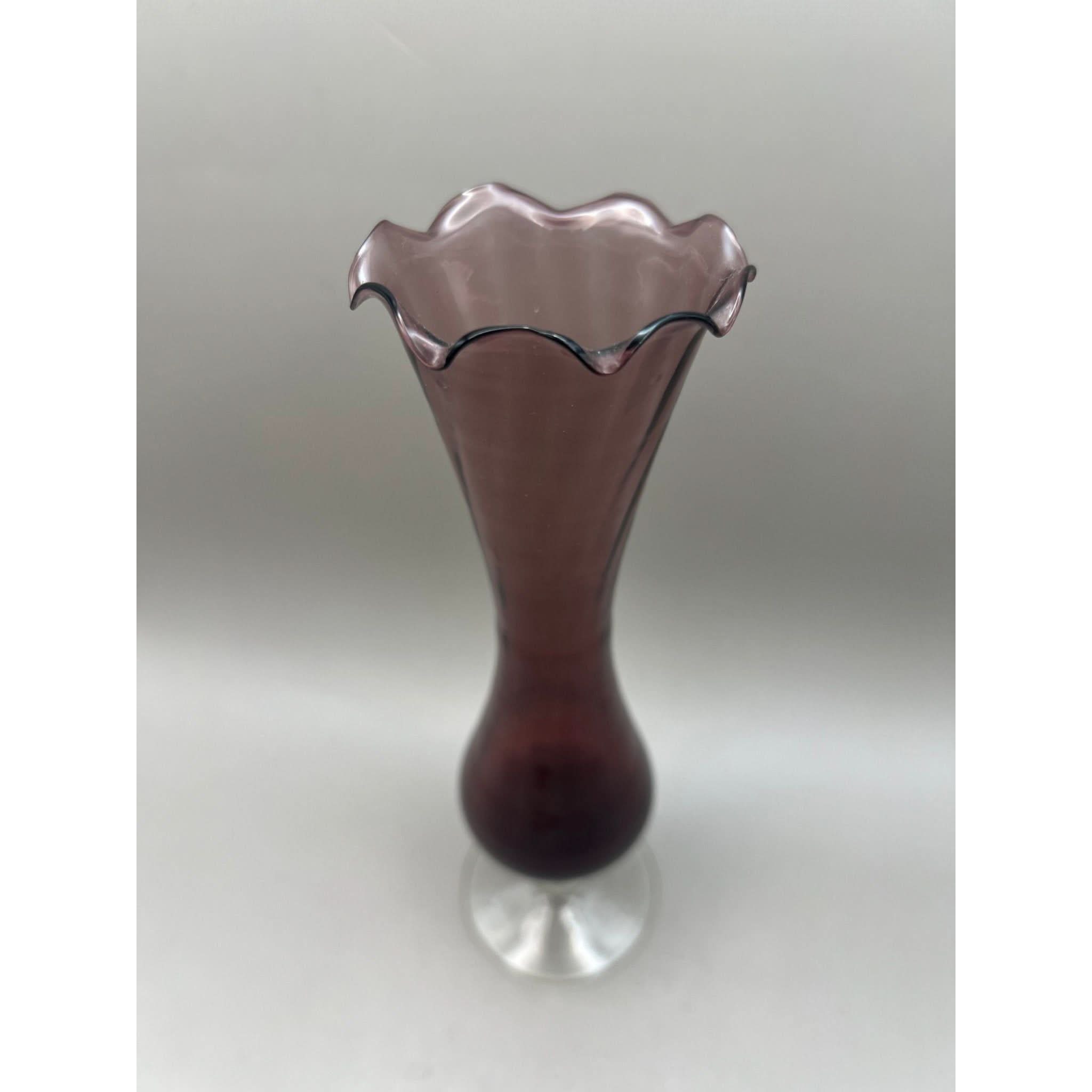 This vase has been produced in an amethyst glass with a fluted top and a clear twisted stem.