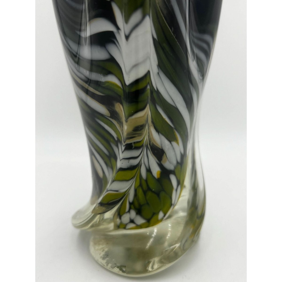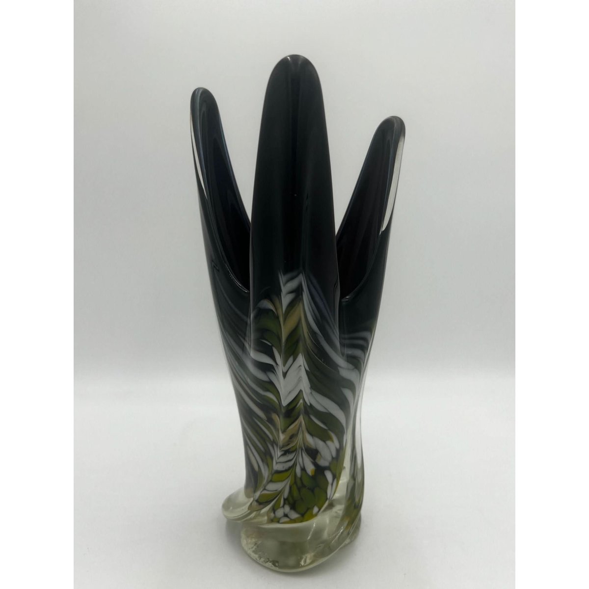 This beautiful hand blown glass vase features a unique 3 finger deep swung design with a twist base in a beautiful dark plum, green, white and yellow colour combination.