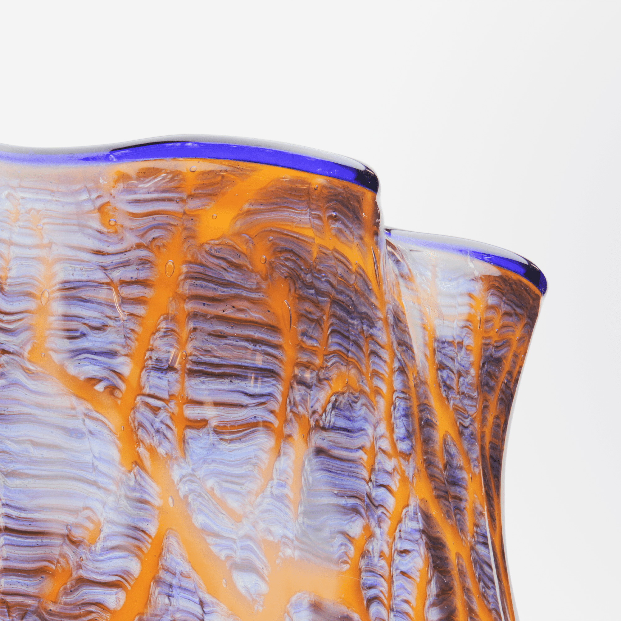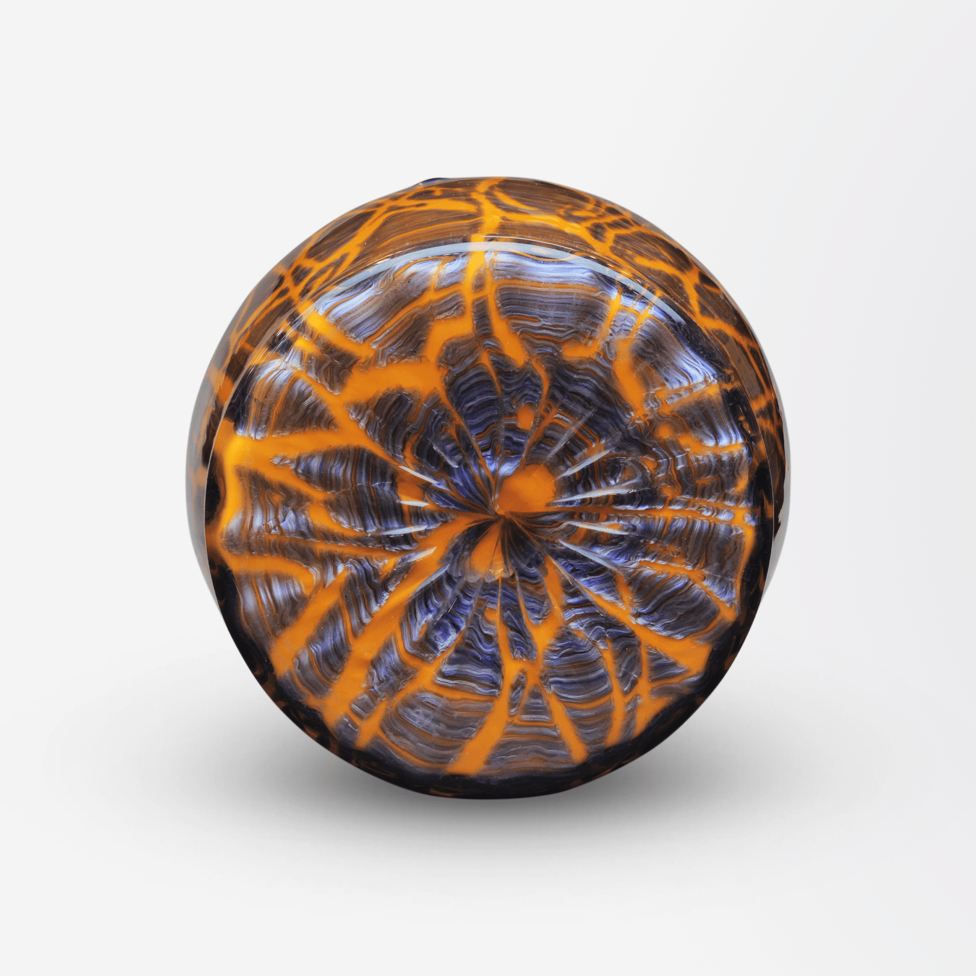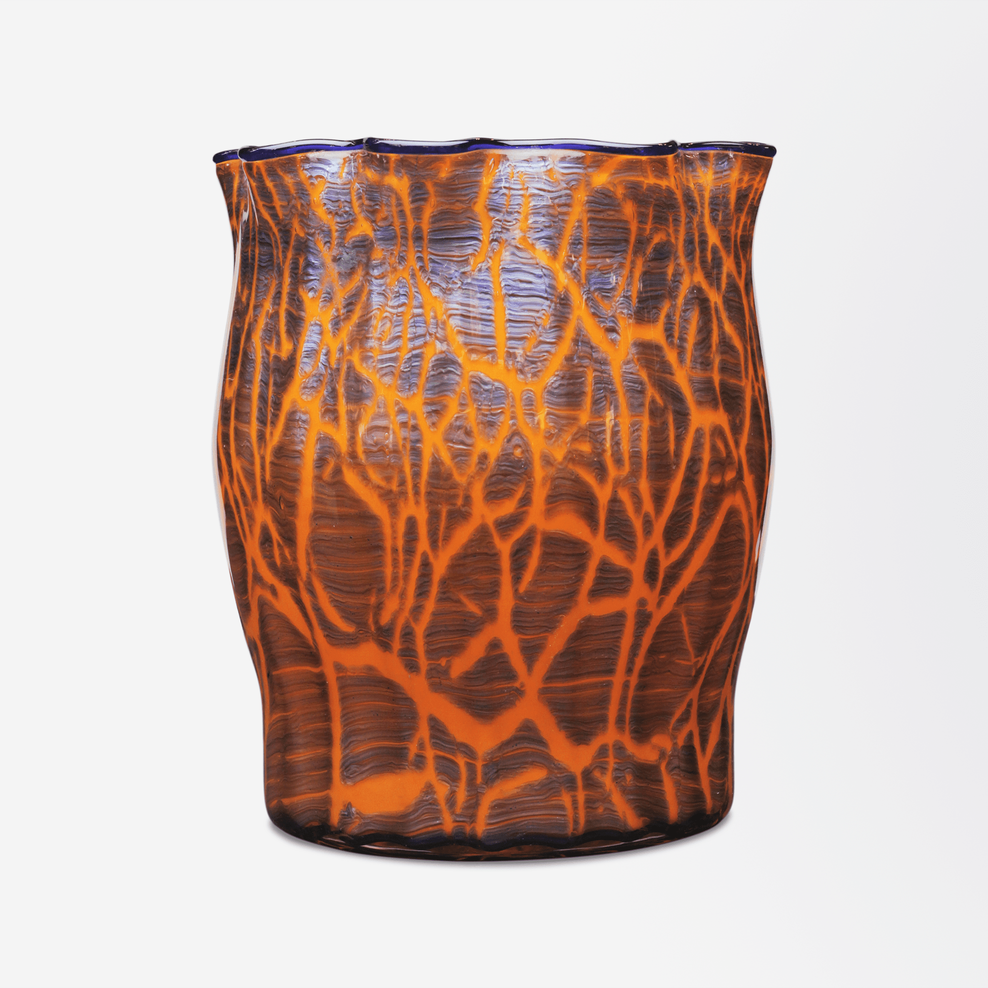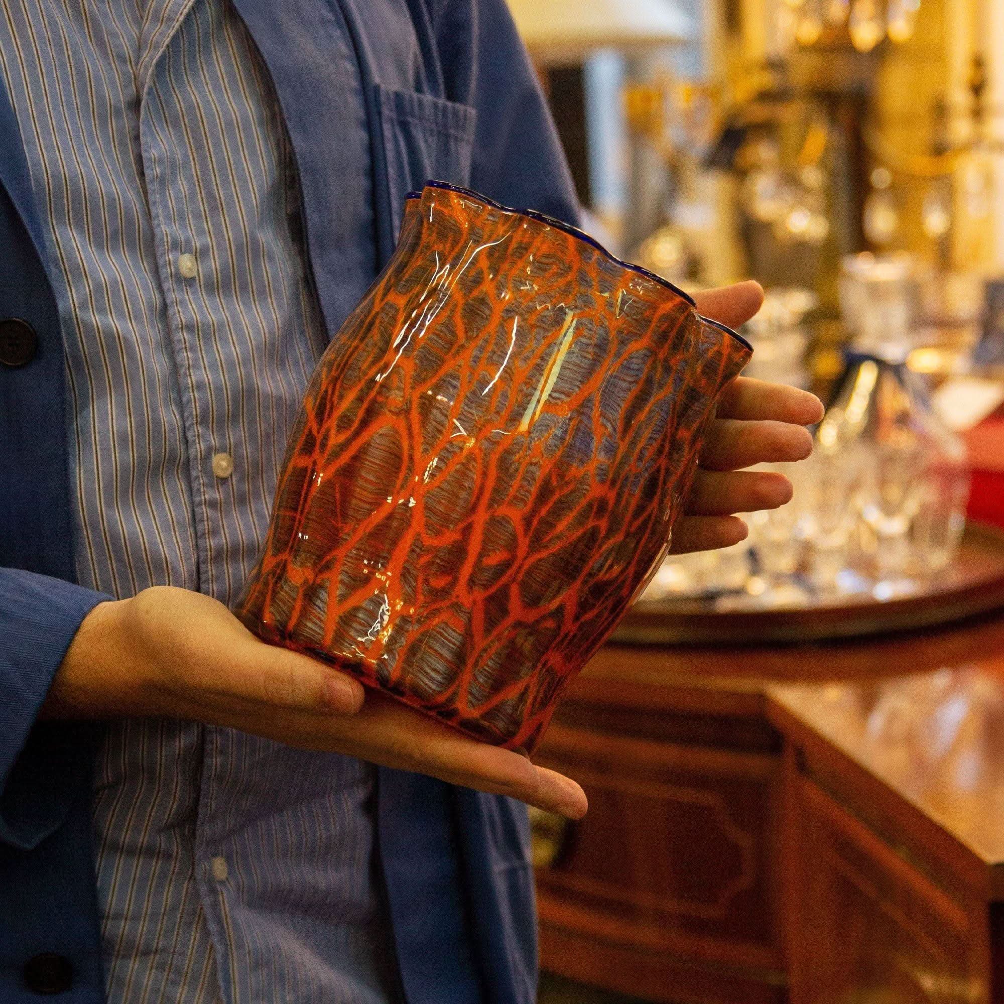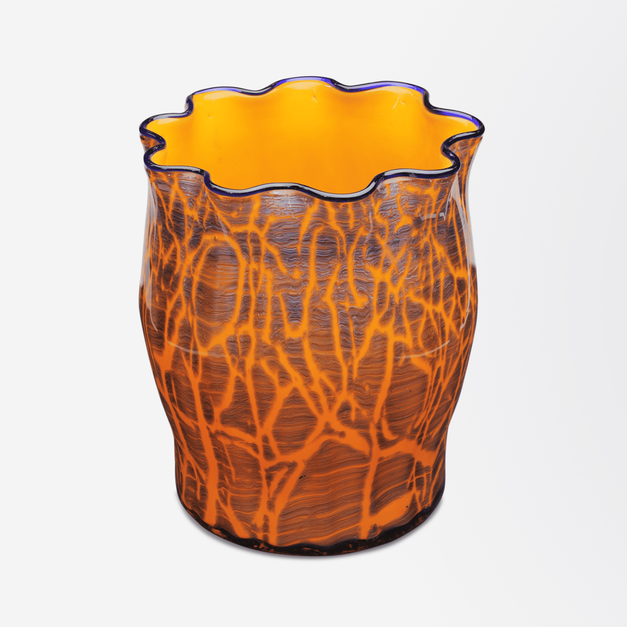 An unusual glass vase by Bohemian maker, Loetz. The orange vase has a fine layer of blue steel glass known as 'ausfuehrung 134', in a crackle effect over the orange. The top of the piece is finished with more blue and has a scalloped ruffle edge. The bottom of the vase features a ground snapped pontil mark which tells us the piece was handblown. This particular piece dates to between 1911 and 1935 and is one of the more unusual pieces which Loetz produced.