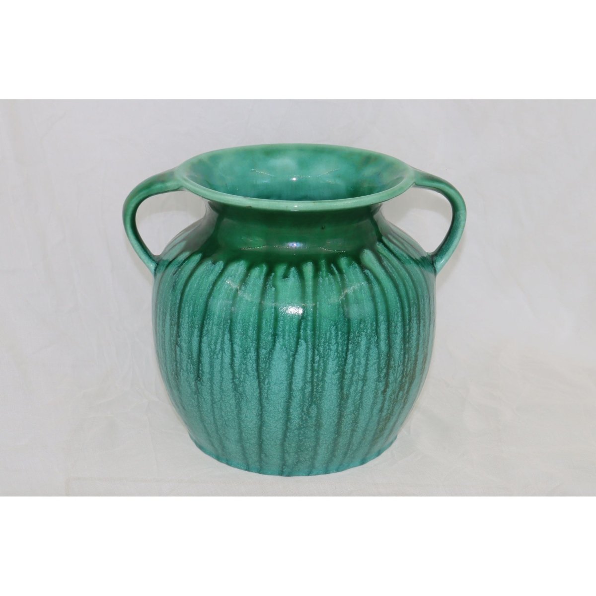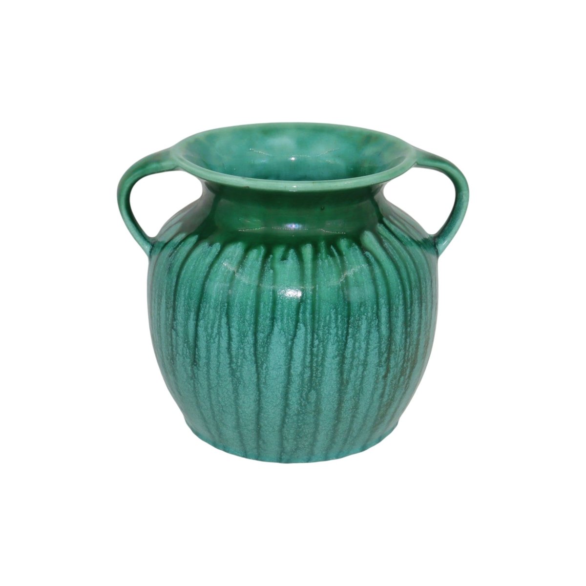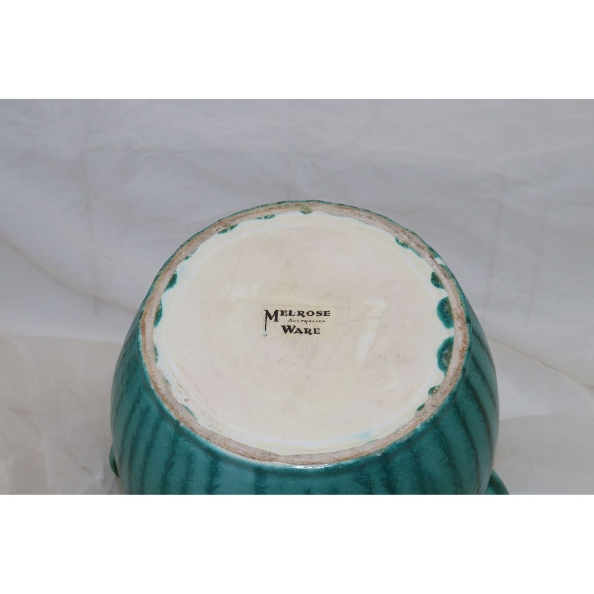 This large, rather striking Melrose vase with its three shades of green, has a glossy, smooth, slightly iridescent glaze to the top but as you progress to the bottom the texture becomes a more textured matte finish. Melrose, also known as Mel-Rose, was the name given to the art pottery range of the Hoffman Brick, Tile and Pottery Co. of Brunswick in Melbourne's north. The condition of the vase is very good with only some not particularly noticeable crazing and a couple of small glaze chips to the base to mar it, the largest chip being 5 mm x 2 mm. These chips are only visible when the vase is lifted up. The crack like marks on the base are crazing. Its height is 225 mm, the diameter is 215 mm and it dates from the 1930`s.
