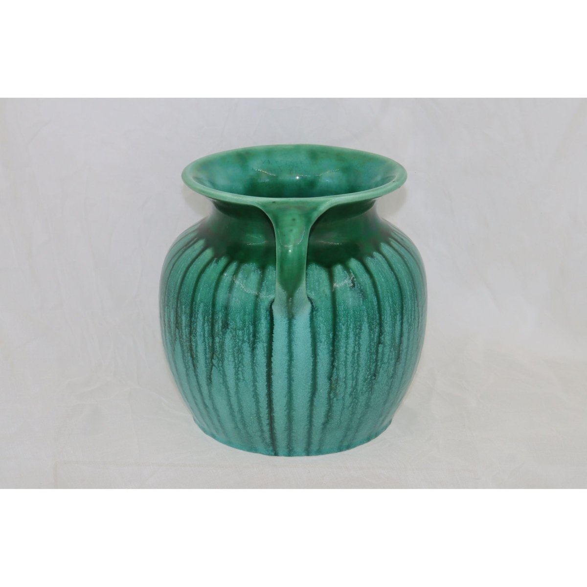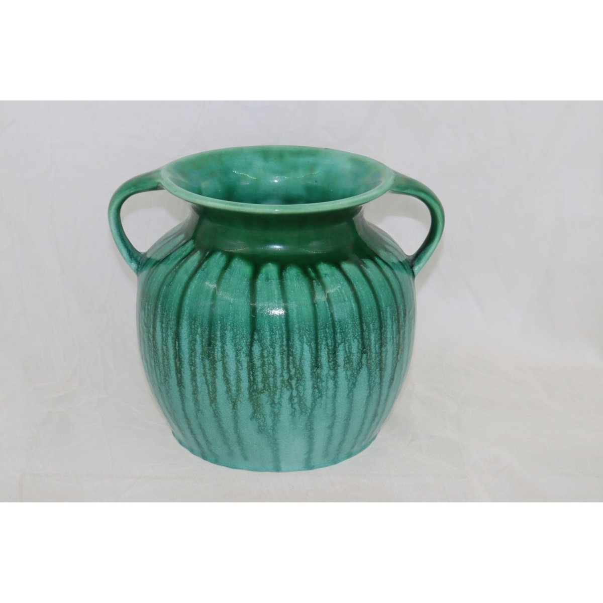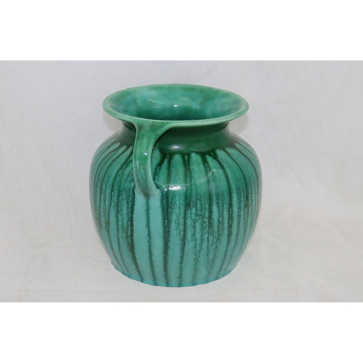 This large, rather striking Melrose vase with its three shades of green, has a glossy, smooth, slightly iridescent glaze to the top but as you progress to the bottom the texture becomes a more textured matte finish. Melrose, also known as Mel-Rose, was the name given to the art pottery range of the Hoffman Brick, Tile and Pottery Co. of Brunswick in Melbourne's north. The condition of the vase is very good with only some not particularly noticeable crazing and a couple of small glaze chips to the base to mar it, the largest chip being 5 mm x 2 mm. These chips are only visible when the vase is lifted up. The crack like marks on the base are crazing. Its height is 225 mm, the diameter is 215 mm and it dates from the 1930`s.
