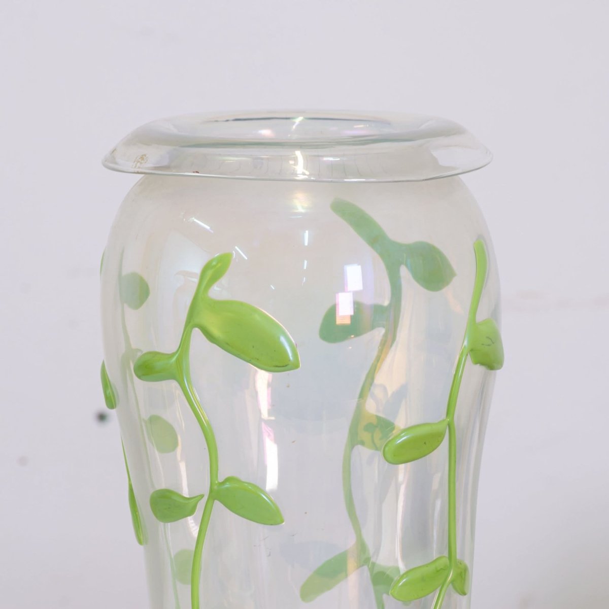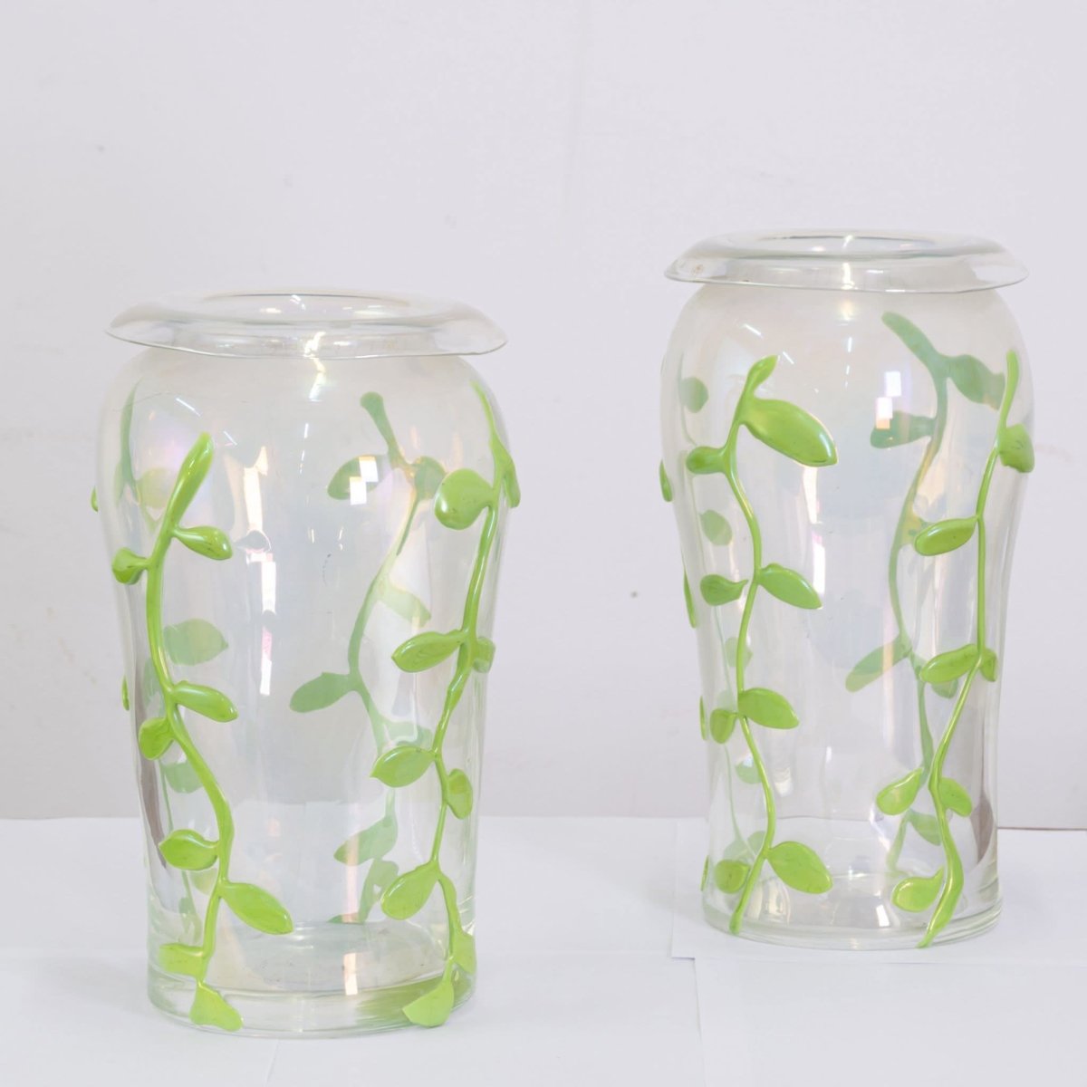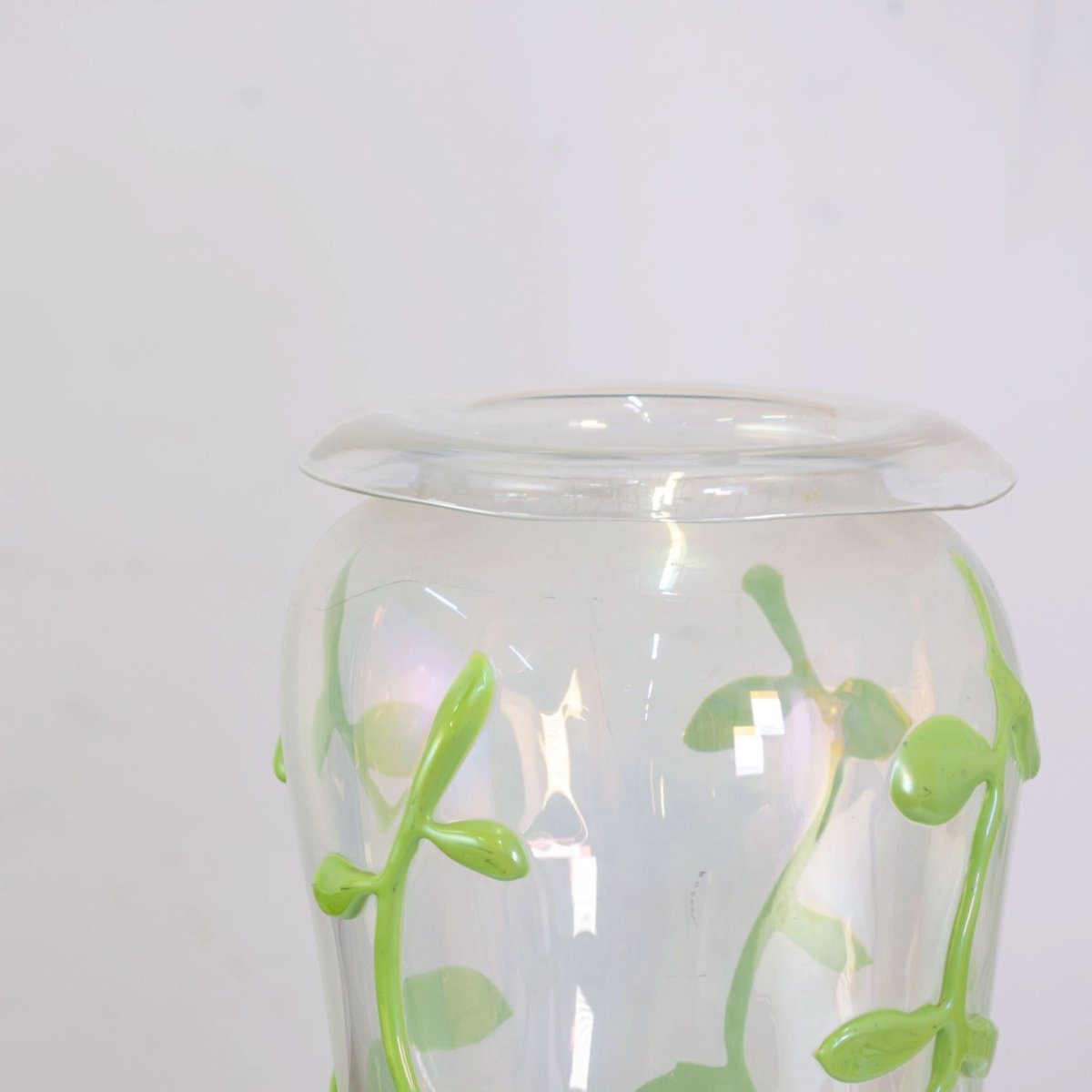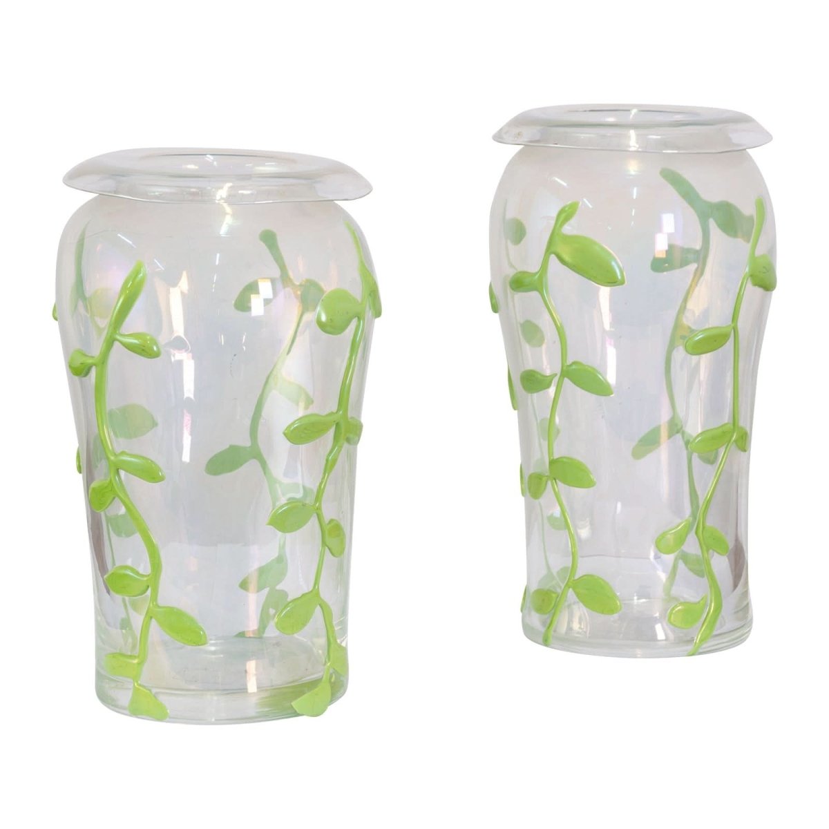 Pair of Iridescent Murano Vases with applied green leaves Murano, approx. 1970.