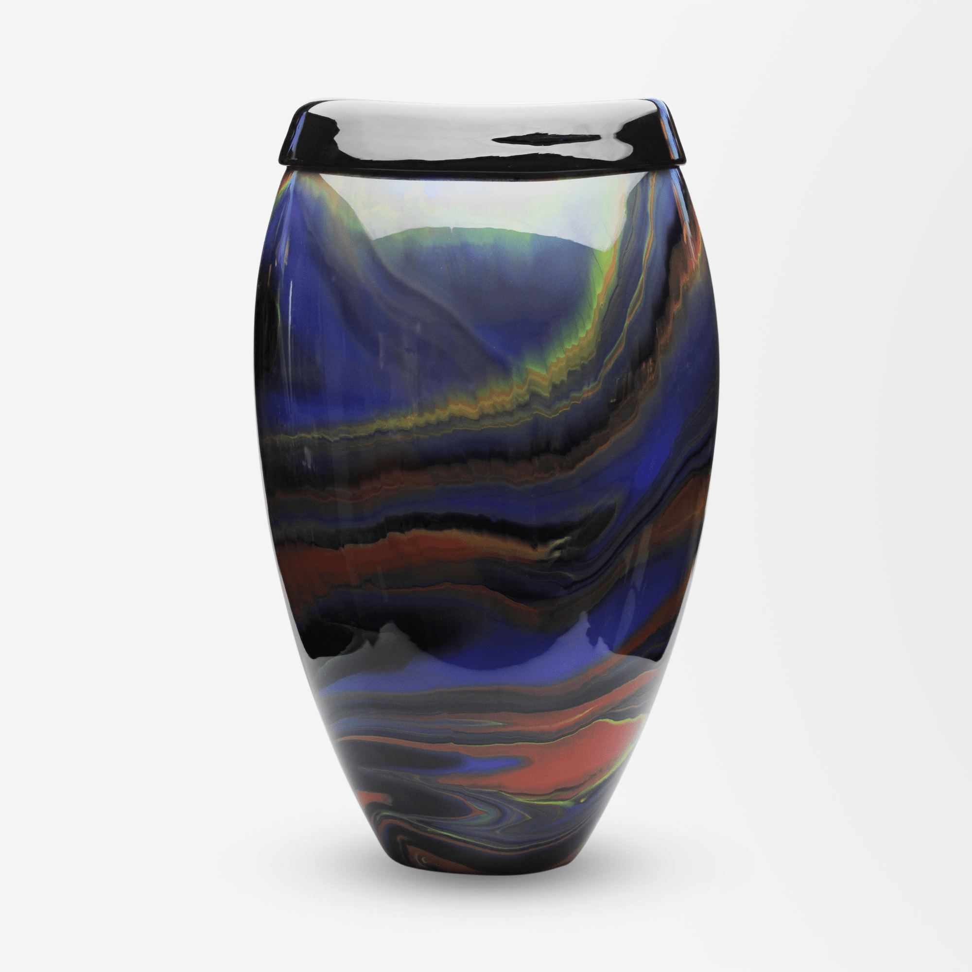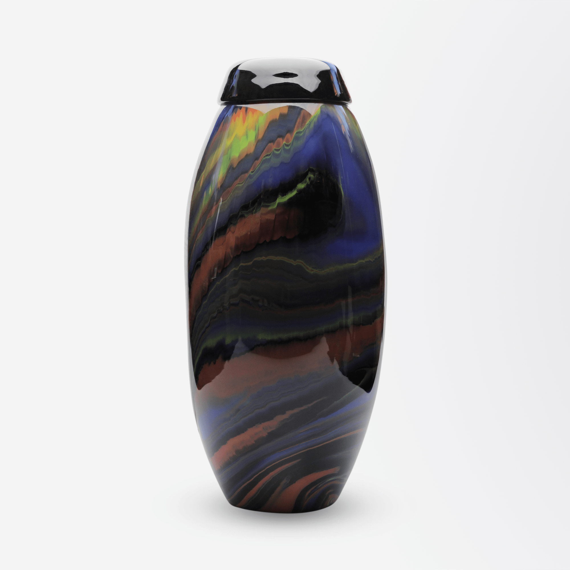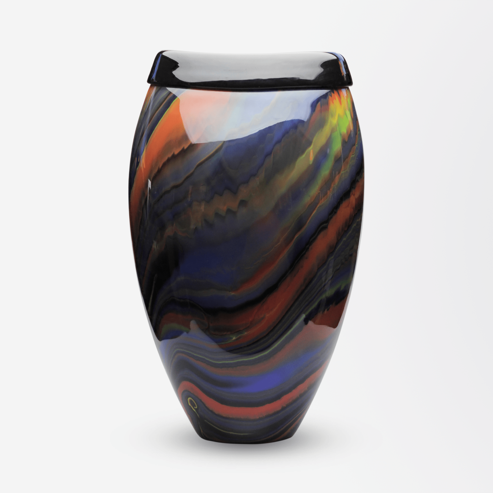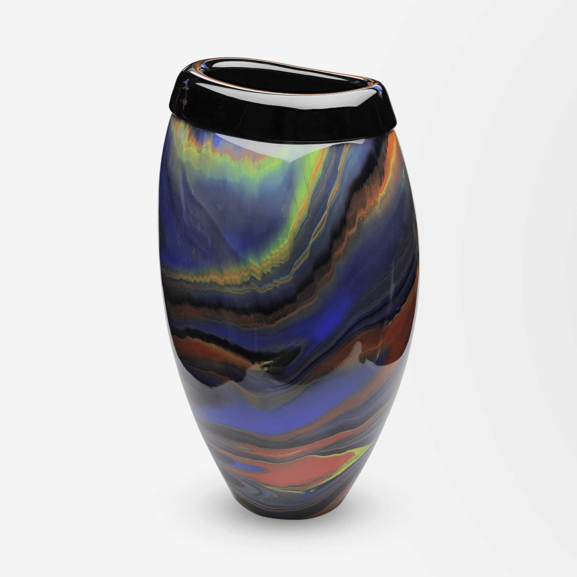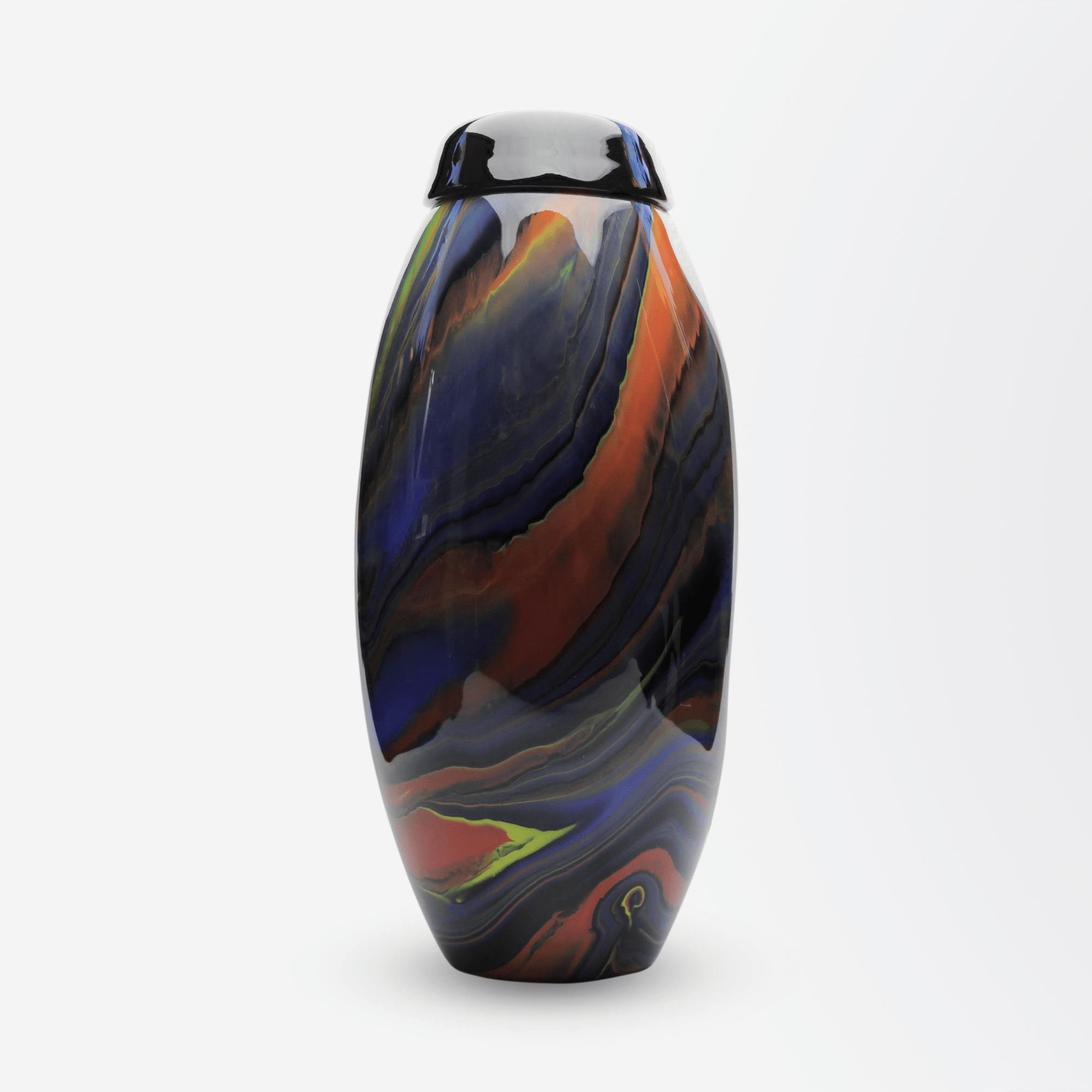 A beautiful hand blown marbled glass vase by Missoni, circa 1980. The freeform vase designed by Missoni has been executed by Arte Vetro Murano and is stamped to the underside to reflect both the designer and the manufacturer. The rainbow of colours has been marbled in a very distinctive Missoni style, with colour being a key feature in their designs of tableware, linen and clothing.