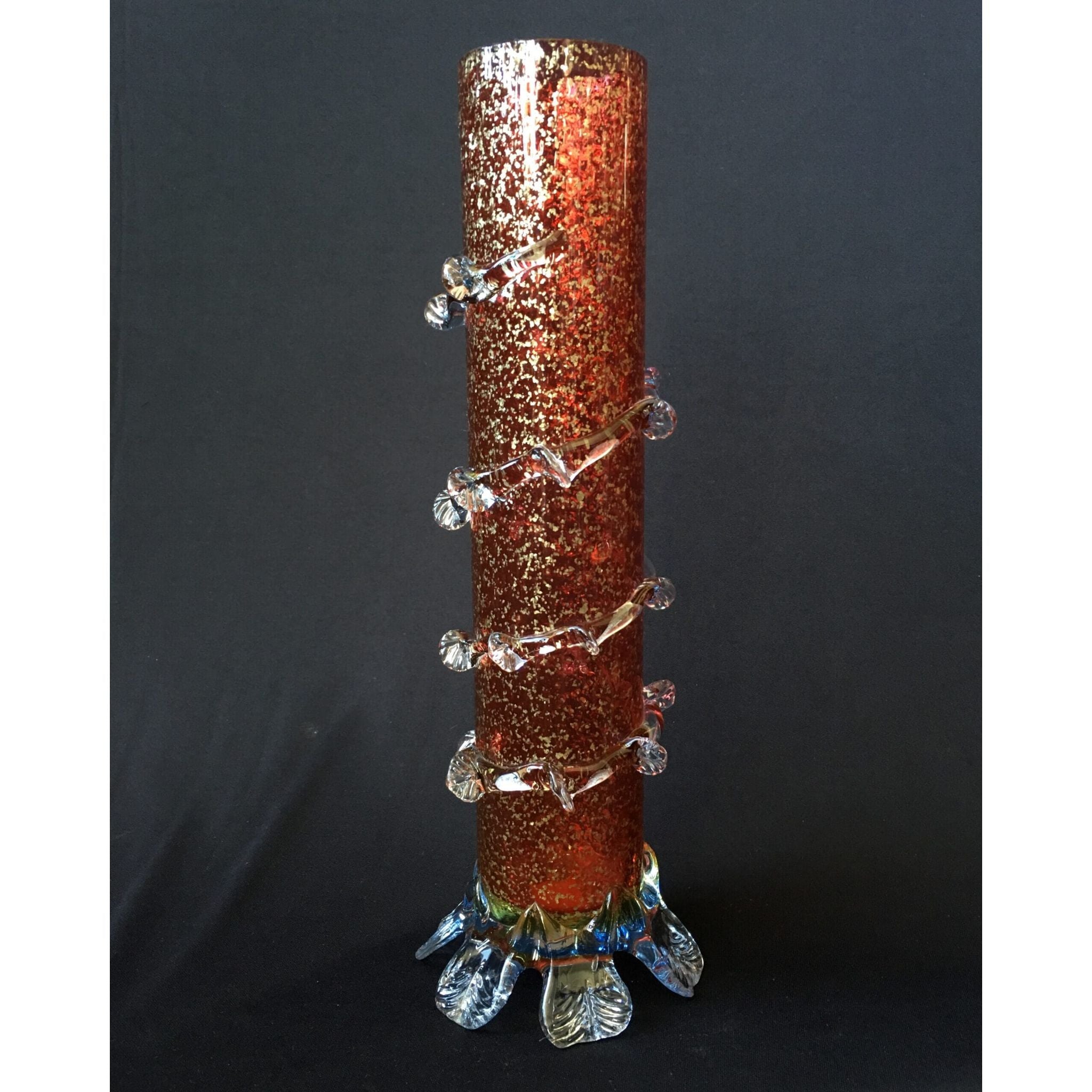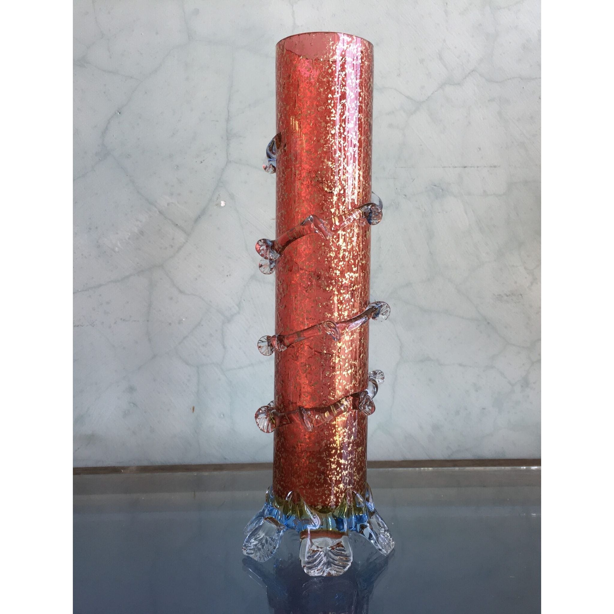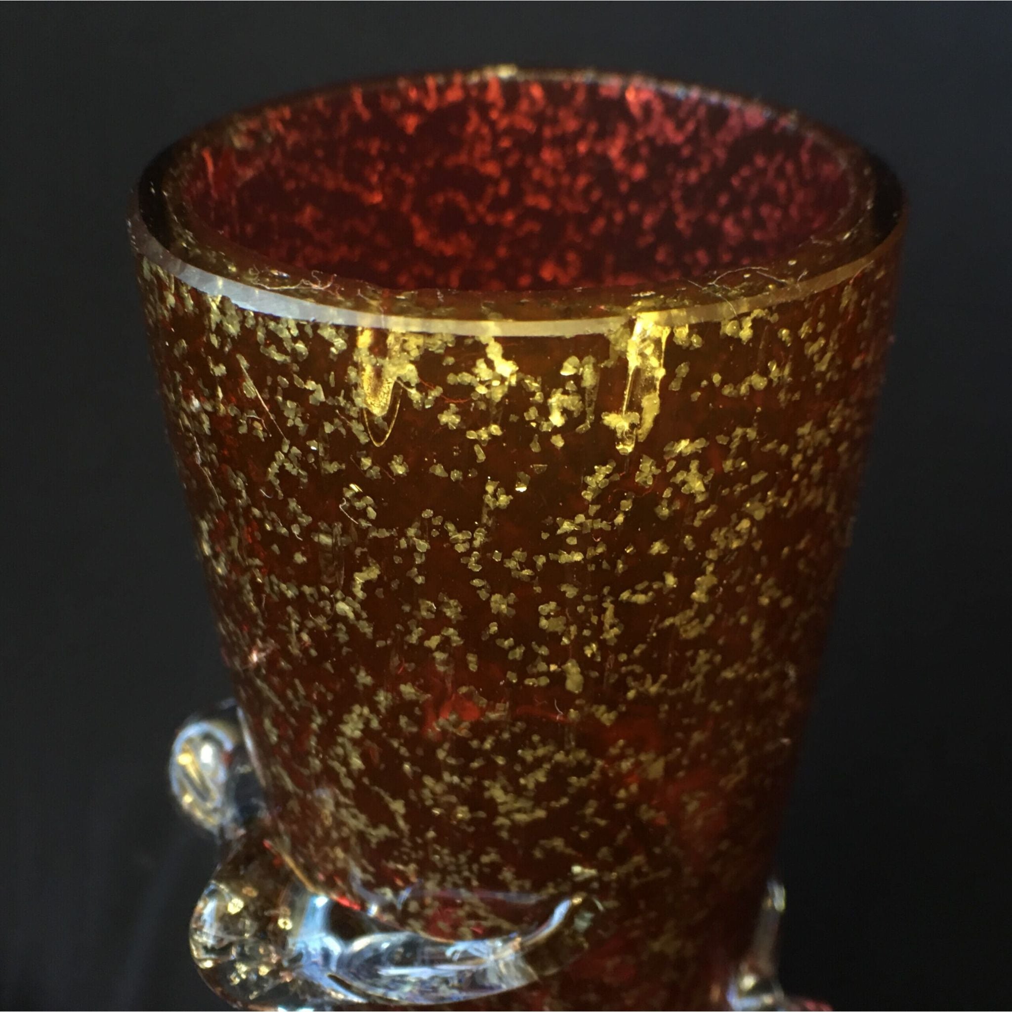 Tall cylinder ruby vase with pyrites inclusions, clear frill and feet. Circa 1890