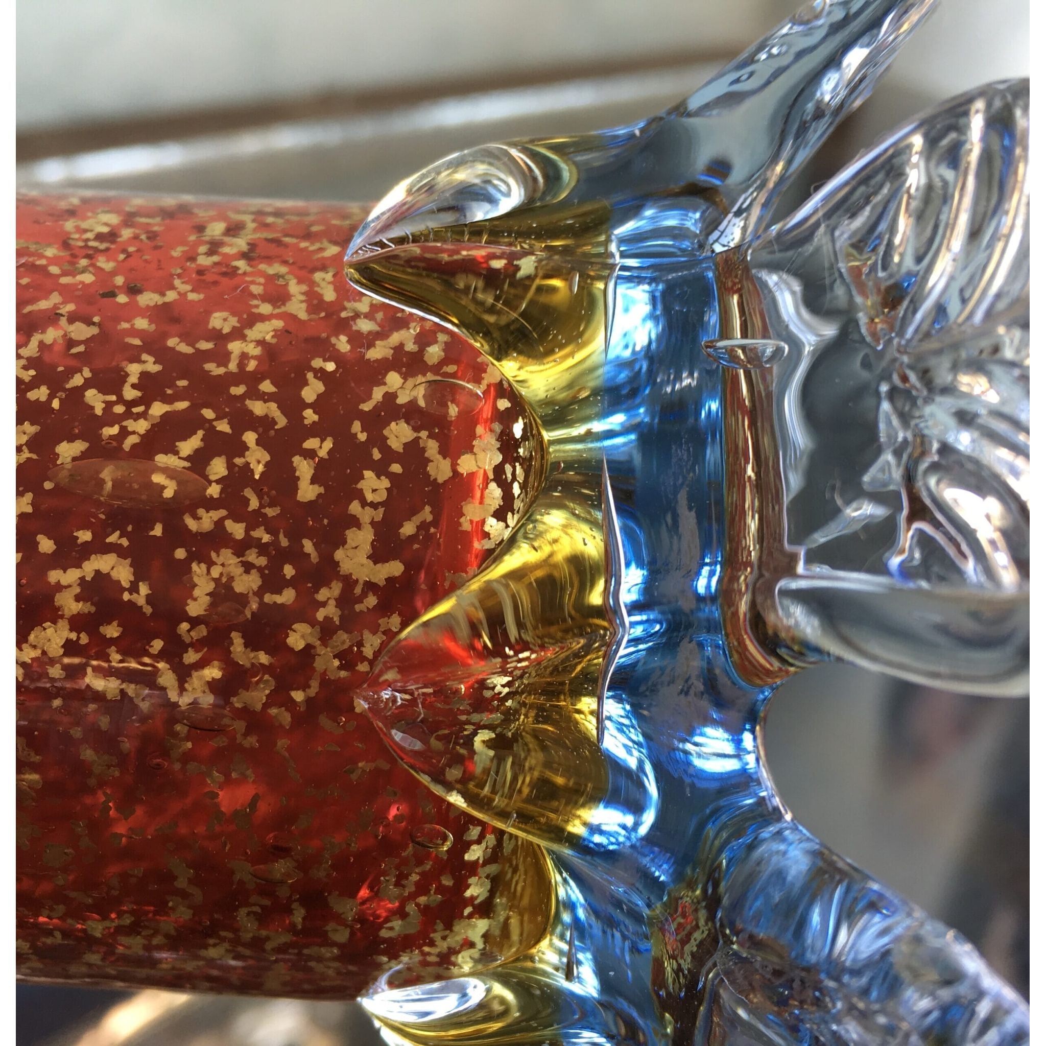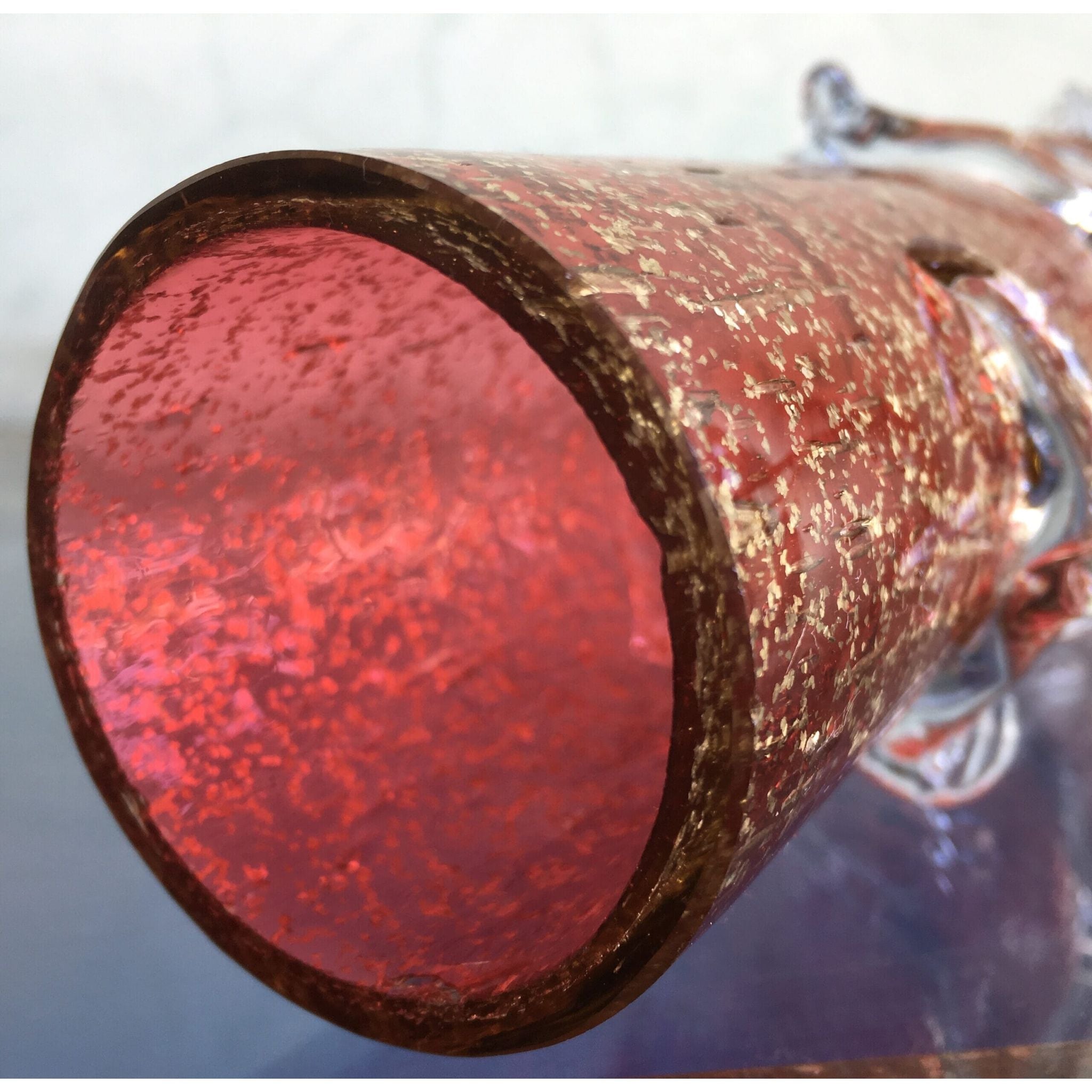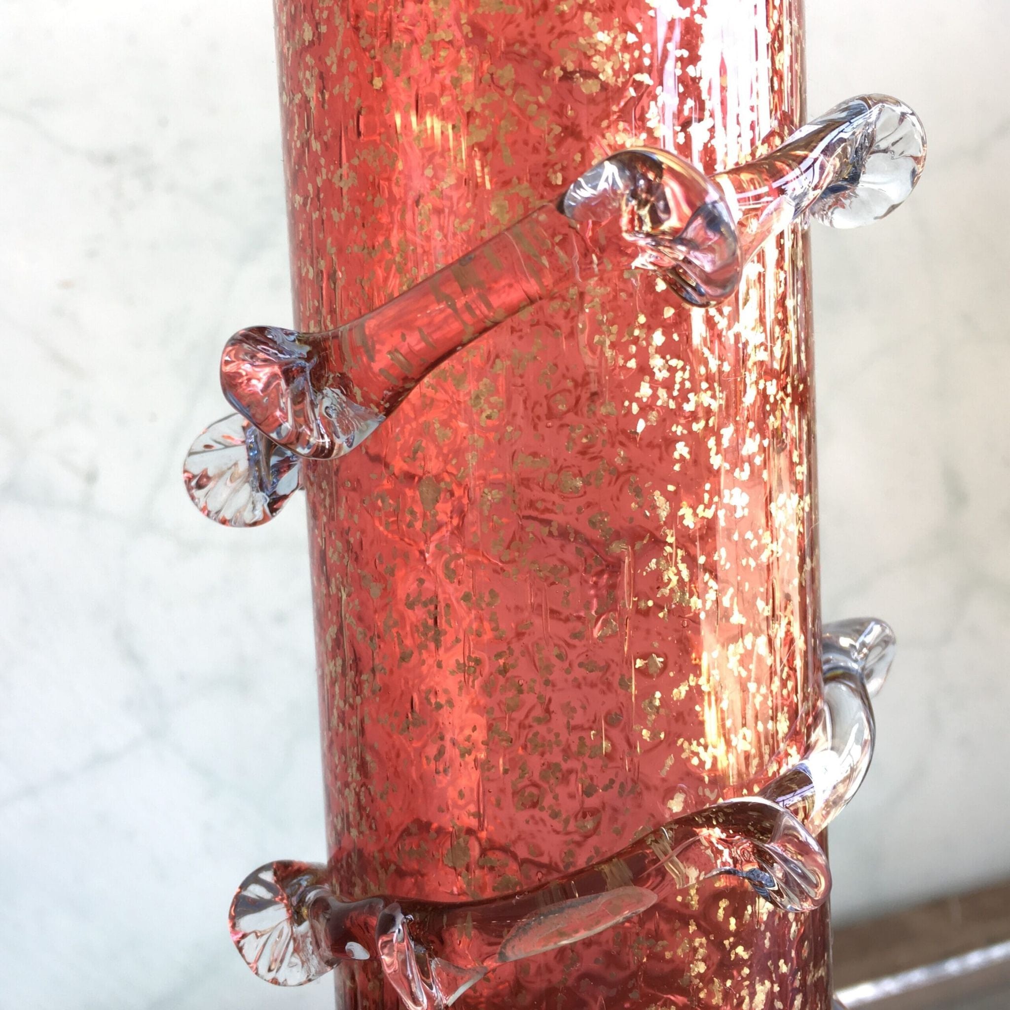 Tall cylinder ruby vase with pyrites inclusions, clear frill and feet. Circa 1890