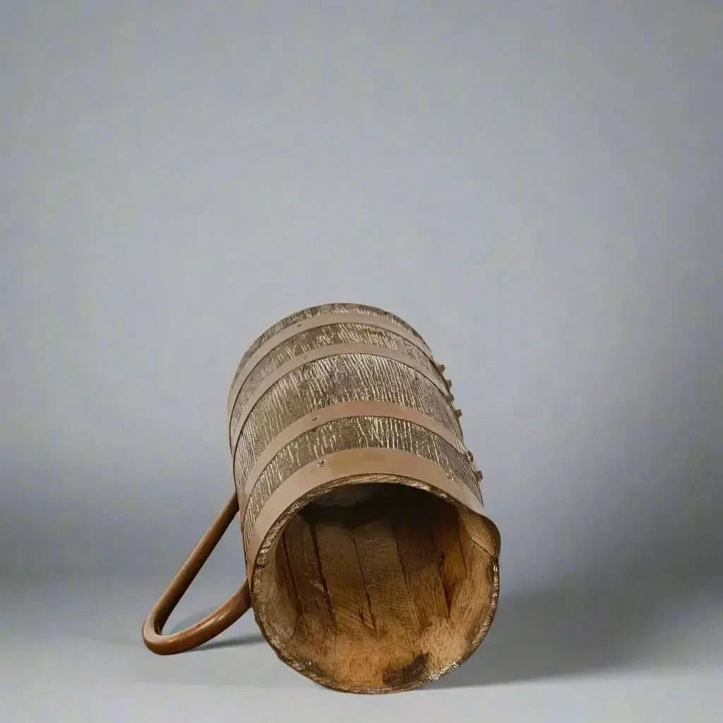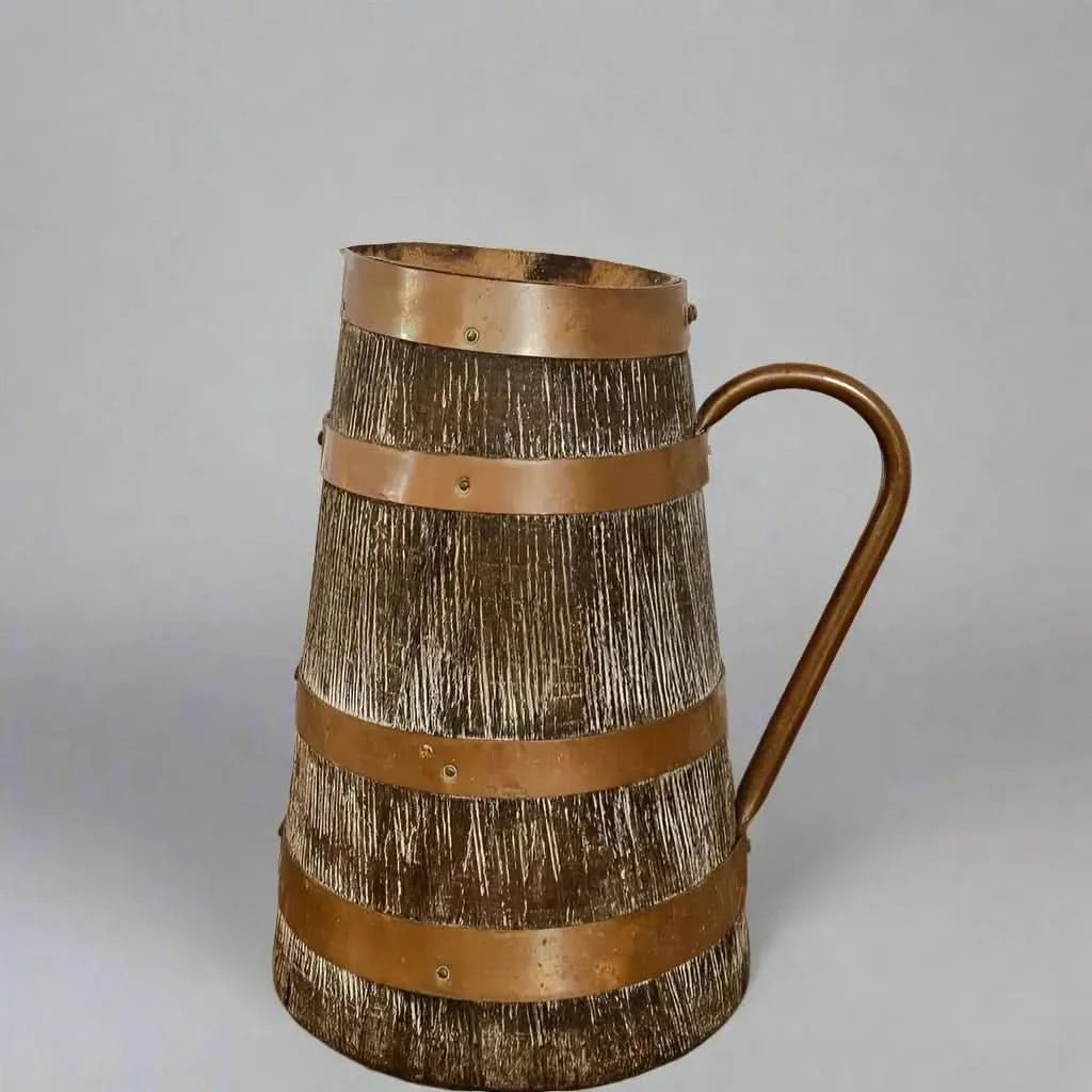 Discover the charm of our Vintage French Alsatian Wine Pitcher, crafted from wood and brass. Perfect for wine enthusiasts.