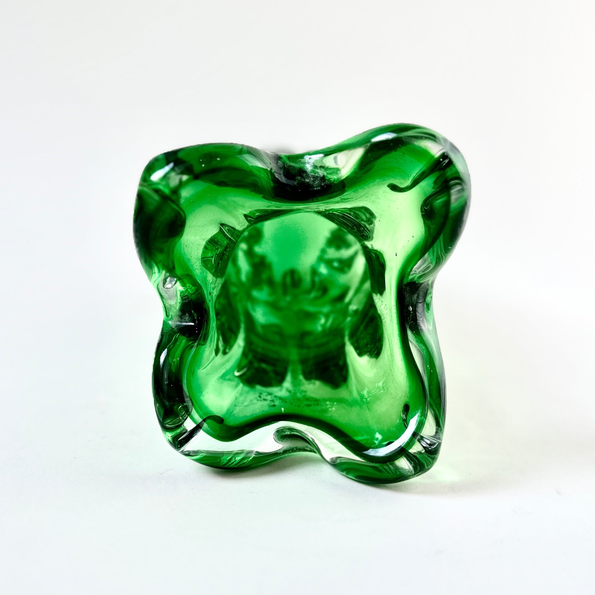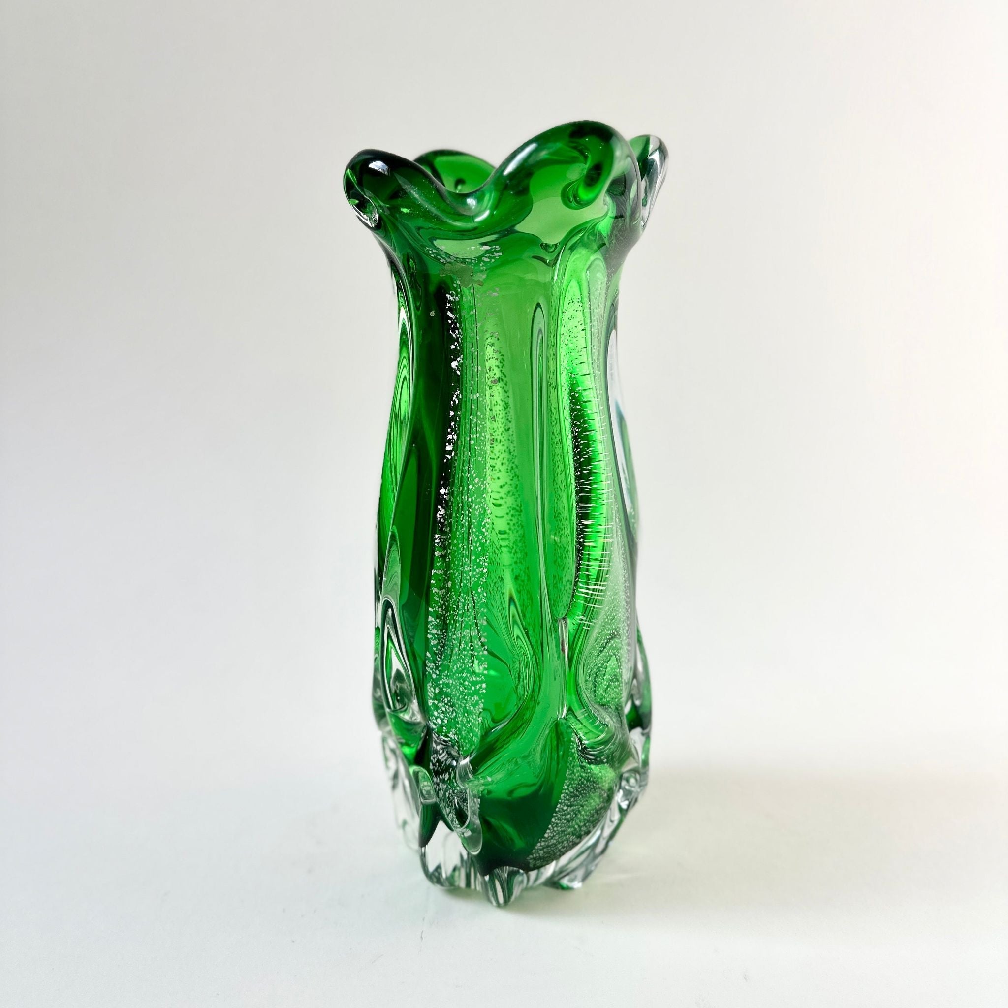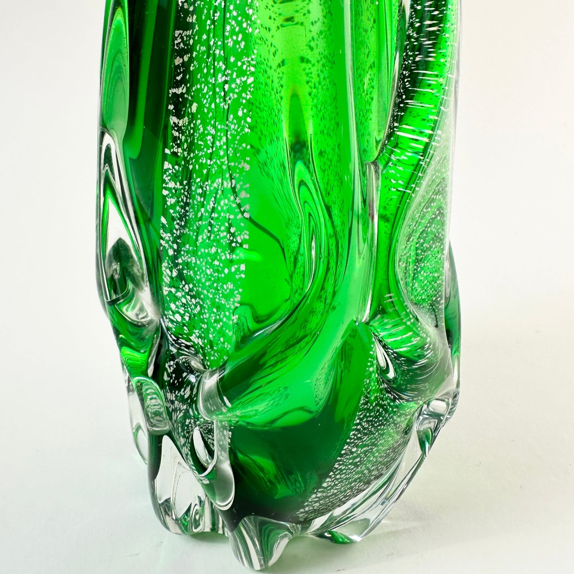 Discover a striking example of mid-century Japanese glass design with this emerald green Sanyu Glass vase, accented by shimmering silver leaf. Produced by the renowned Sanyu Glass Factory Ltd. of Osaka, Japan, this piece belongs to the celebrated Narumi Fantasy series and reflects the artistry that made Sanyu one of Japan’s most recognisable glass manufacturers of the 20th century.