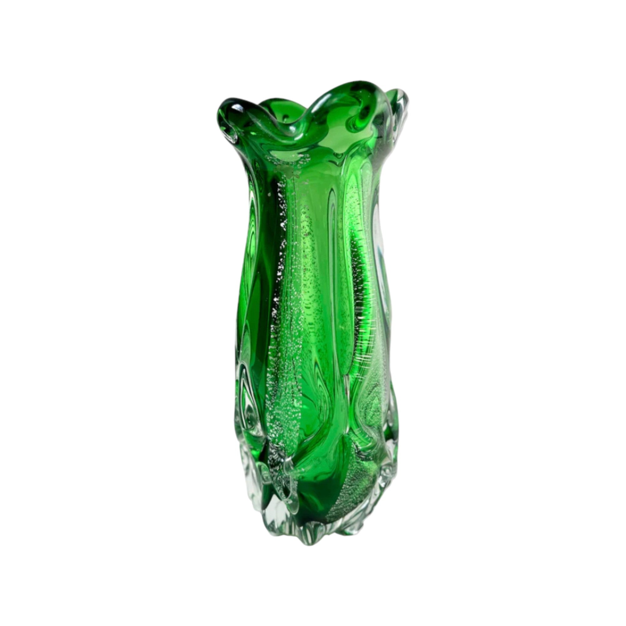 This vintage vase captures the elegance of Japanese modernist design with its tall cylindrical form, radiant green hue, and delicate layering of silver leaf within the glass. A timeless collectible, it works beautifully as a statement piece in both traditional and contemporary interiors.