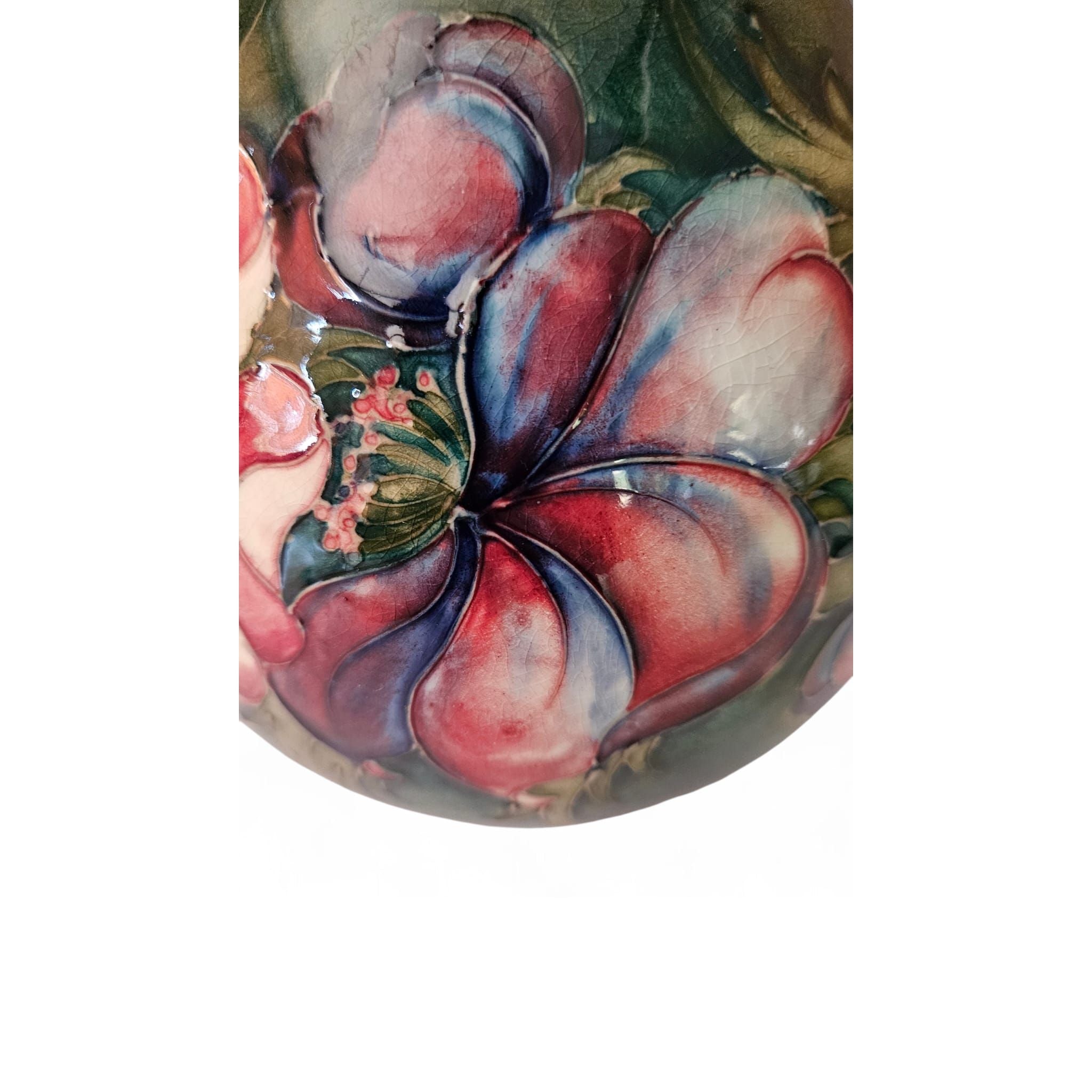 It is a classic example of Moorcroft pottery, known for its distinctive tube-lining technique and vibrant glazes.