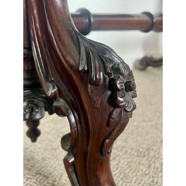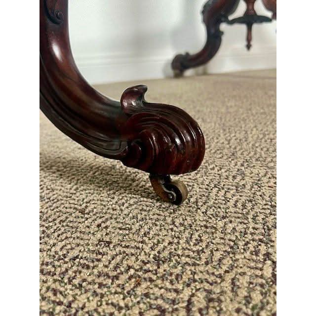 The legs are full height and brace the central support columns then at the bottom change into typical shaped French cabriole legs with raised carvings on the knees of flowers and leaves. There are also French ‘C’ shaped scrolls at the rear of the legs and upward scrolled toes which have the original all brass castor assemblies beneath. The vertical columns are connected by a turned stretcher which is embellished by central opposed stylised Tulip turnings.