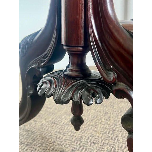 The top is understated so not to distract from whatever may be displayed upon it however it shows its quality in a refined way with its symmetrical serpentine form with a lamb tongue edge molding. The shallow apron follows the shape of the top and has a lower cock bead molding. The table top is supported by end positioned cylindrical columns which terminate at the base with carved stylised leaf circular flanges with inverted finials beneath.