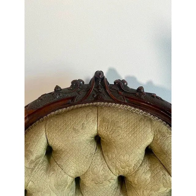 Condition: The frame and polish are excellent. The upholstery springs webbing and stitched rolled edges are also excellent. The fabric cover is very good and may be easily recovered to taste.