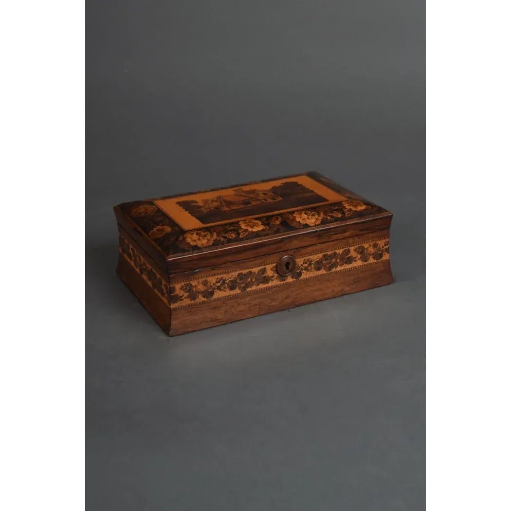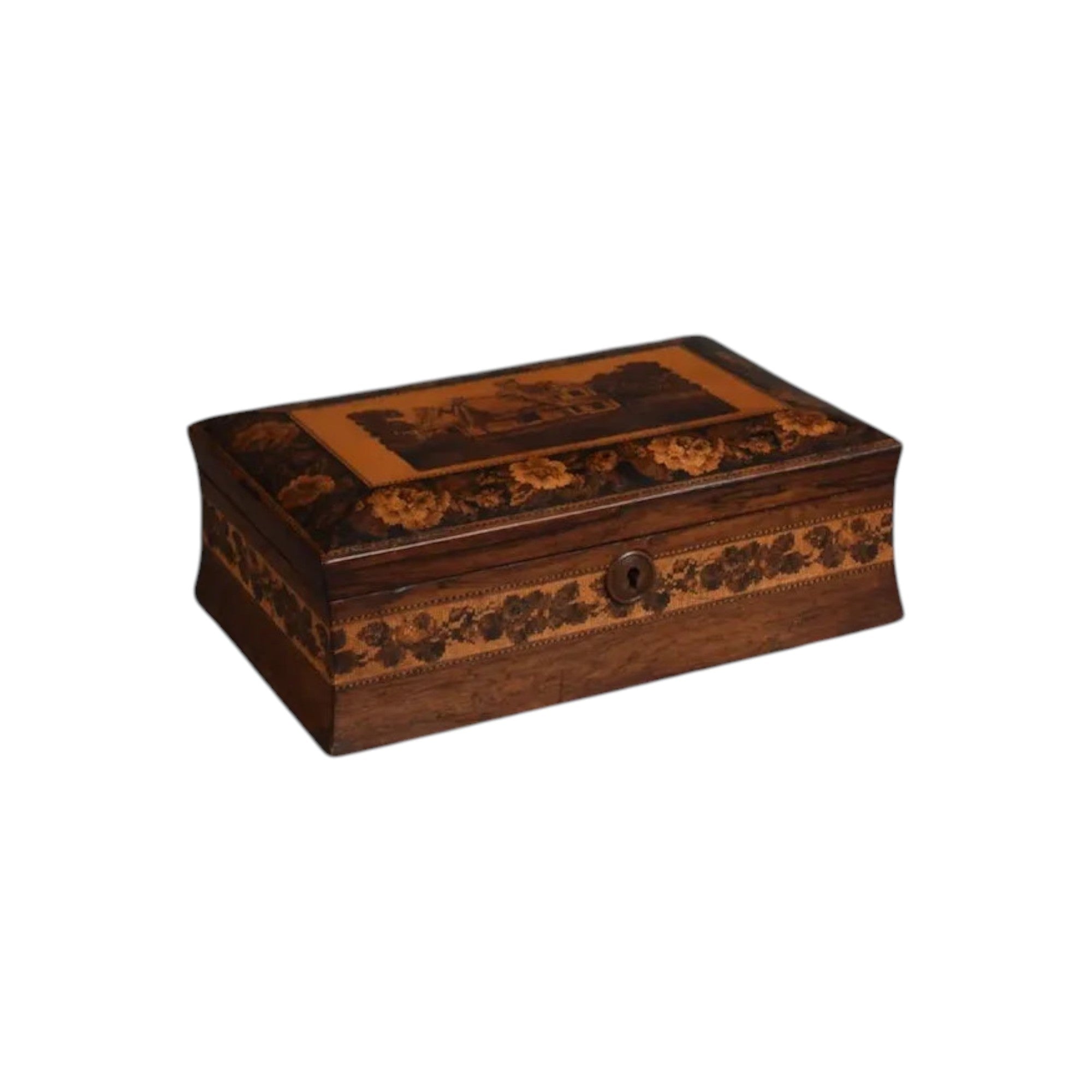 An exquisite of a quality andgenuine antique English 19th Century Victorian Period Tunbridge ‘Micro Mosaic’ parquetry lidded wooden box with unusual slightly concave sides.