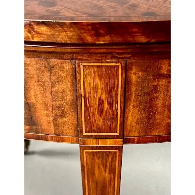 The serpentine shaped top has a curved edge molding plus a double feature lower applied carved molding. When the top swivels it reveals an internal storage ares for cards and game pieces within the frieze section and when laid flat reveals the inset baize lined inset playing surface with a broard Walnut border.