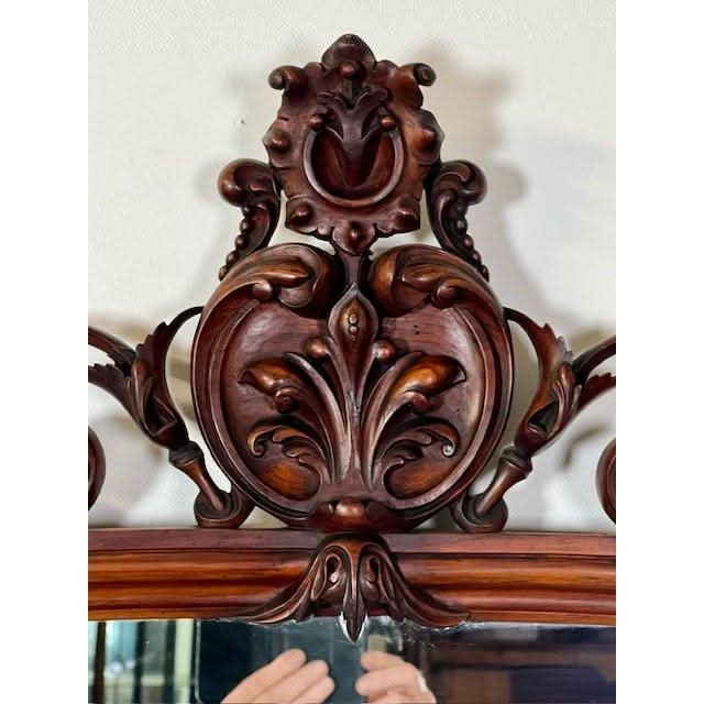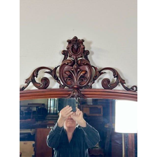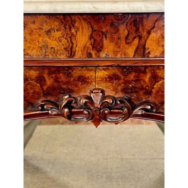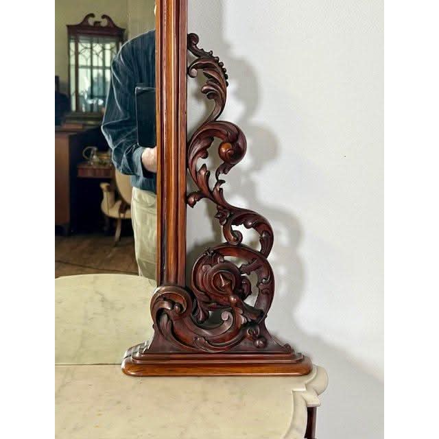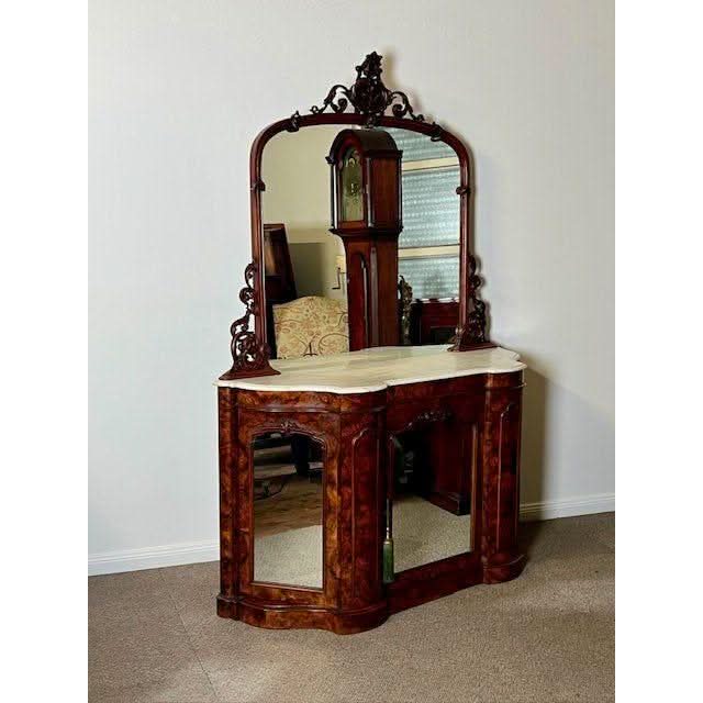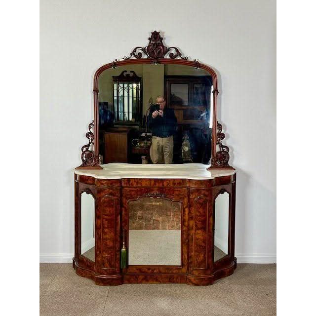 This is a lovely example of a high quality genuine antique English Victorian mirror back marble top Credenza with an elegent tall solid Walnut beautifully carved mirror frame a shaped white Carrara marble top with a molded edge and a shaped base finished in the finest selected Walnut of lovely colour and beautiful figuring. The style is an English adaption of the popular French Louis XV style.